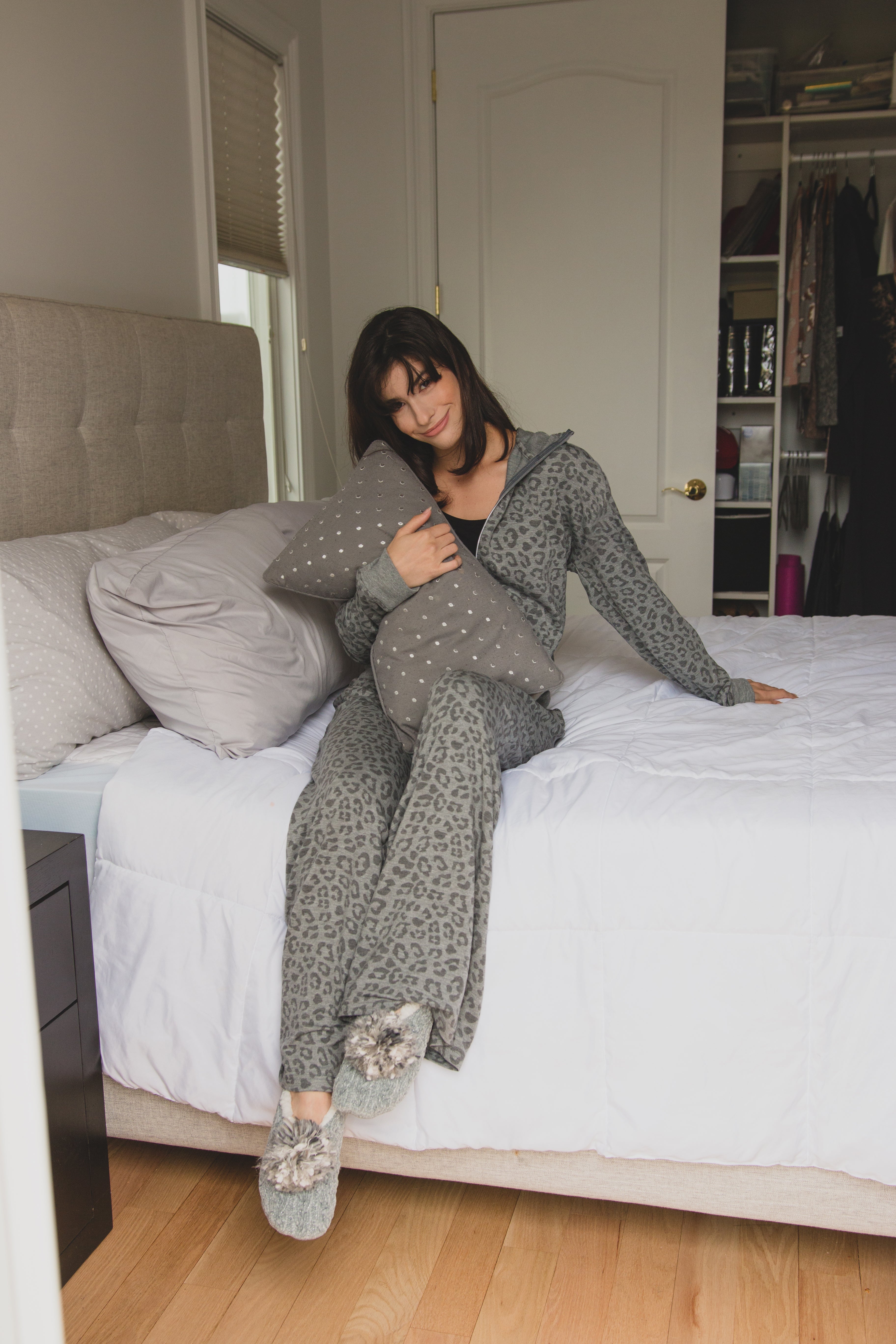 This leopard patterned zip hoodie brings comfy and cozy to a whole new level. Made of soft french terry cloth, this tonal heather grey leopard garment is a must have piece for all your lounging needs. Relax and look cute while doing it! Pair with our lounge pants or shorts for a matching ensemble.