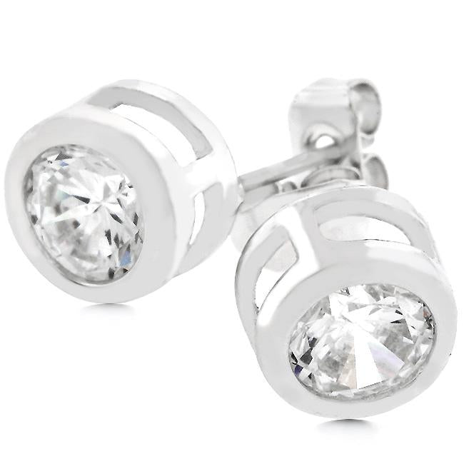 Simple studs fashioned in a bezel setting-- a great modern take on the womans must-have earring. Our genuine rhodium finish is achieved using an electroplating process that coats the item with heavy layers of rhodium a close cousin to platinum which gives our jewelry a platinum luster.