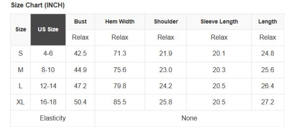 See size chart for approximate measurements.