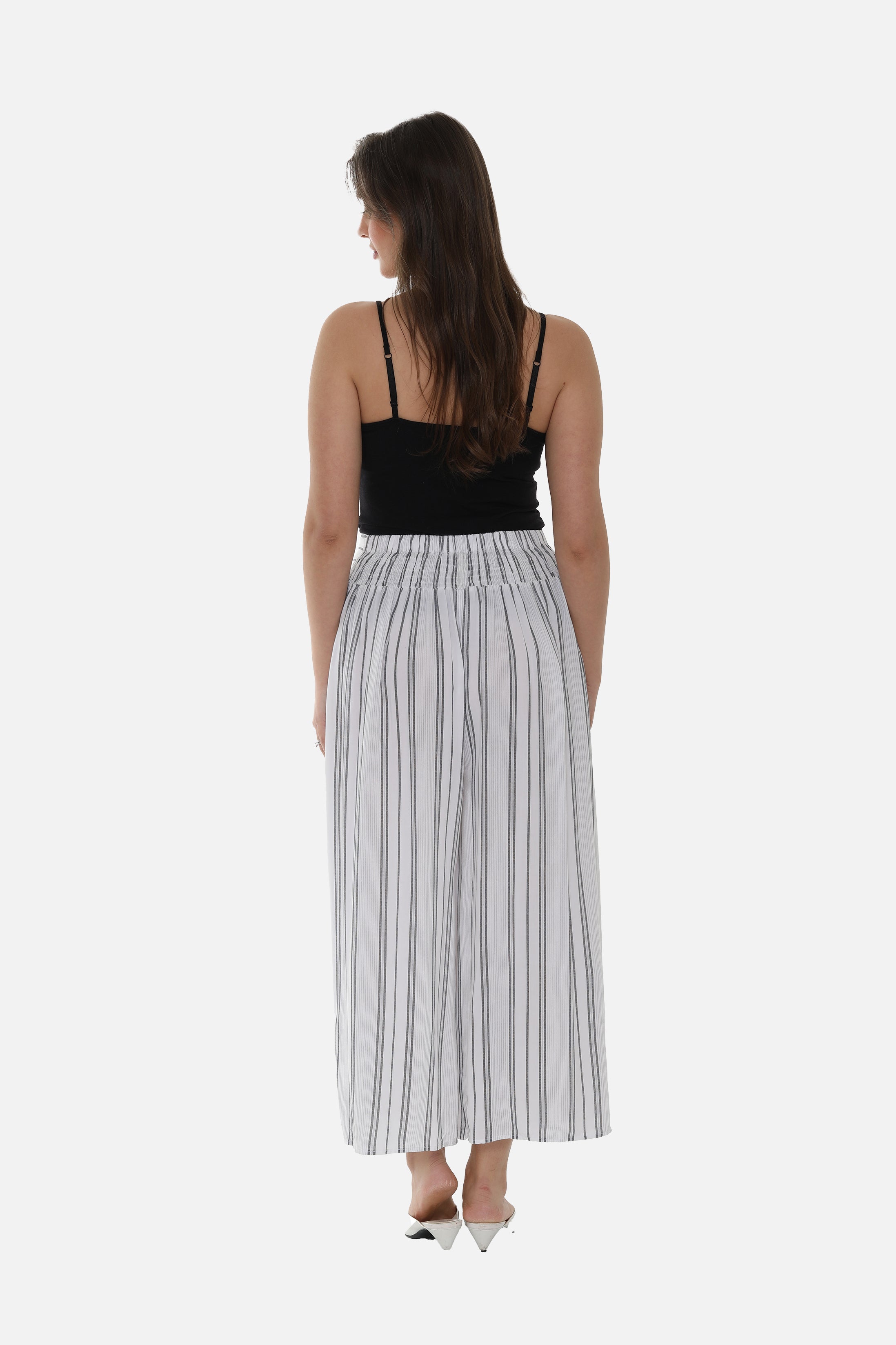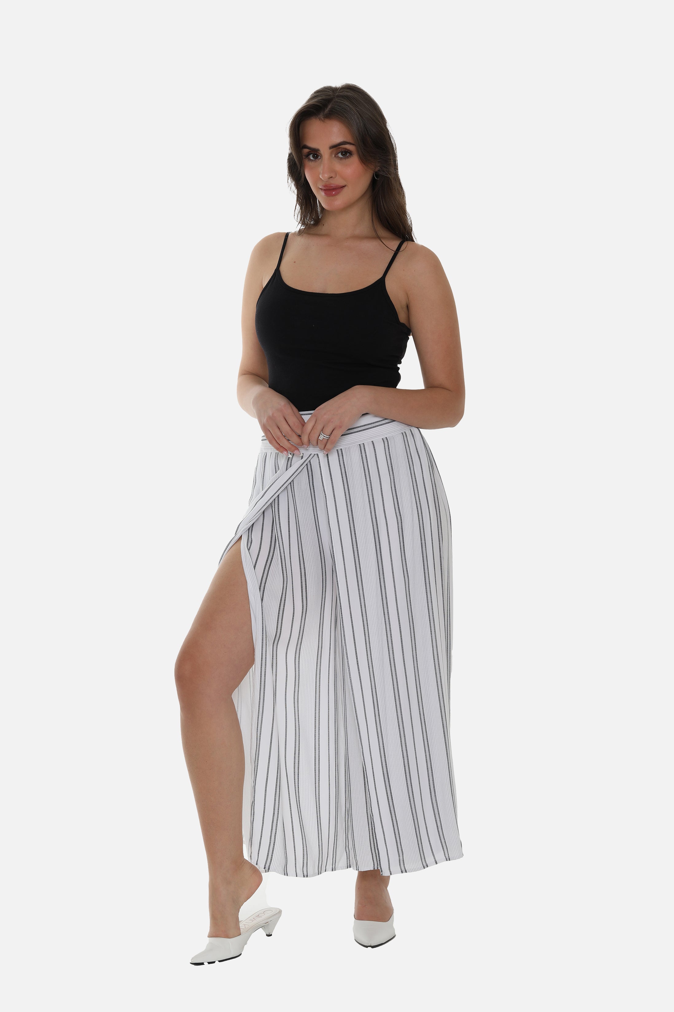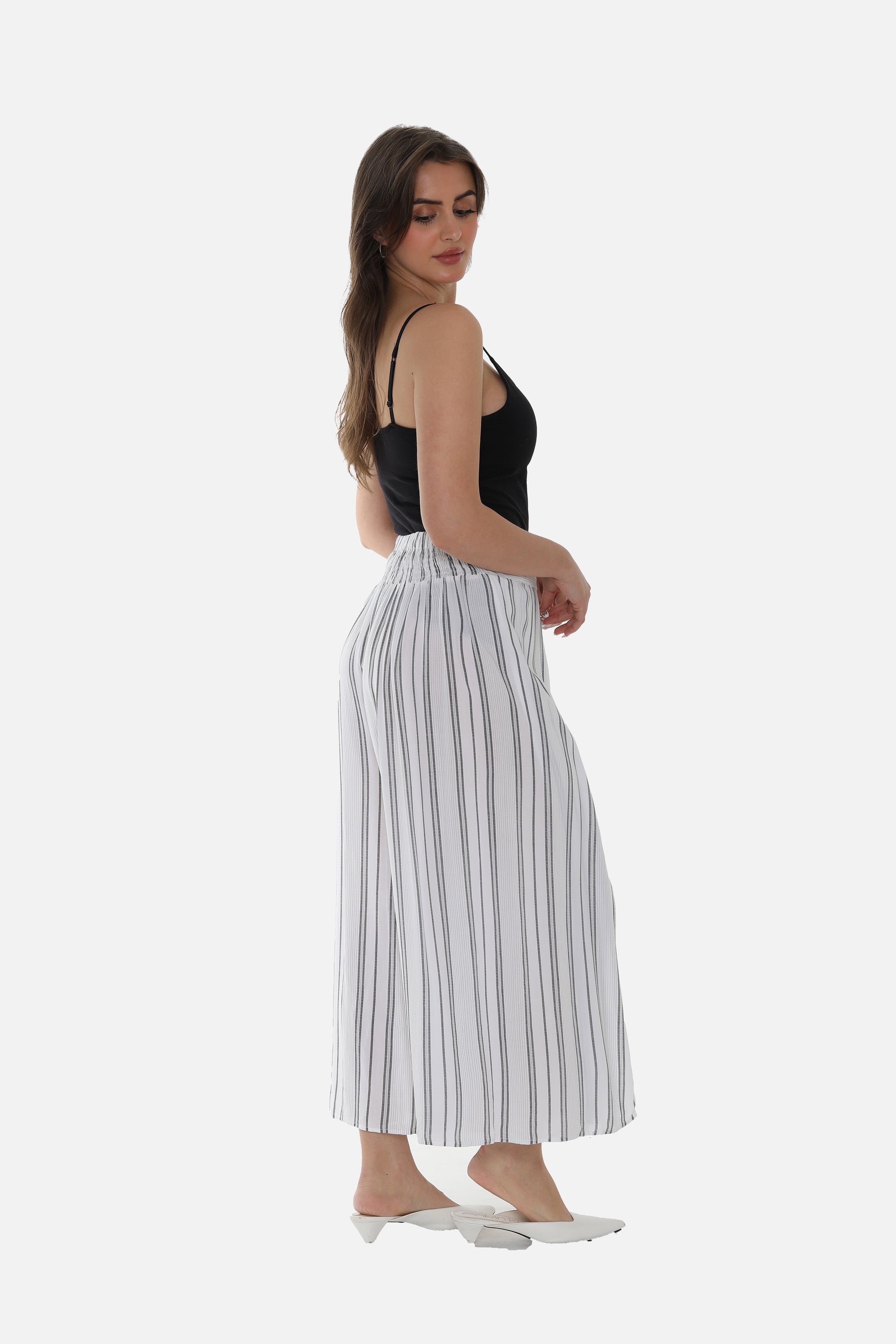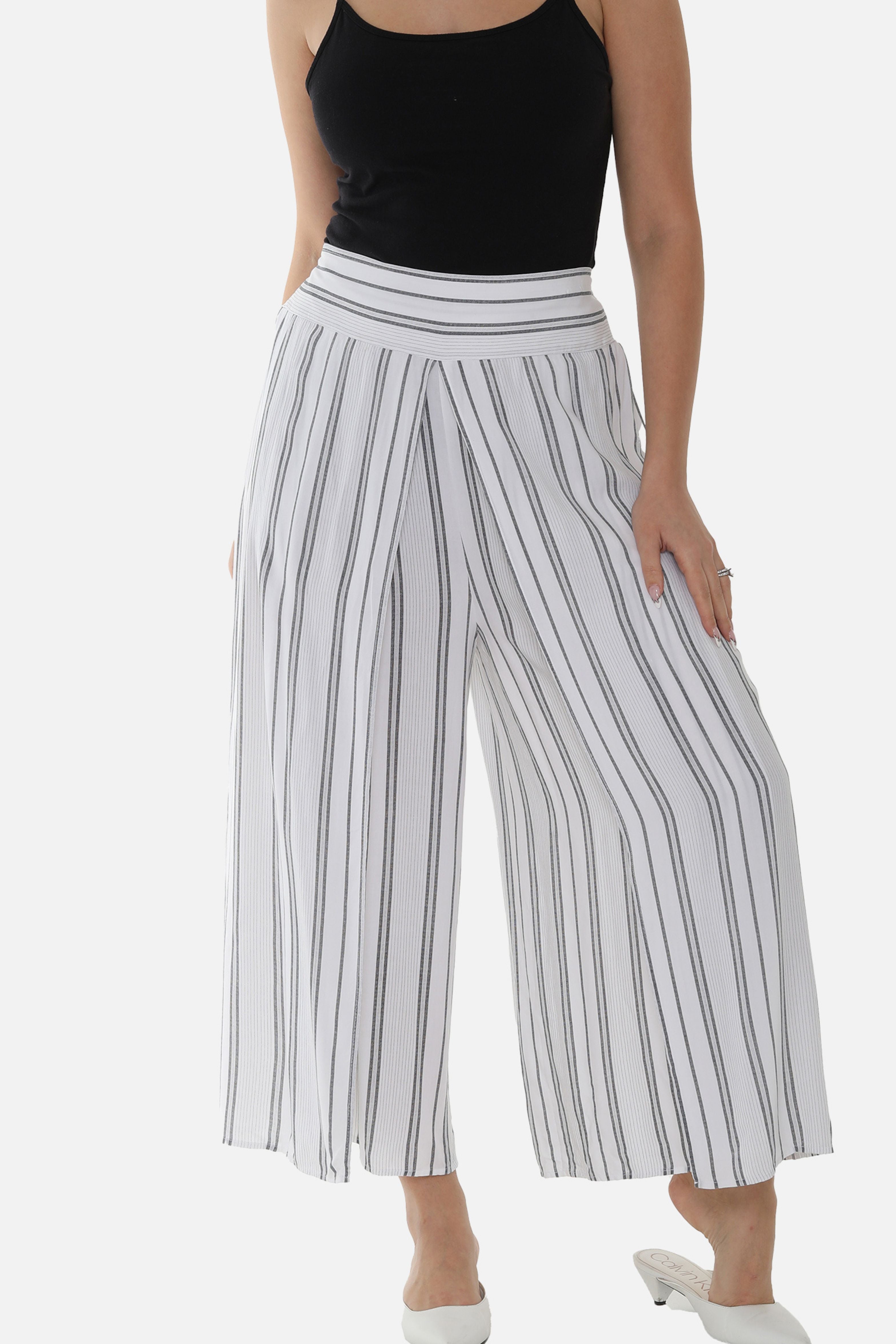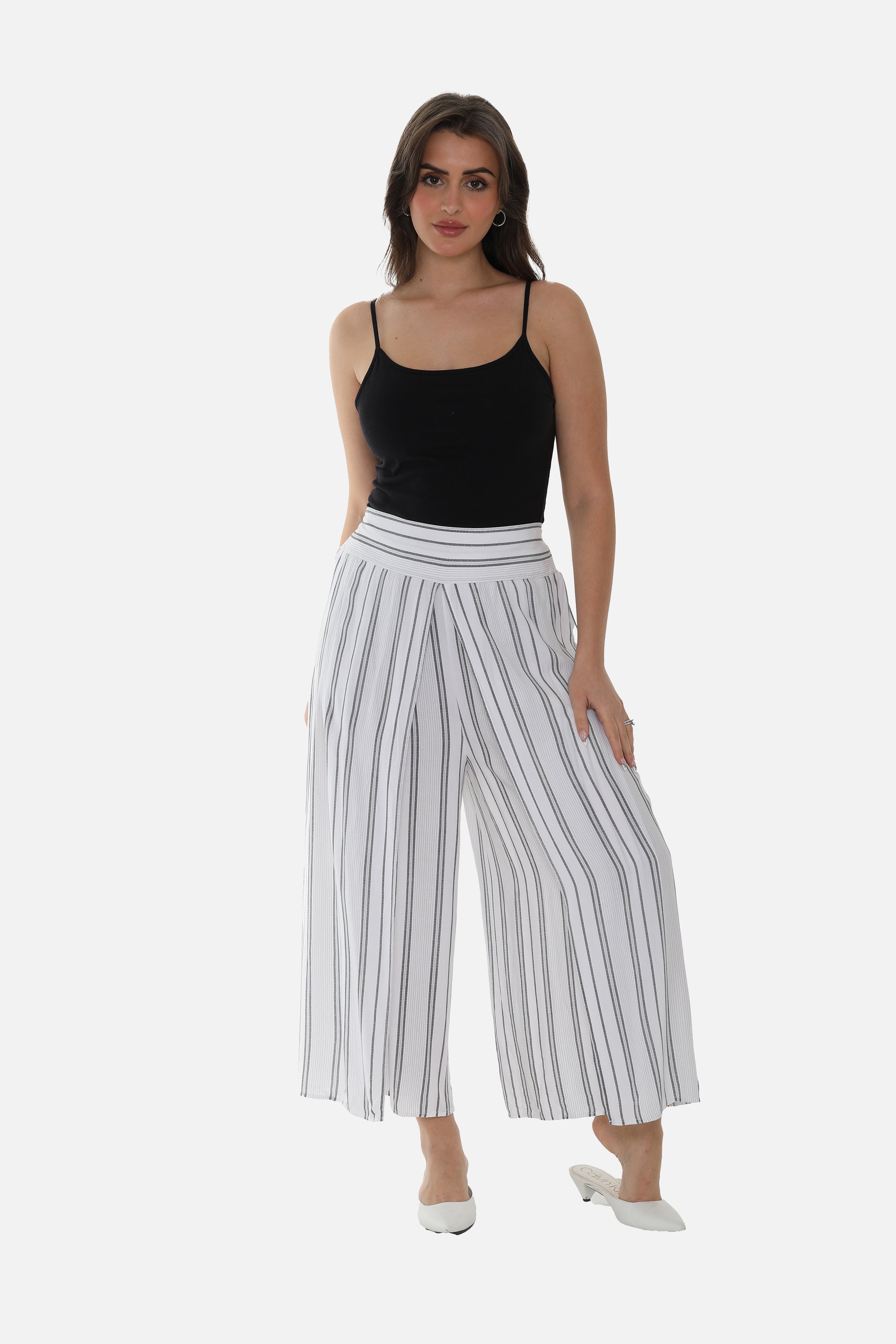 The standout feature of these pants is the eye-catching striped pattern. The vertical stripes create a flattering and elongating effect, making your legs appear longer and slimmer. The classic stripe design adds a timeless appeal to the pants, ensuring they remain a staple in your wardrobe for seasons to come.