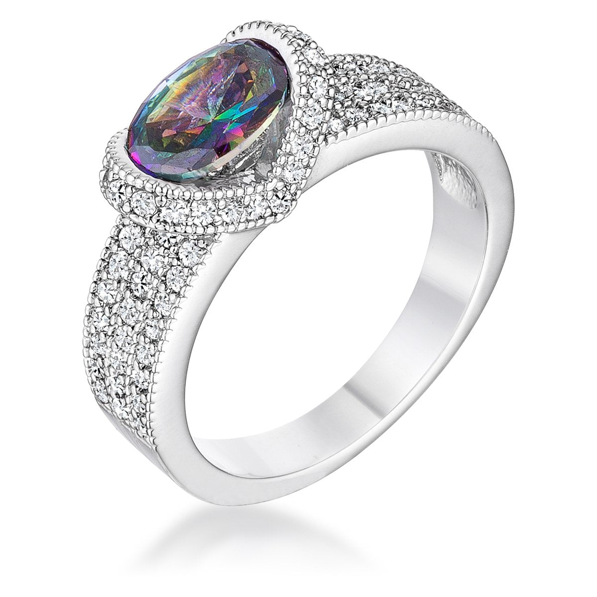 The center oval-cut mystic cubic zirconia is the star of this lovely ring and the prismatic display of color is certain to draw attention. No star is complete without co-stars though and this ring has generous cubic zirconia surrounding accents to catch the light and sparkle like crazy. Its crafted with lustrous rhodium plating so it shines like perfect white gold!