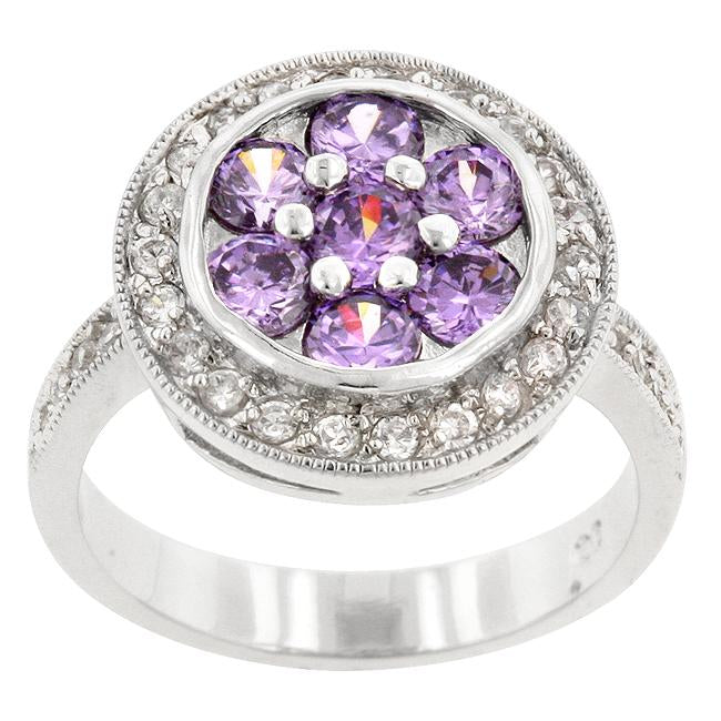 The Amethyst Purple Lilys delicate look displays seven amethyst cubic zirconia and an additional layer of clear accents. Genuine Rhodium Plating is achieved using an electroplating process that coats the item with heavy layers of rhodium a close cousin to platinum which gives our jewelry a platinum luster.