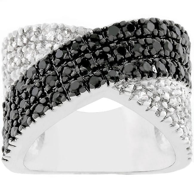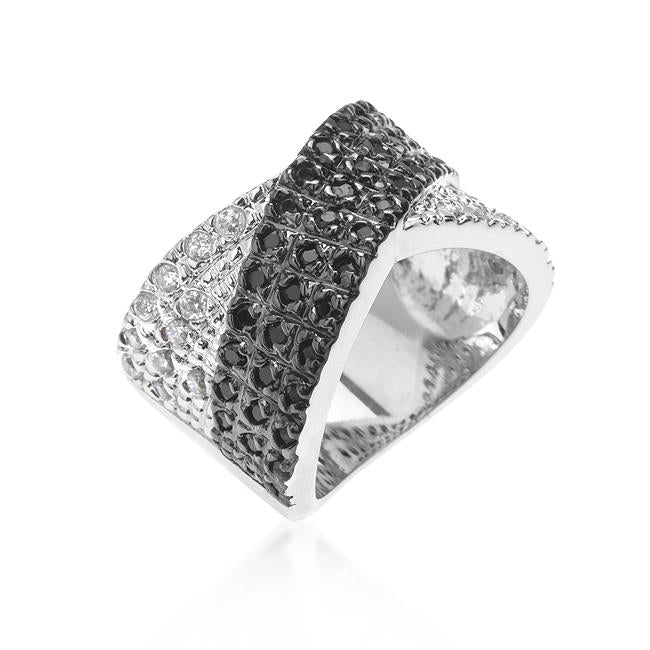 The Two-Tone Cross Pattern Ring is a sophisticated cocktail ring. Designed with a shimmering combination of jet and clear cubic zirconia this ring certainly exudes the X-factor. Our two-tone and tri-tone process use 18k gold that electroplated coating the item with heavy layers of 18k yellow gold giving it that 14k hamiliton gold polished look. The silver tone is achieved by applying a heavy coating of genuine rhodium to the item giving is a lustrous silver tone high polish.