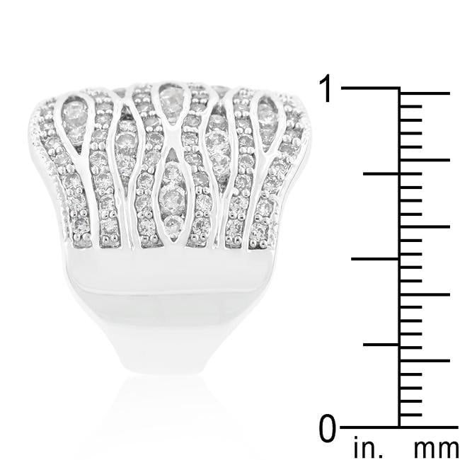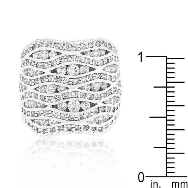 An array of sparkling round stones mingle to create this wide abstract ring-- just the right amount of sparkle to wear every day. Our genuine rhodium finish is achieved using an electroplating process that coats the item with heavy layers of rhodium a close cousin to platinum which gives our jewelry a platinum luster.