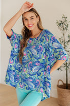 The Essentially You Top in Painted Blue Mix is the perfect blend of style and comfort. The boat neck and bat wing sleeve add a touch of elegance, while the high low scooped hem and banded sleeve cuff create a flattering silhouette. Made with bulgari fabric, this top is flowy, breathable, and oh-so-comfortable. (How can you resist?)