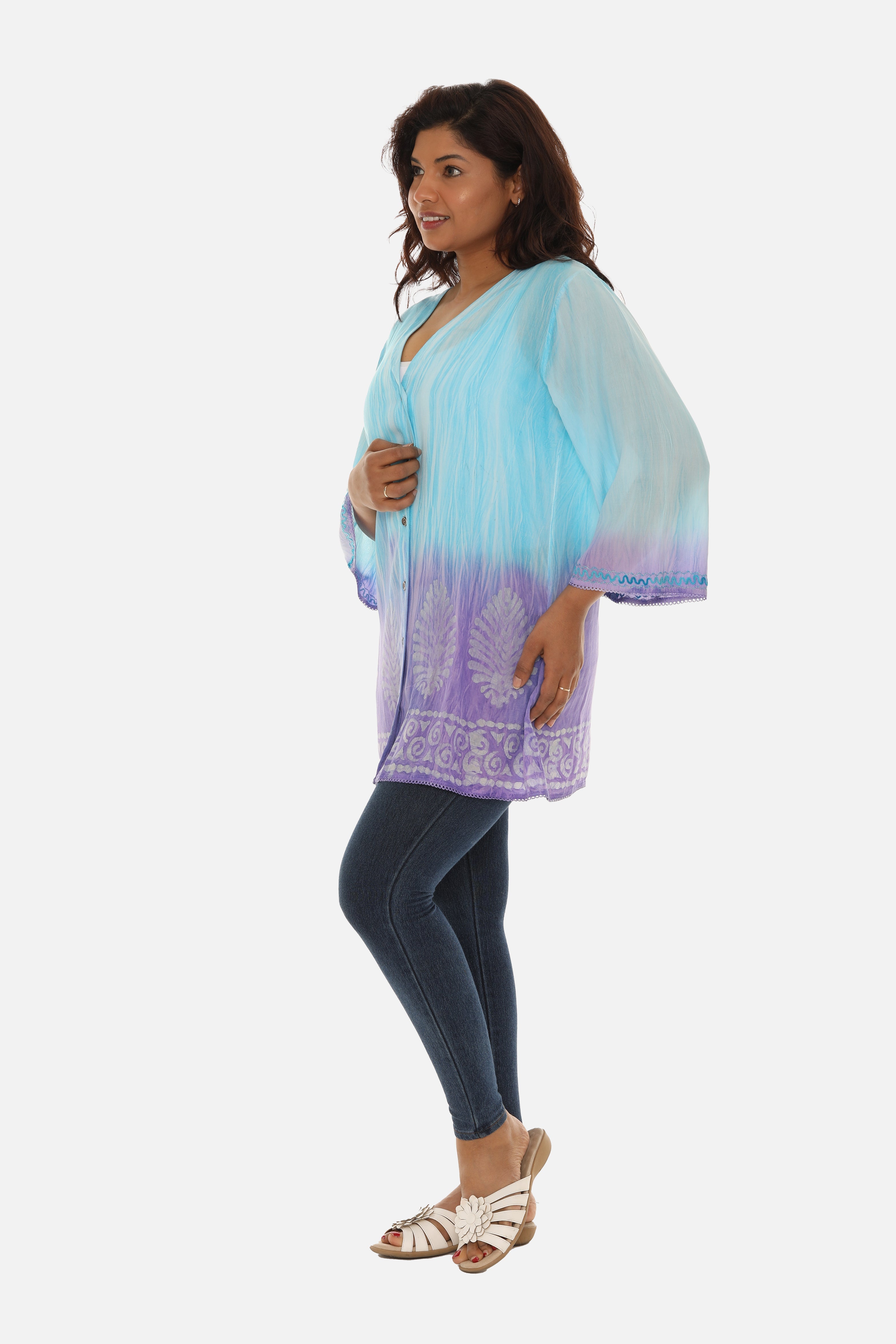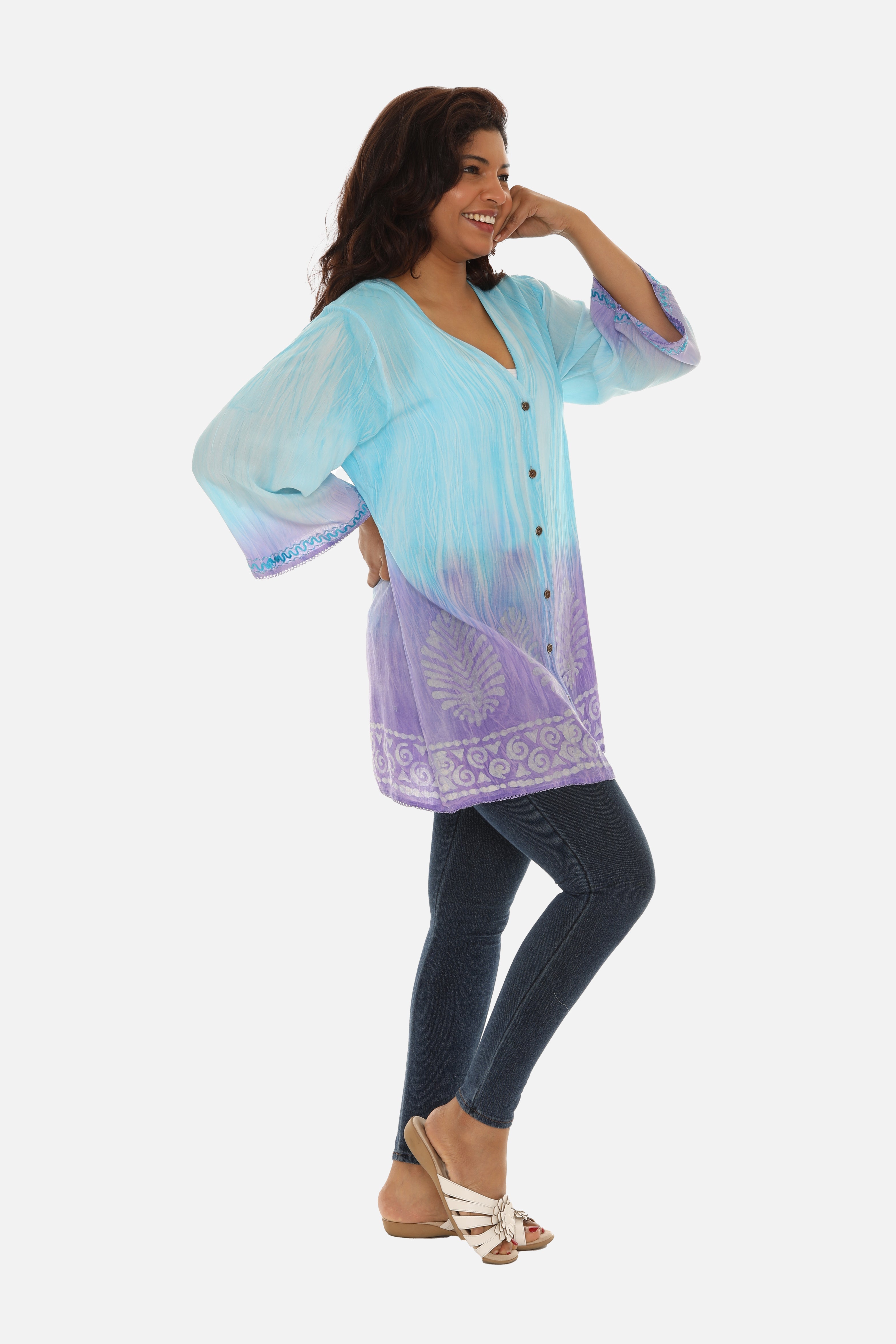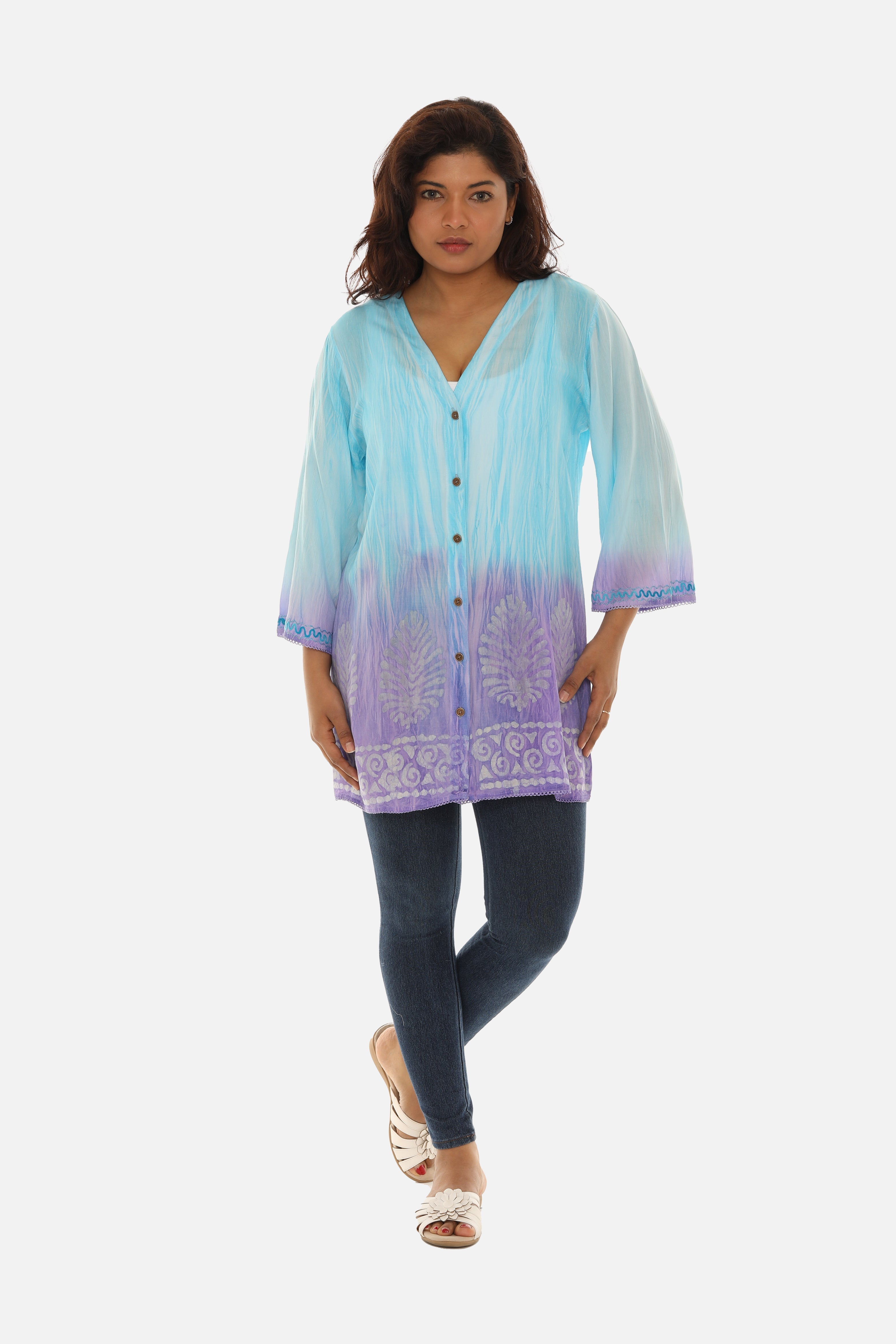 Three quarters Sleeve V-Neck Button Down Block Print Shirt