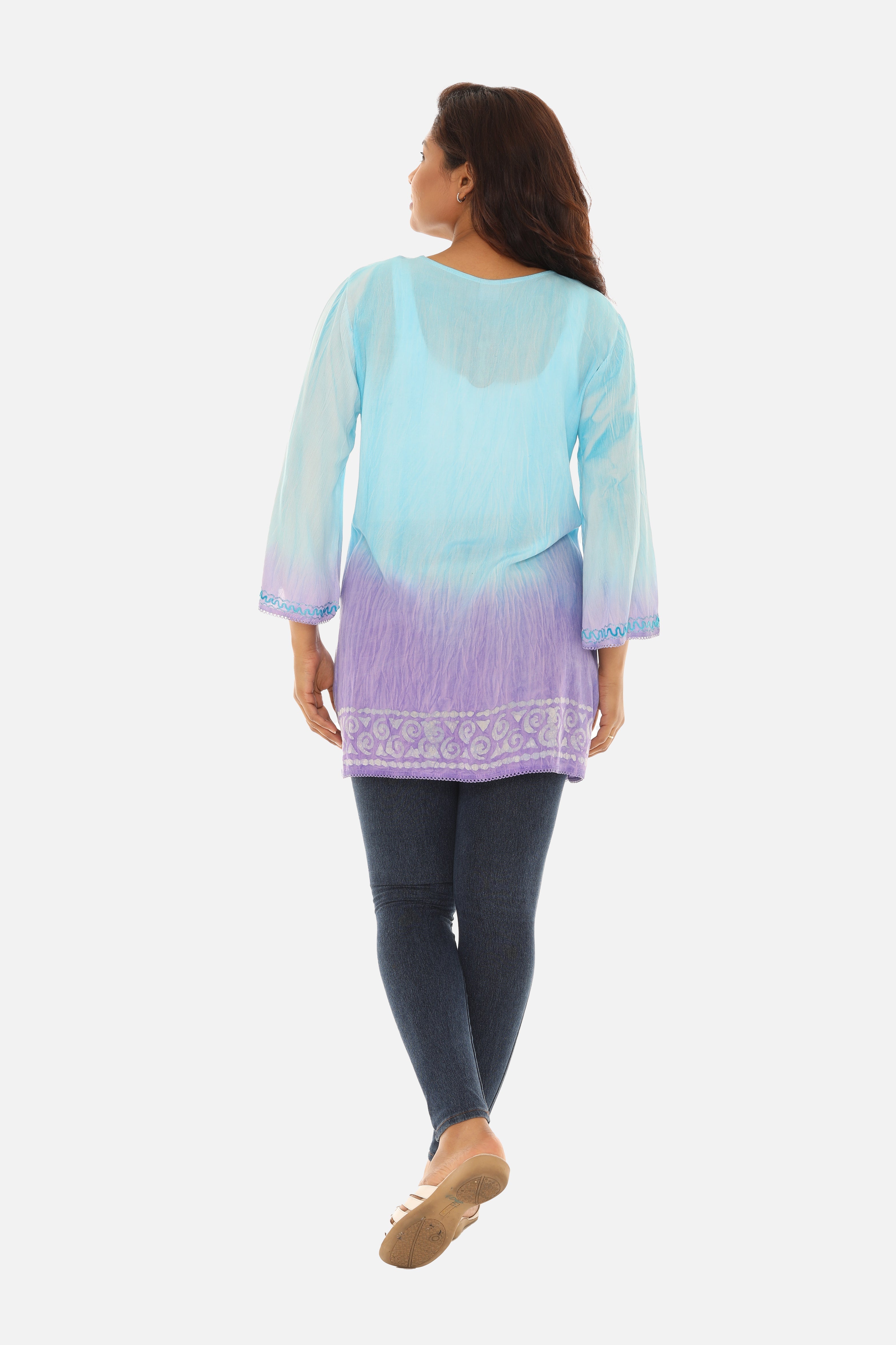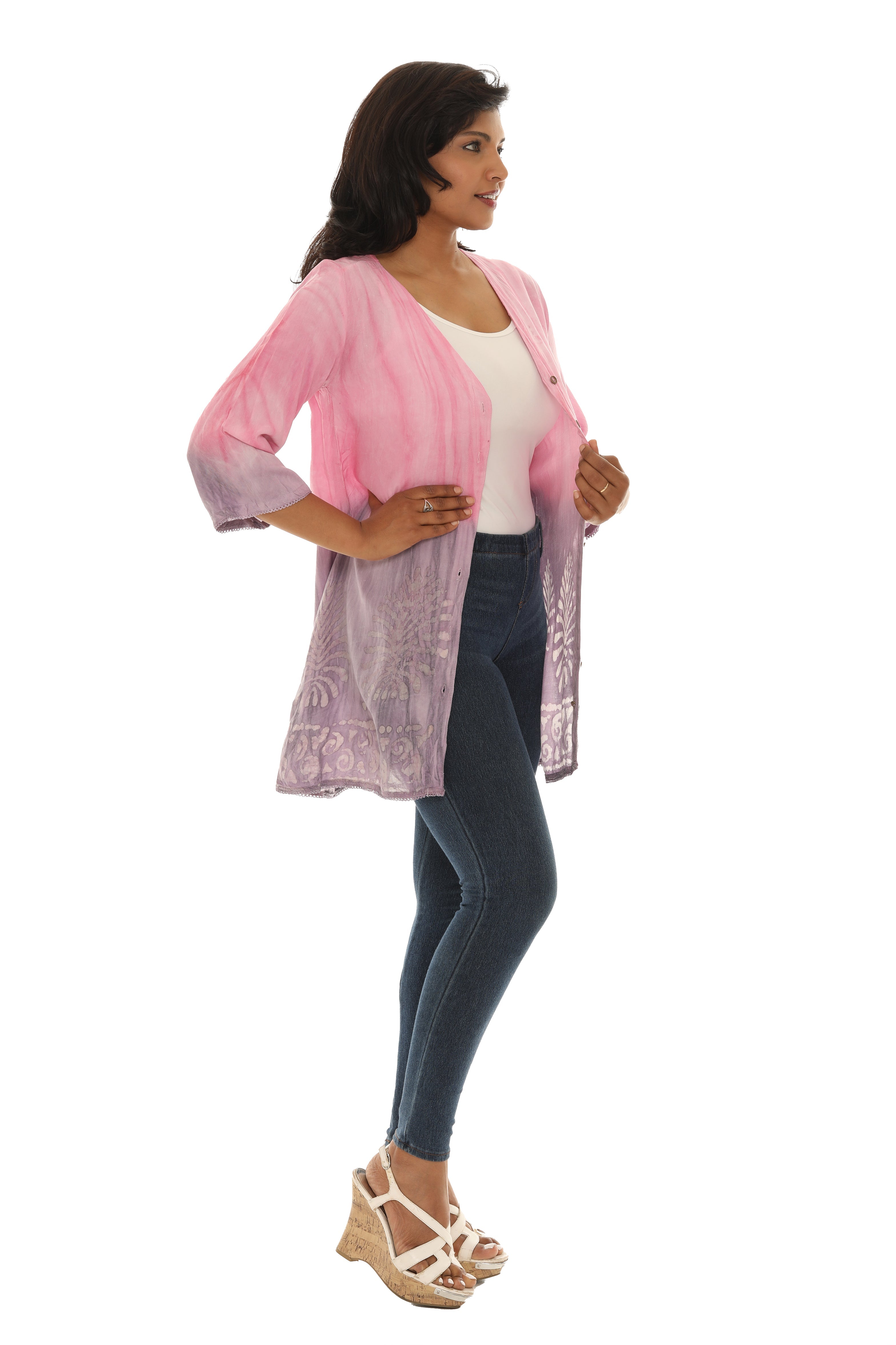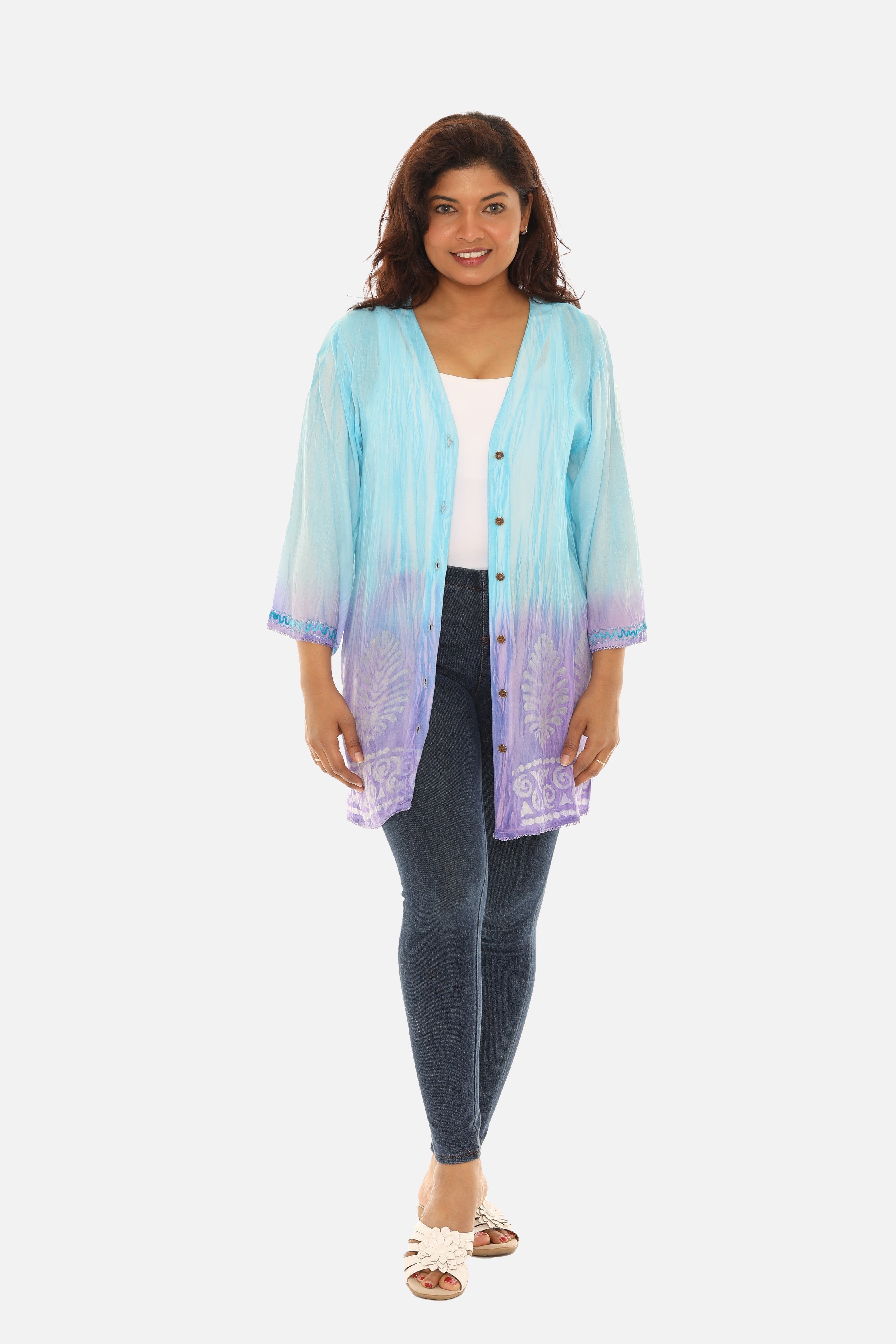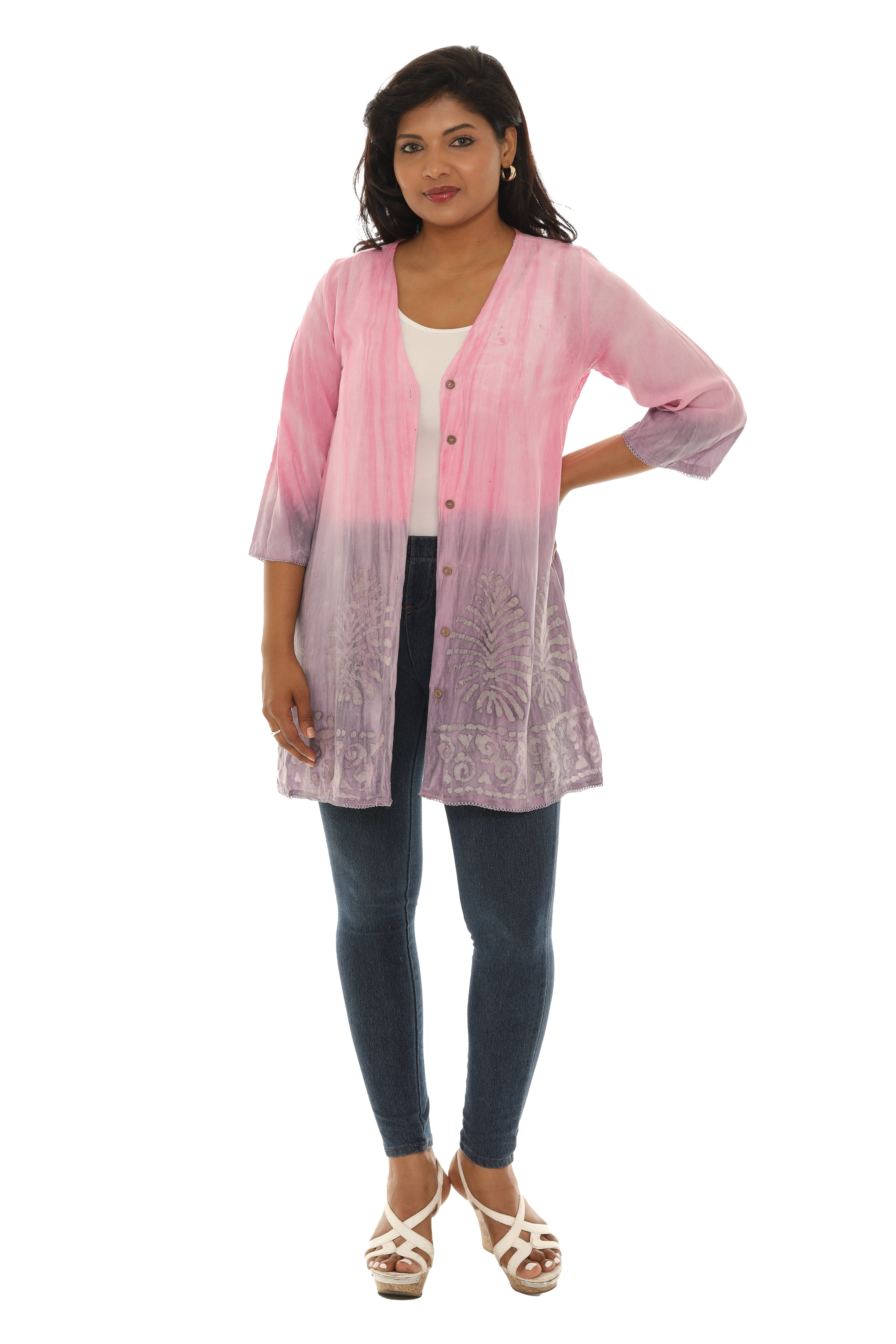 Three quarters Sleeve V-Neck Button Down Block Print Shirt