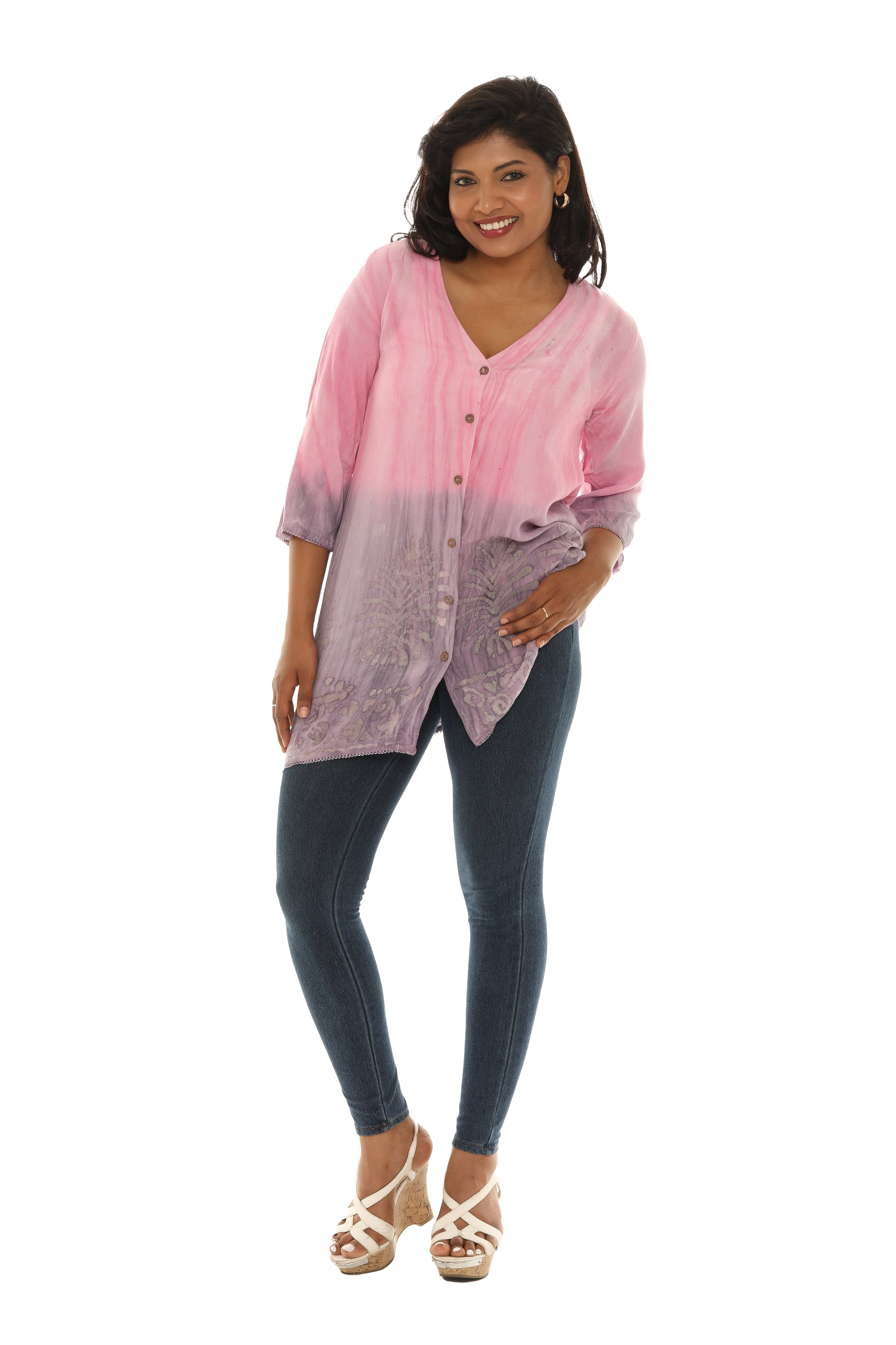 Crafted with utmost precision, this shirt features a flattering V-neckline that adds a touch of femininity while providing a sophisticated look. The button-down front allows for versatile styling options, whether you prefer a polished, buttoned-up appearance or a more relaxed and effortless vibe.