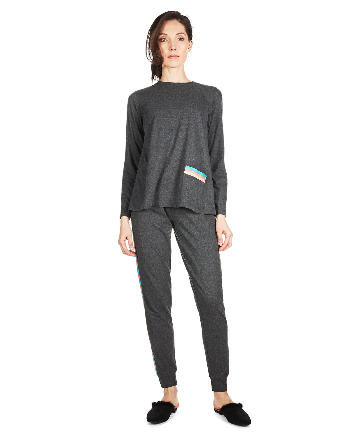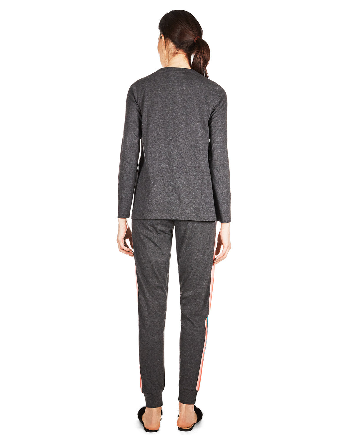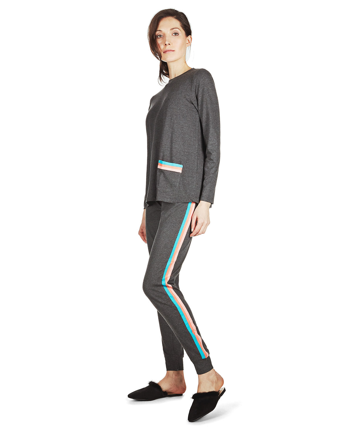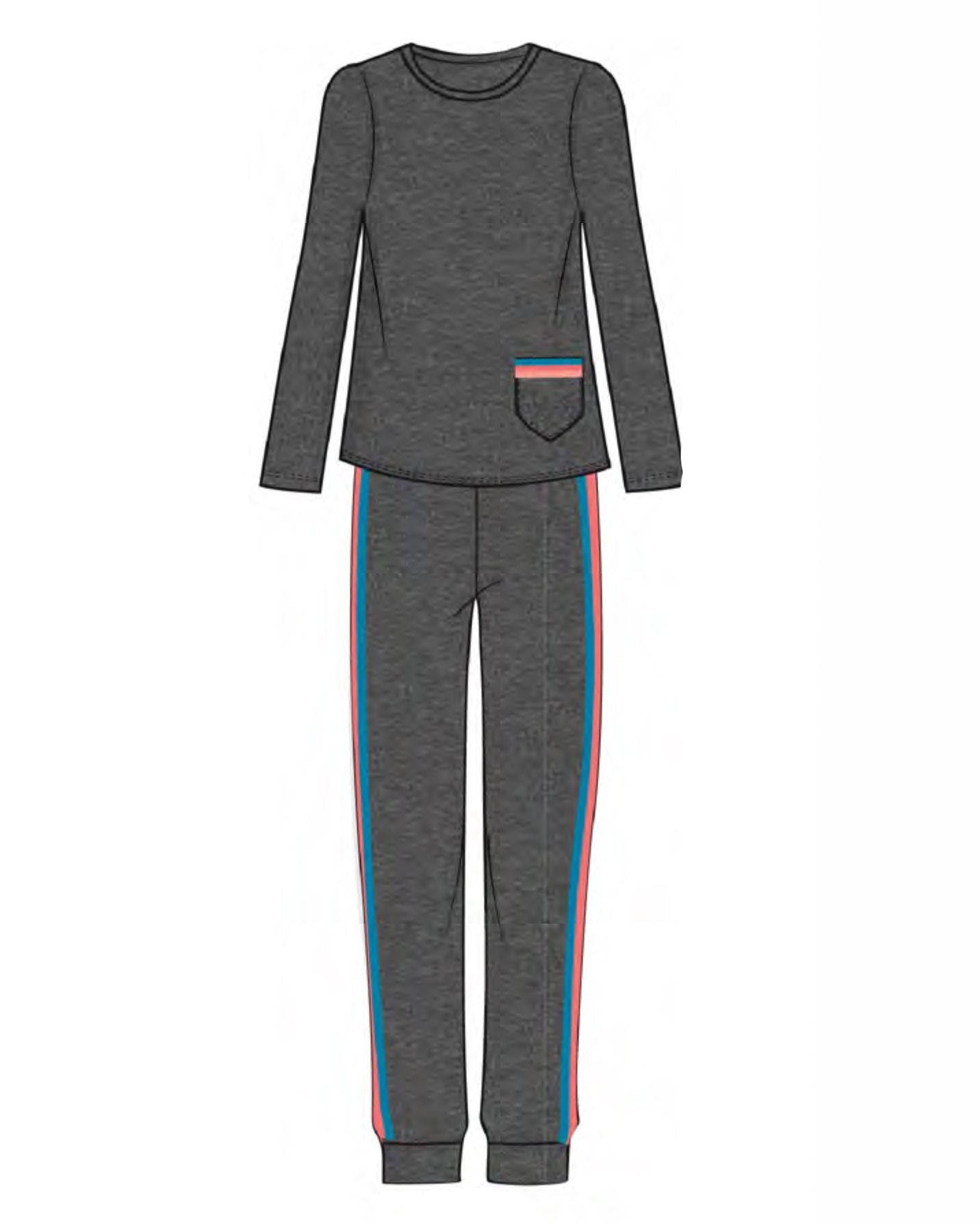 - Dark grey heather fabric featuring three tone pink and blue stripe detailing on pant legs and pocket on shirt
