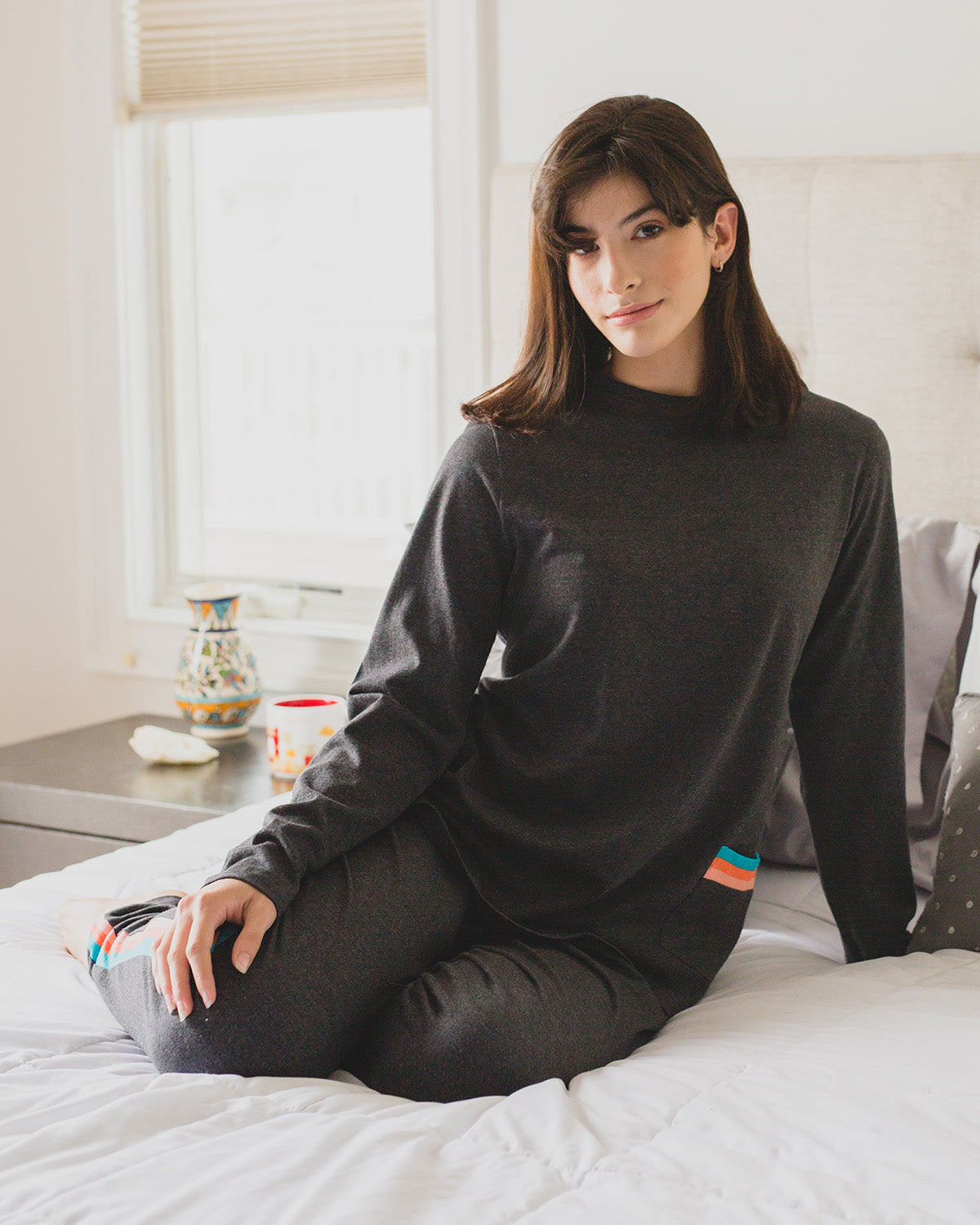 Our Striped Camper Set is proof that details can make or break your sleepwear. Two toned pink and blue striped markings on the front pocket (perfect for holding trinkets or nighttime necessities) and along the sides of the bottoms stand out against a stormy grey surface, providing a contrast that is striking and visually appealing. A high neck and long pants keep you totally covered. Hang out in total comfort and look absolutely cool doing it!