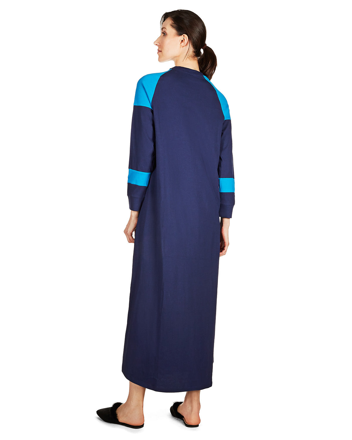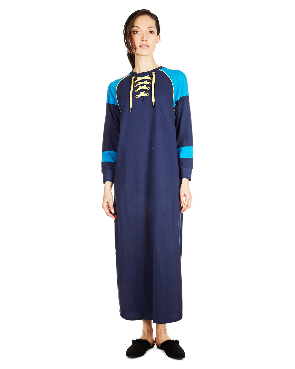 This super soft, cozy gown is reminiscent of your favorite sweatshirt - only longer! A rich, medieval blue is marked with electric blue detailing on the shoulders and yellow piping on the edges and the drawstrings near the neck. 100% cotton fabric makes this a breeze to wear all night long or even to lounge around the house.