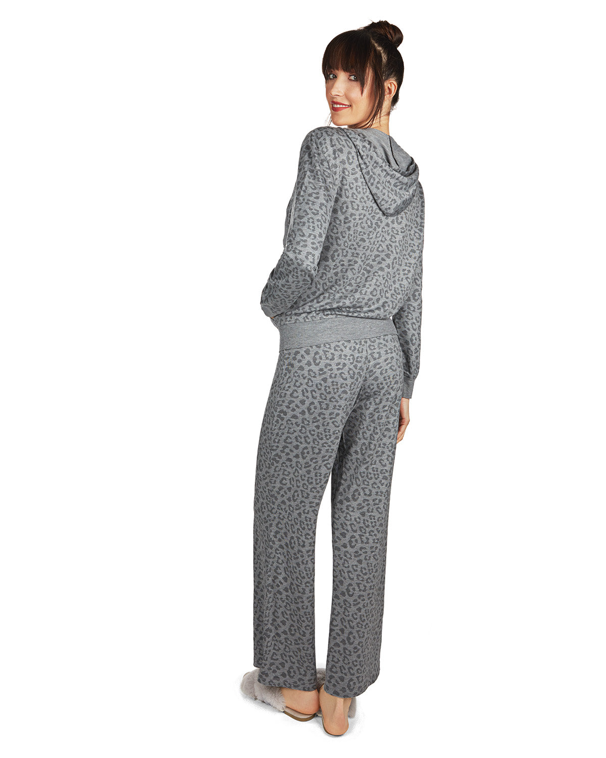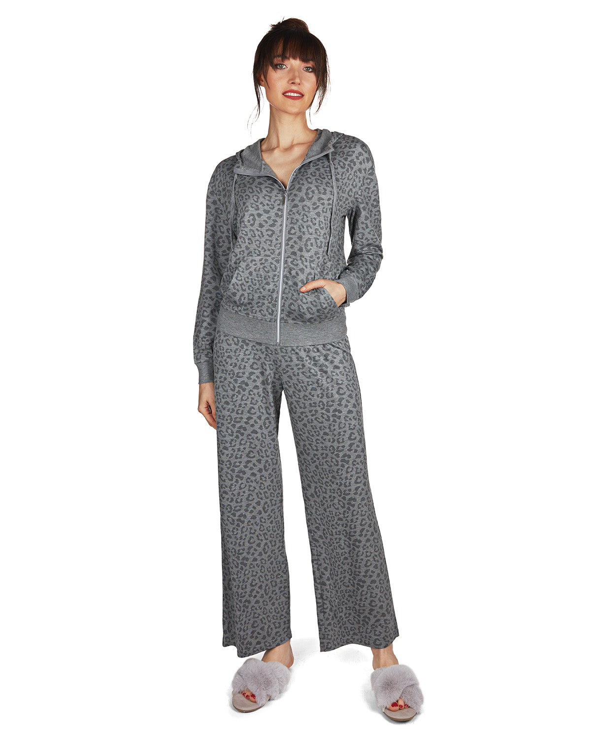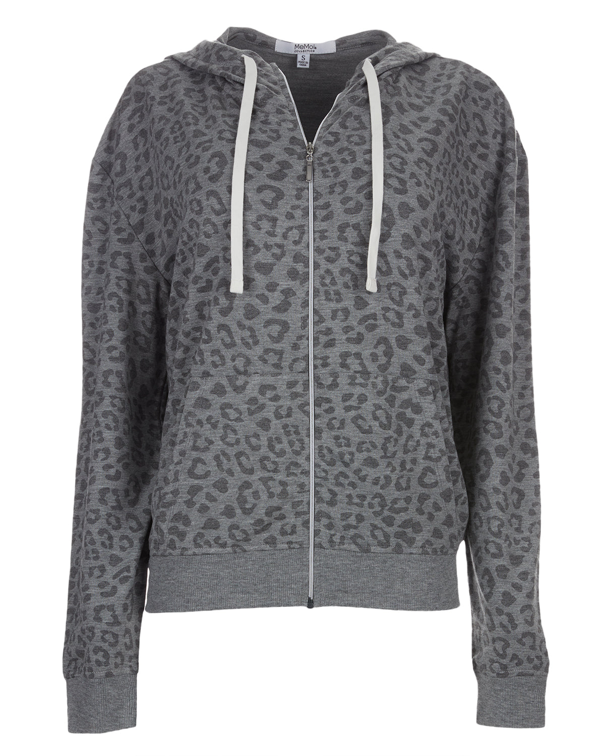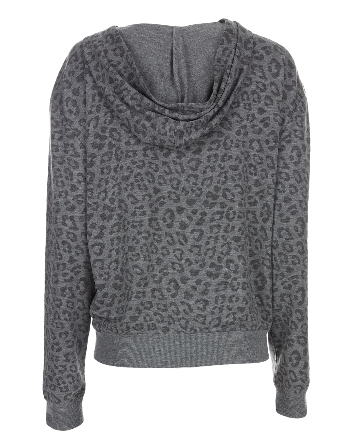 This leopard patterned zip hoodie brings comfy and cozy to a whole new level. Made of soft french terry cloth, this tonal heather grey leopard garment is a must have piece for all your lounging needs. Relax and look cute while doing it! Pair with our lounge pants or shorts for a matching ensemble.