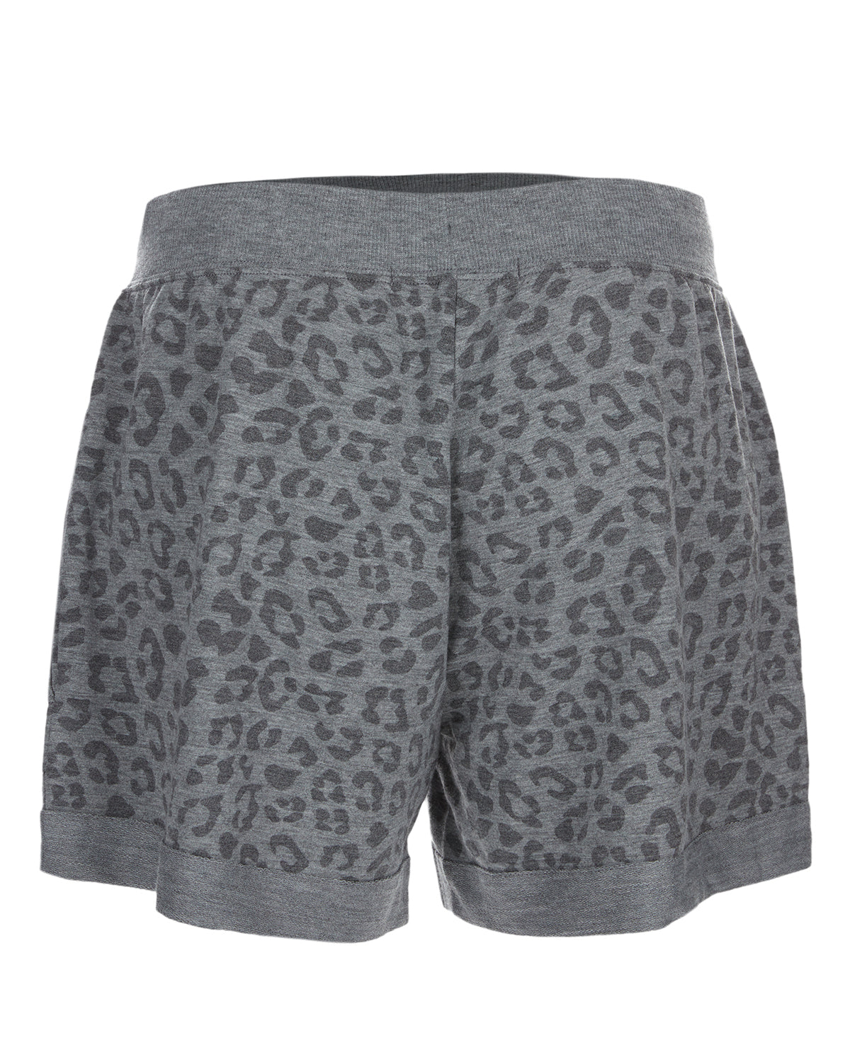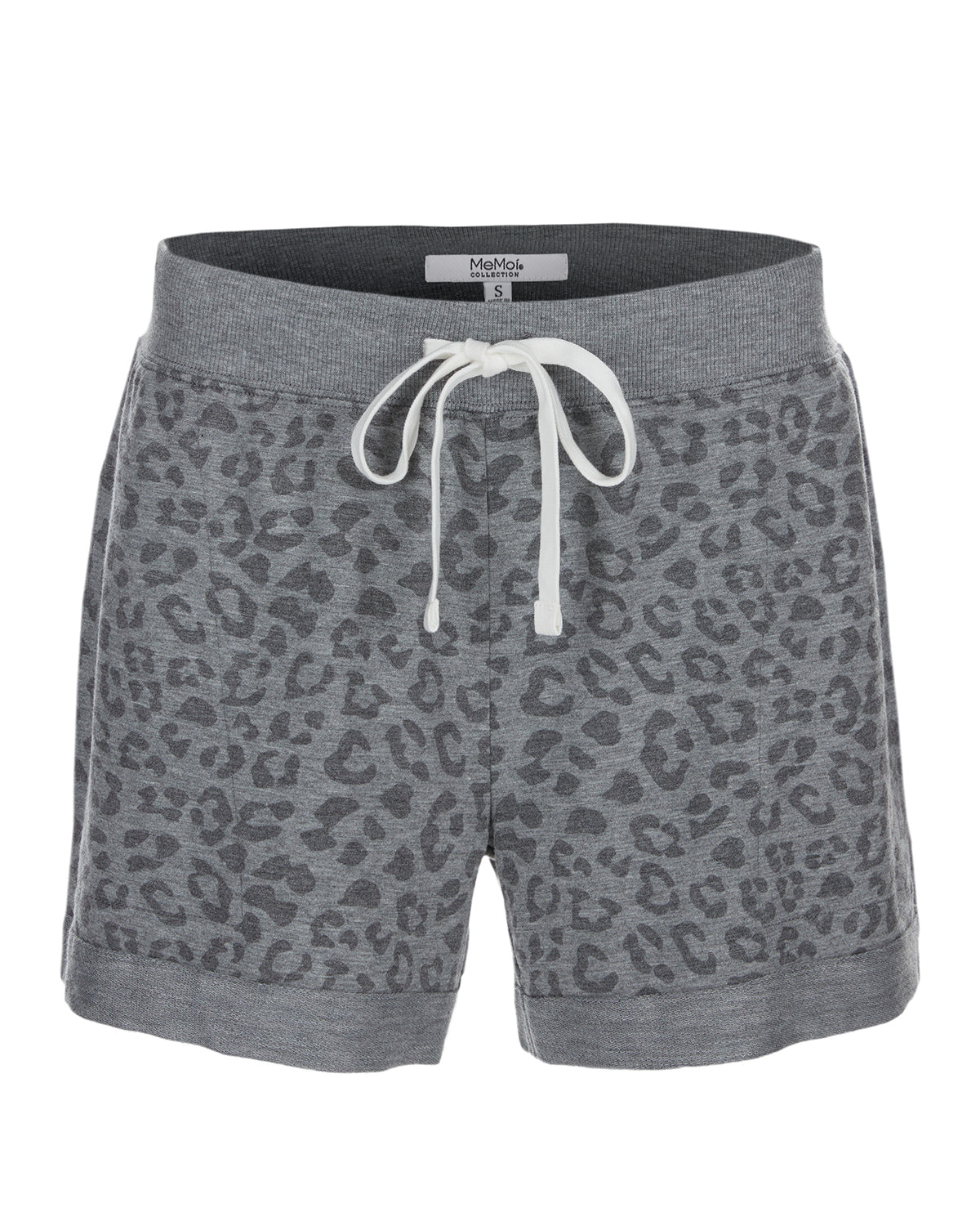 This pair of leopard patterned lounge shorts brings comfy and cozy to a whole new level. Made of soft french terry cloth, this tonal heather grey leopard garment is a must have piece for all your lounging needs. Relax and look cute while doing it! Pair with our zip hoodie or short sleeve sweatshirt for a matching ensemble.