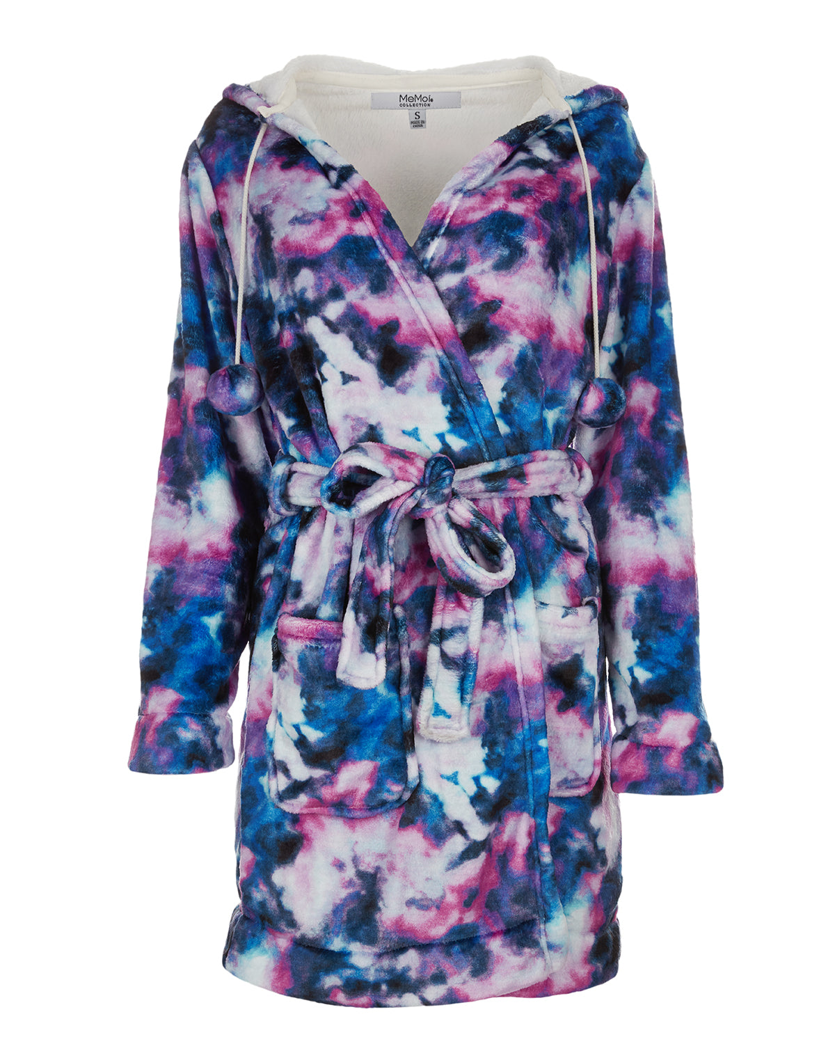 Lounge in luxury with our Stardust Tie Dye Plush Robe. We've printed blue and purple galaxy tie-dye on a plush white backdrop for dimensionality, making this fuzzy piece a show stopper. Get ready to be pampered as you put on this short hooded robe with oh-so-adorable pom-pom drawstrings, made of soft, cuddly polyester. Comes with deep front pockets and tie belt at waist.
