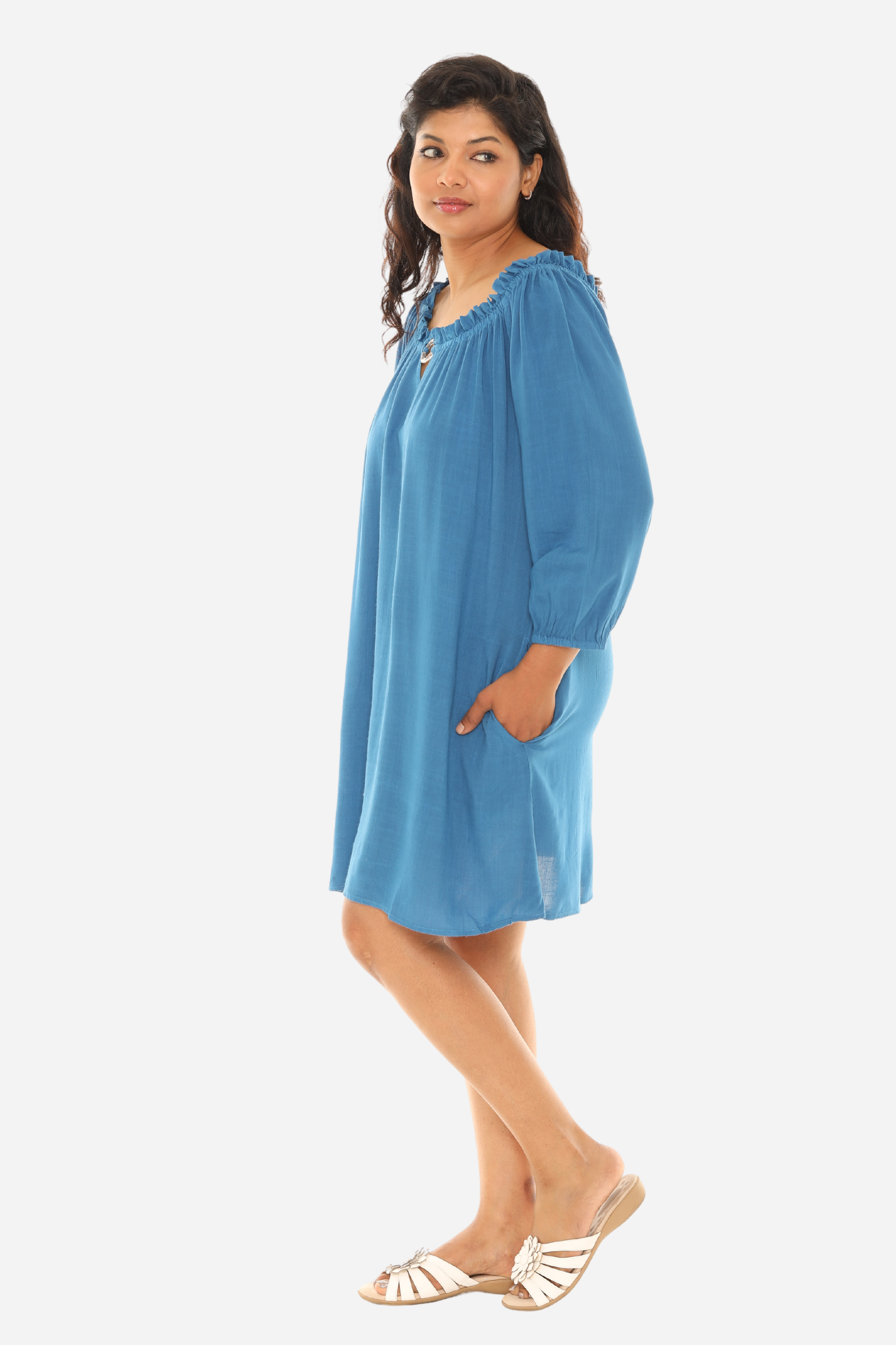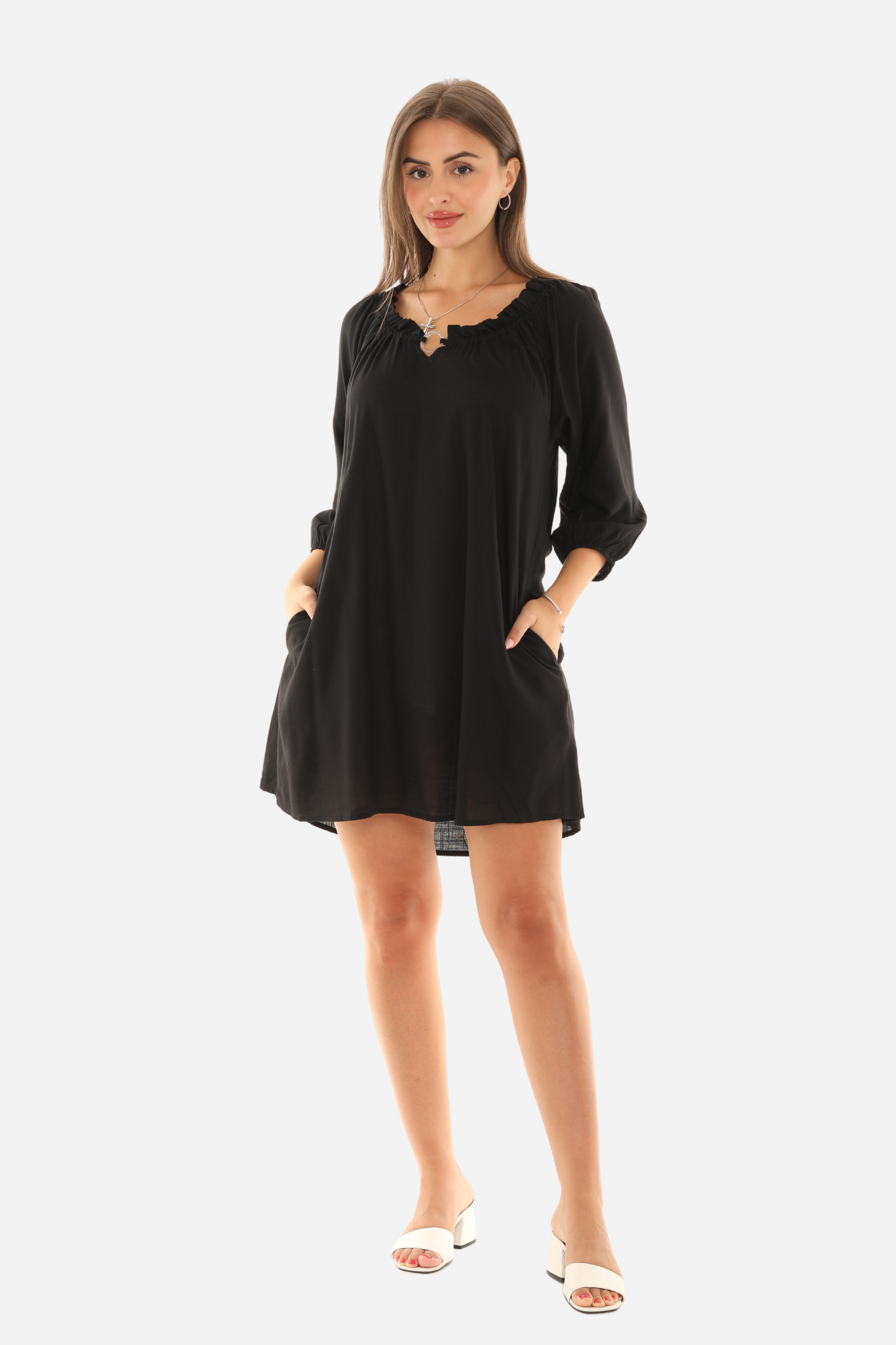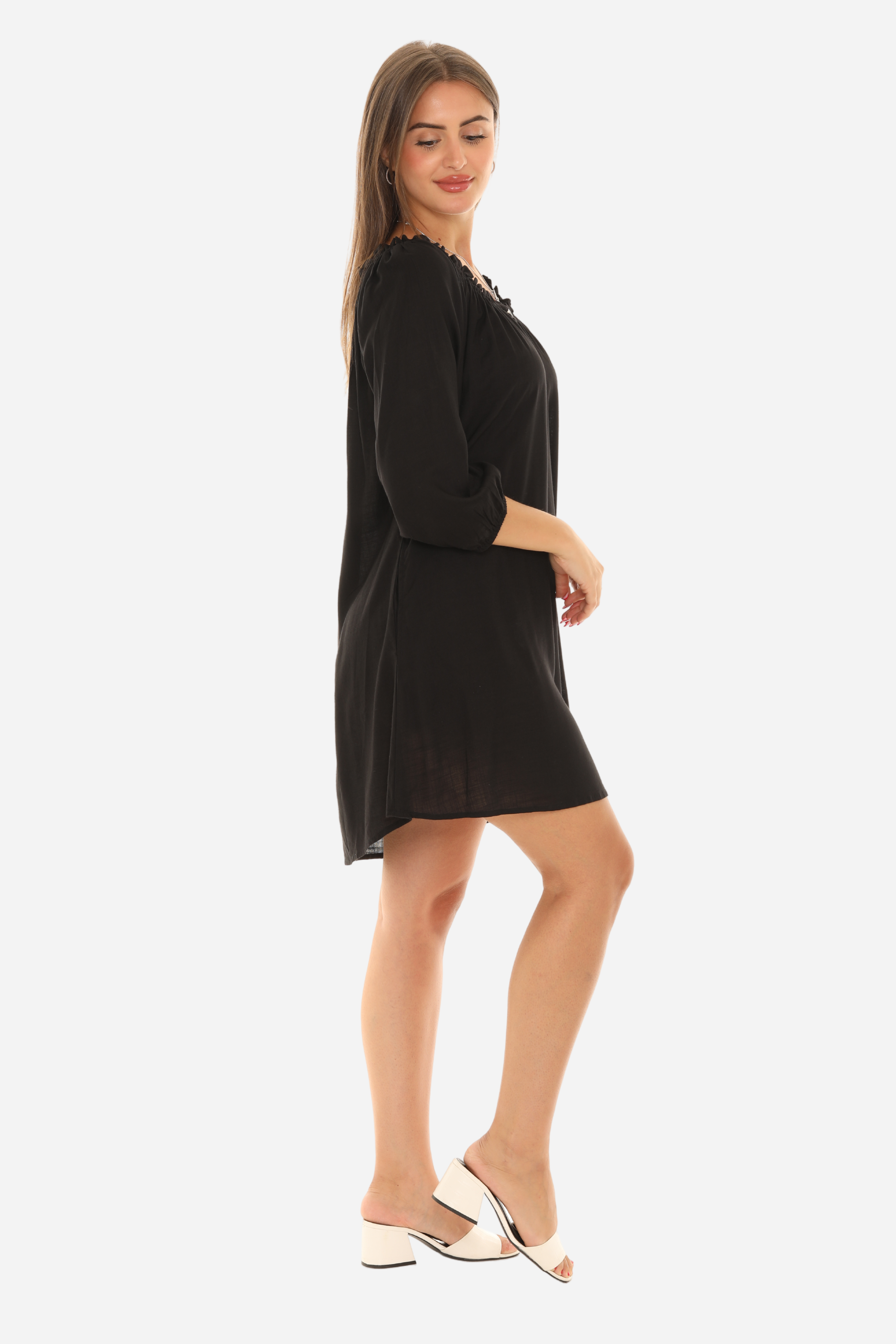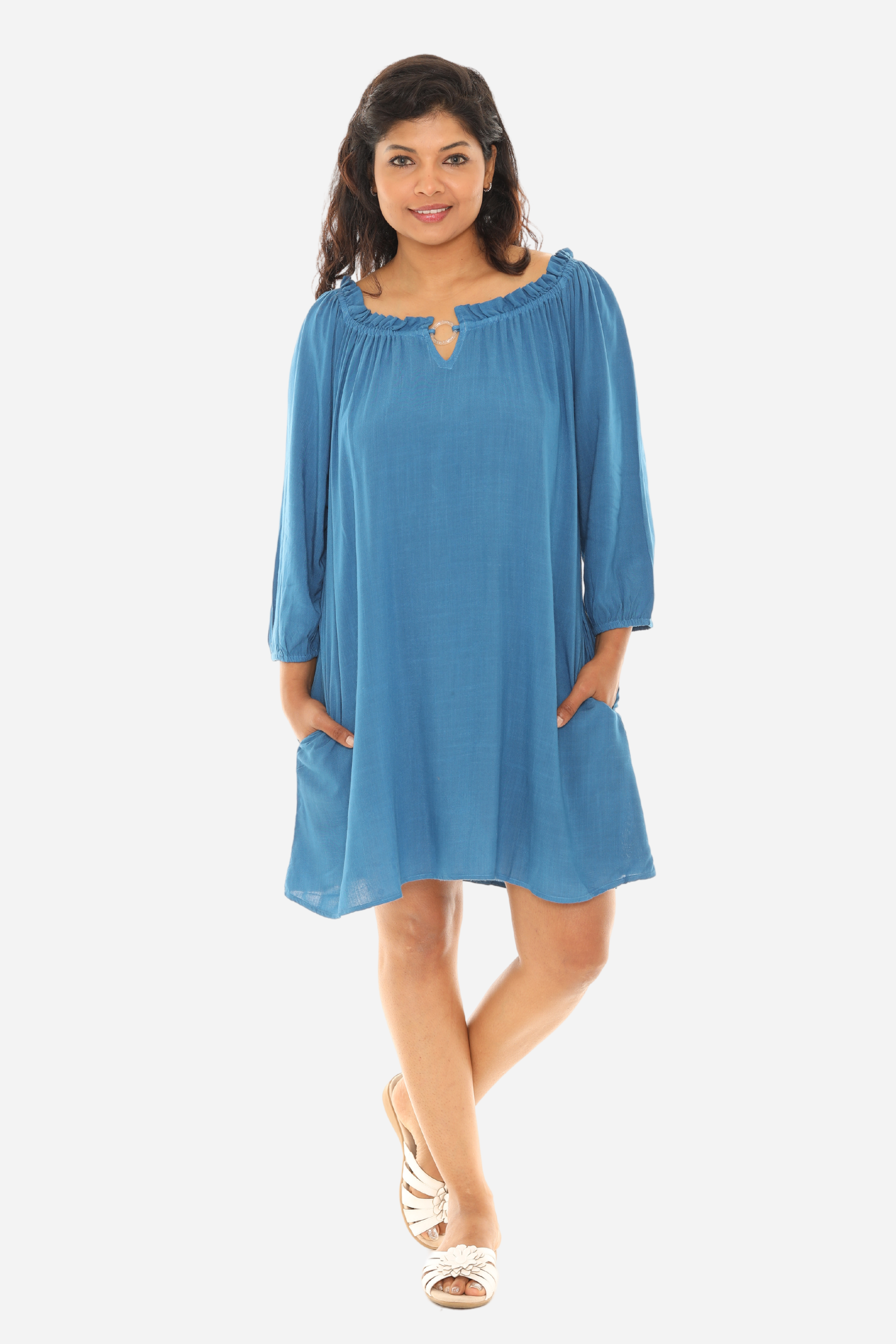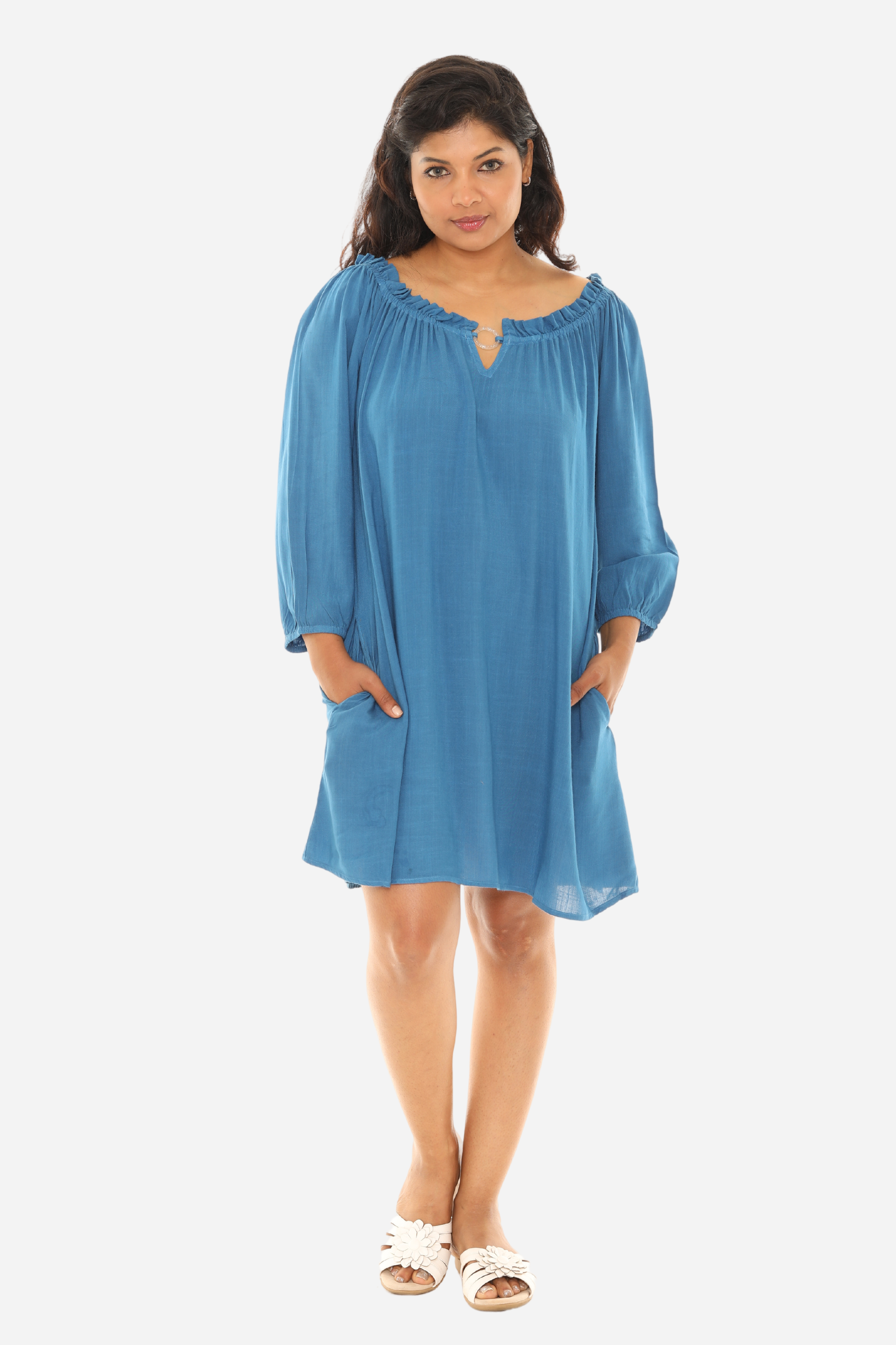 This dress is a classic, timeless piece that is sure to become a staple in your wardrobe! It features a smocked neck, notch neckline, and a shift silhouette that is flattering on any body type. The fabric is lightweight and comfortable, so you can wear it from day to night with ease.
