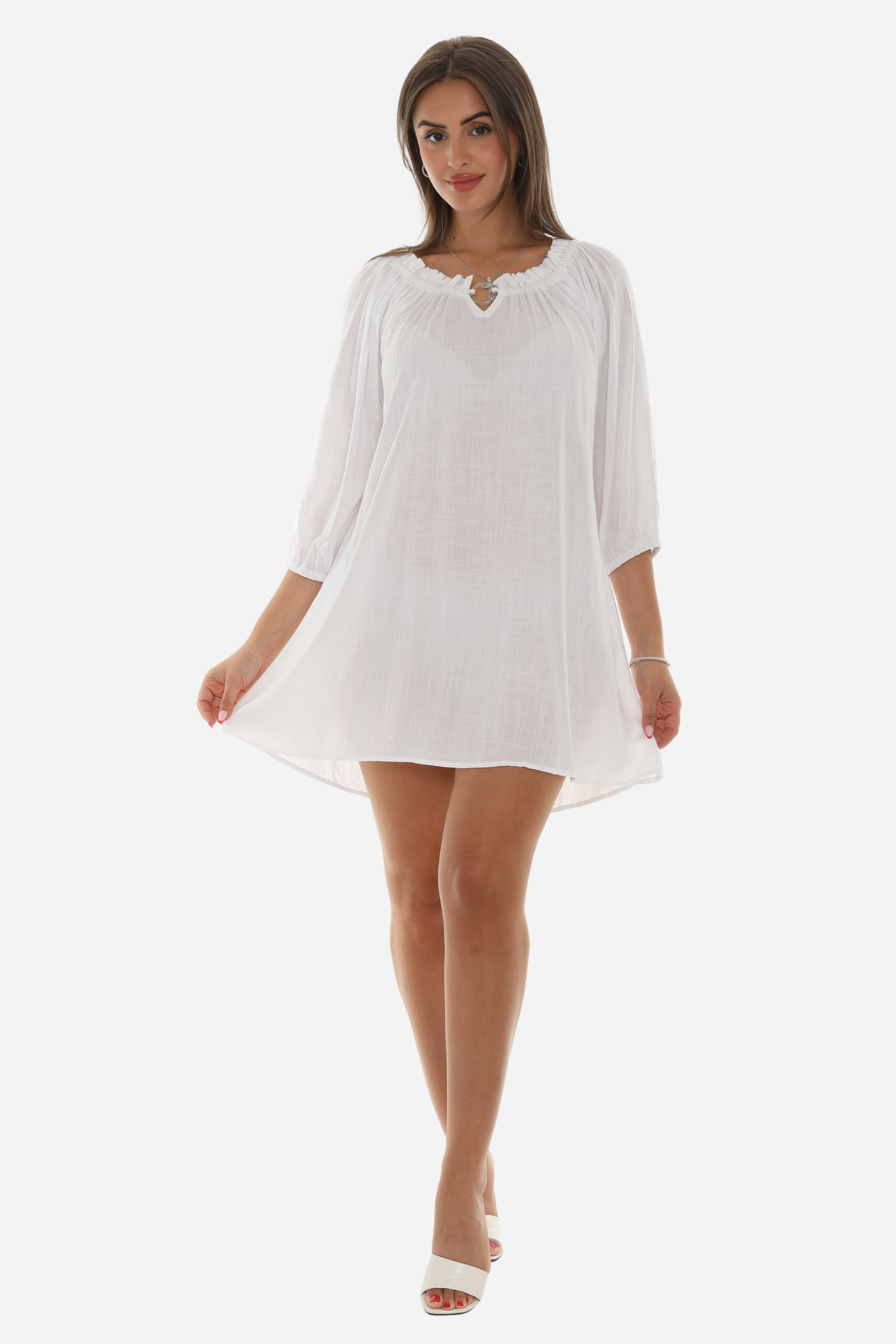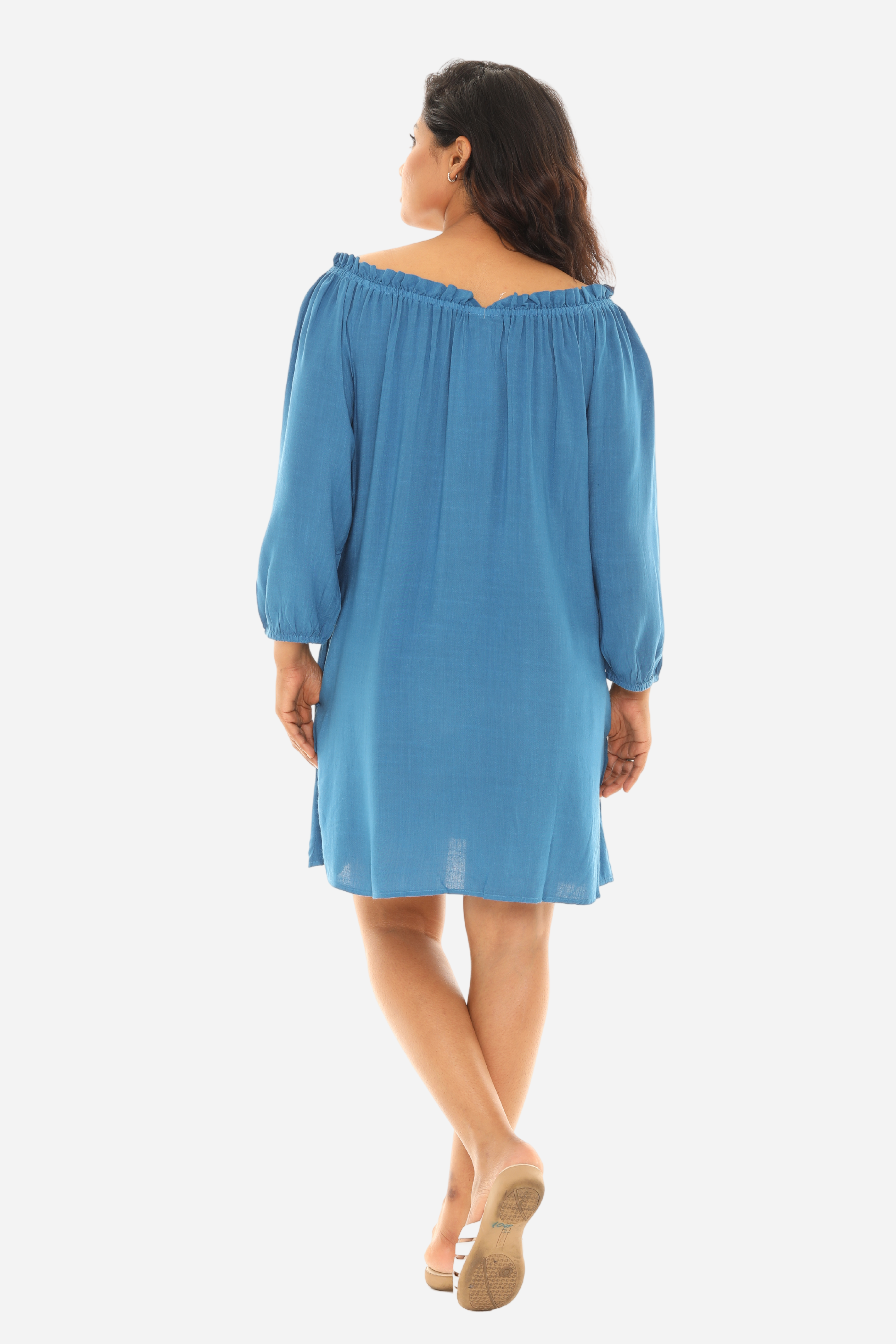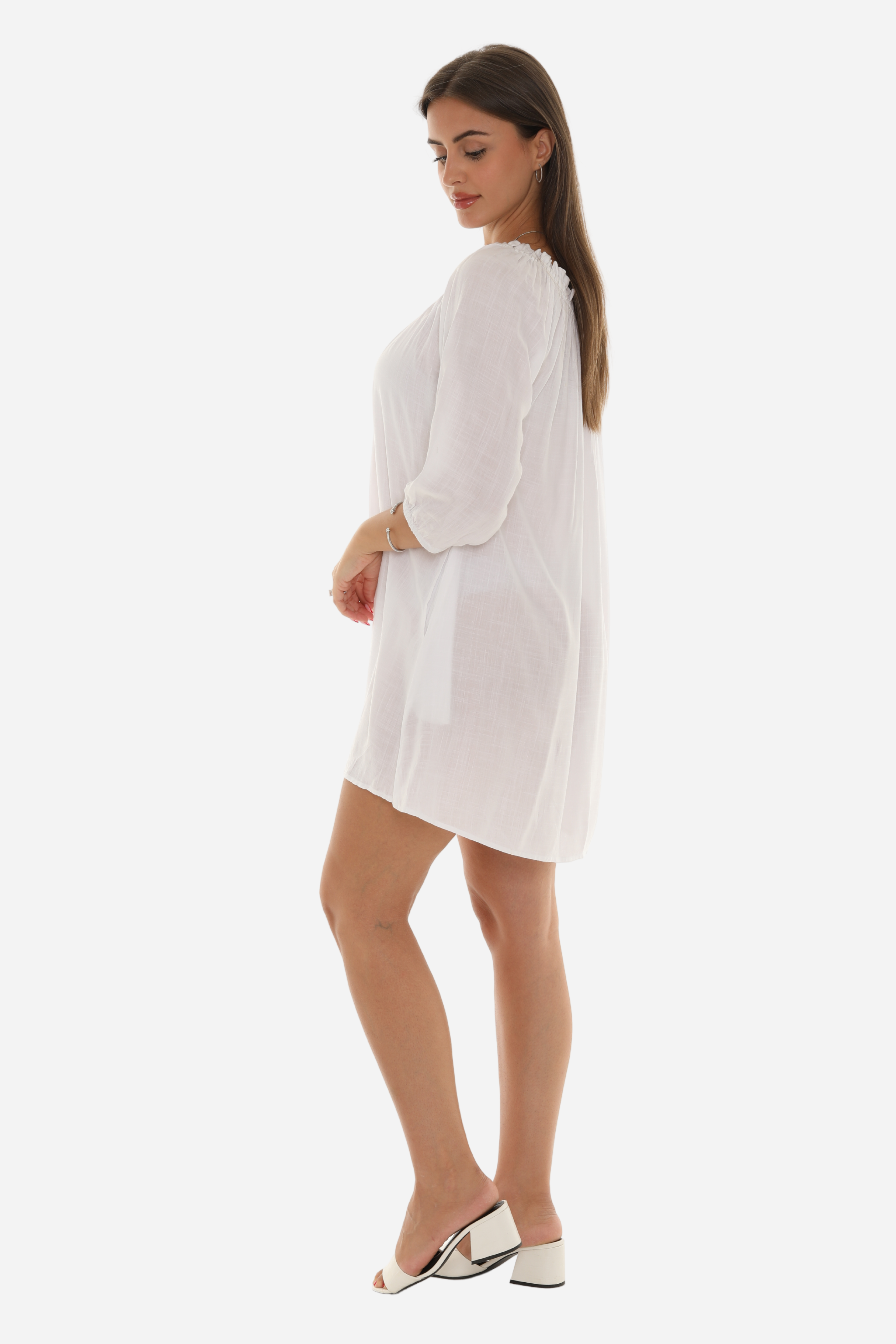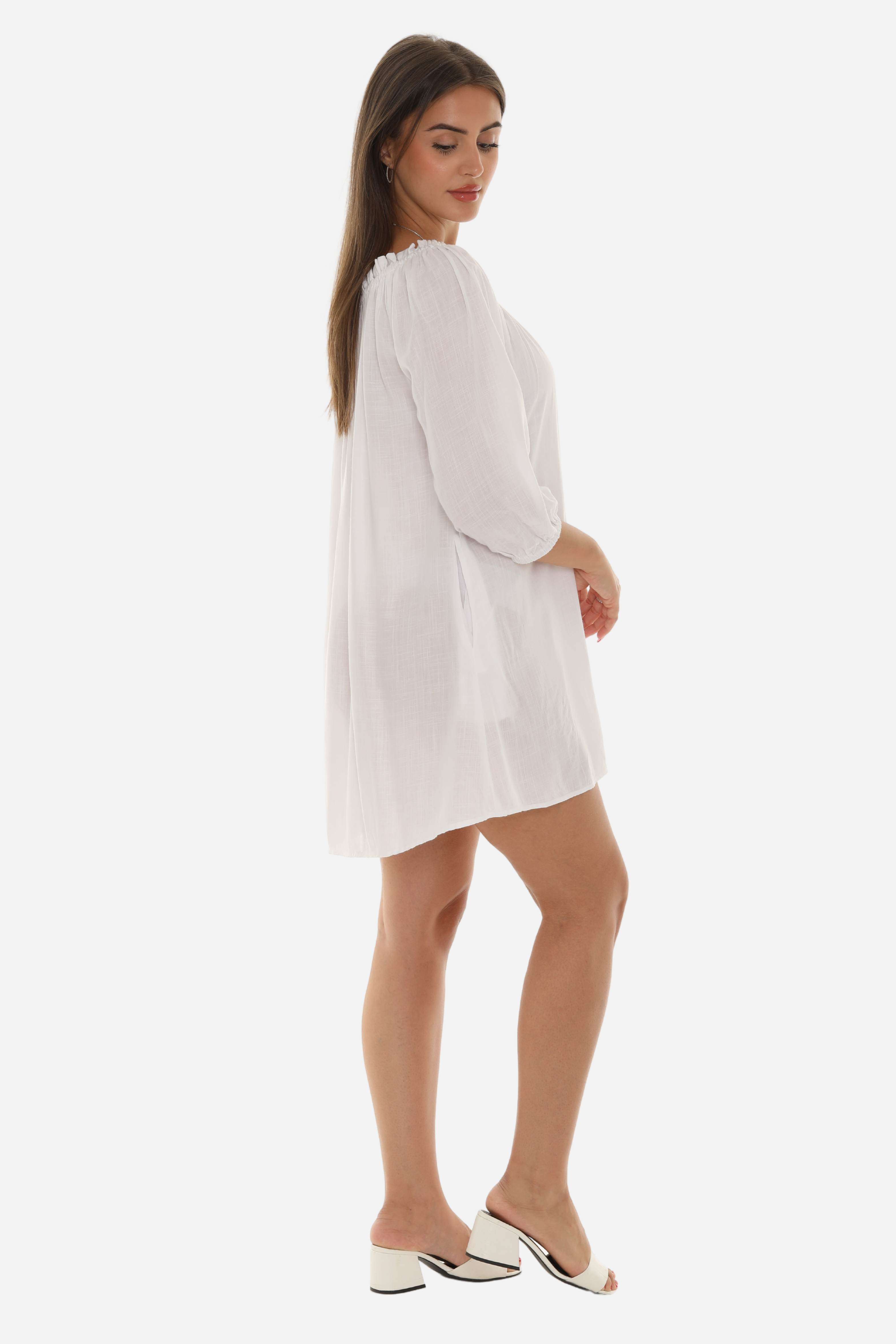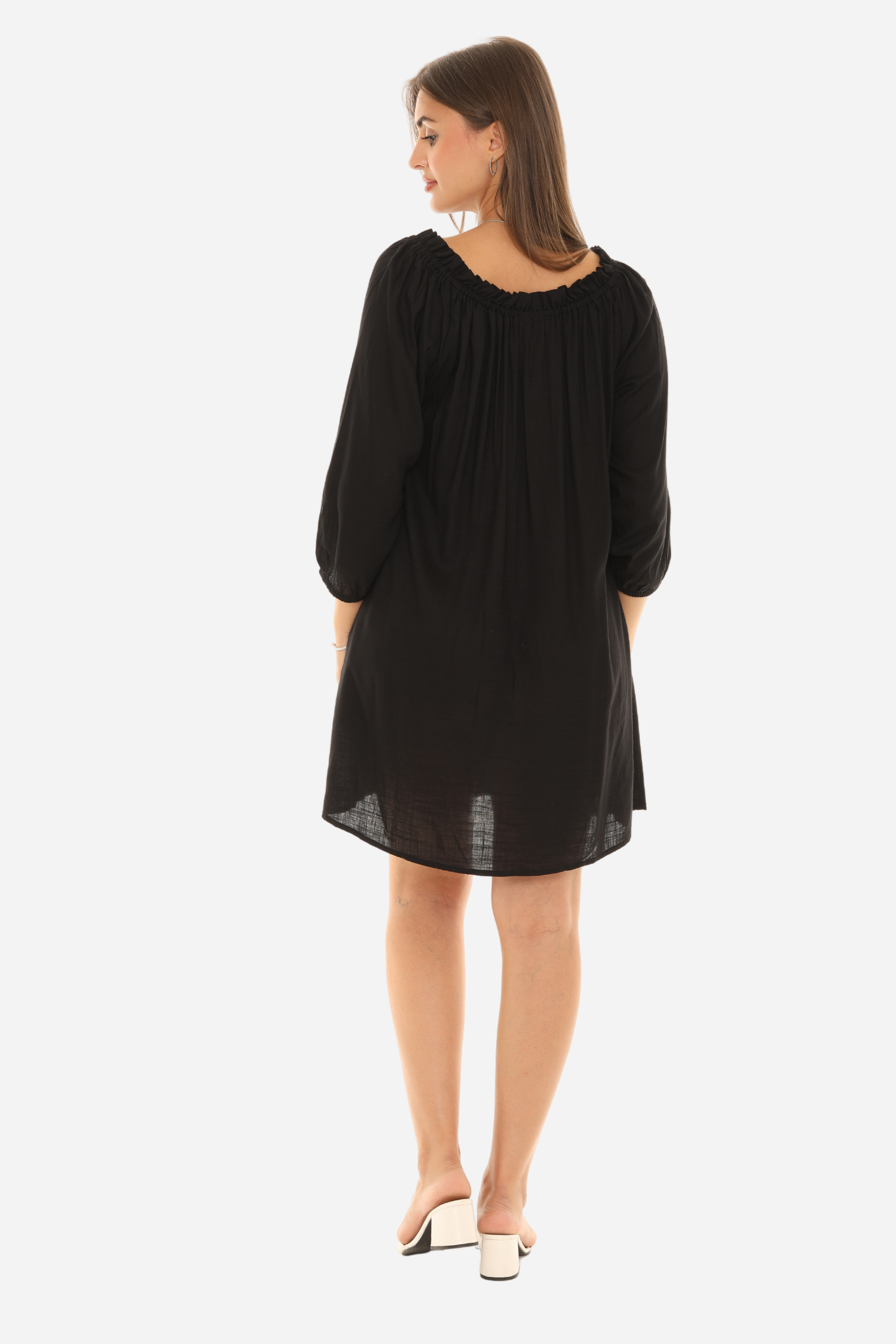 This dress is a classic, timeless piece that is sure to become a staple in your wardrobe! It features a smocked neck, notch neckline, and a shift silhouette that is flattering on any body type. The fabric is lightweight and comfortable, so you can wear it from day to night with ease.