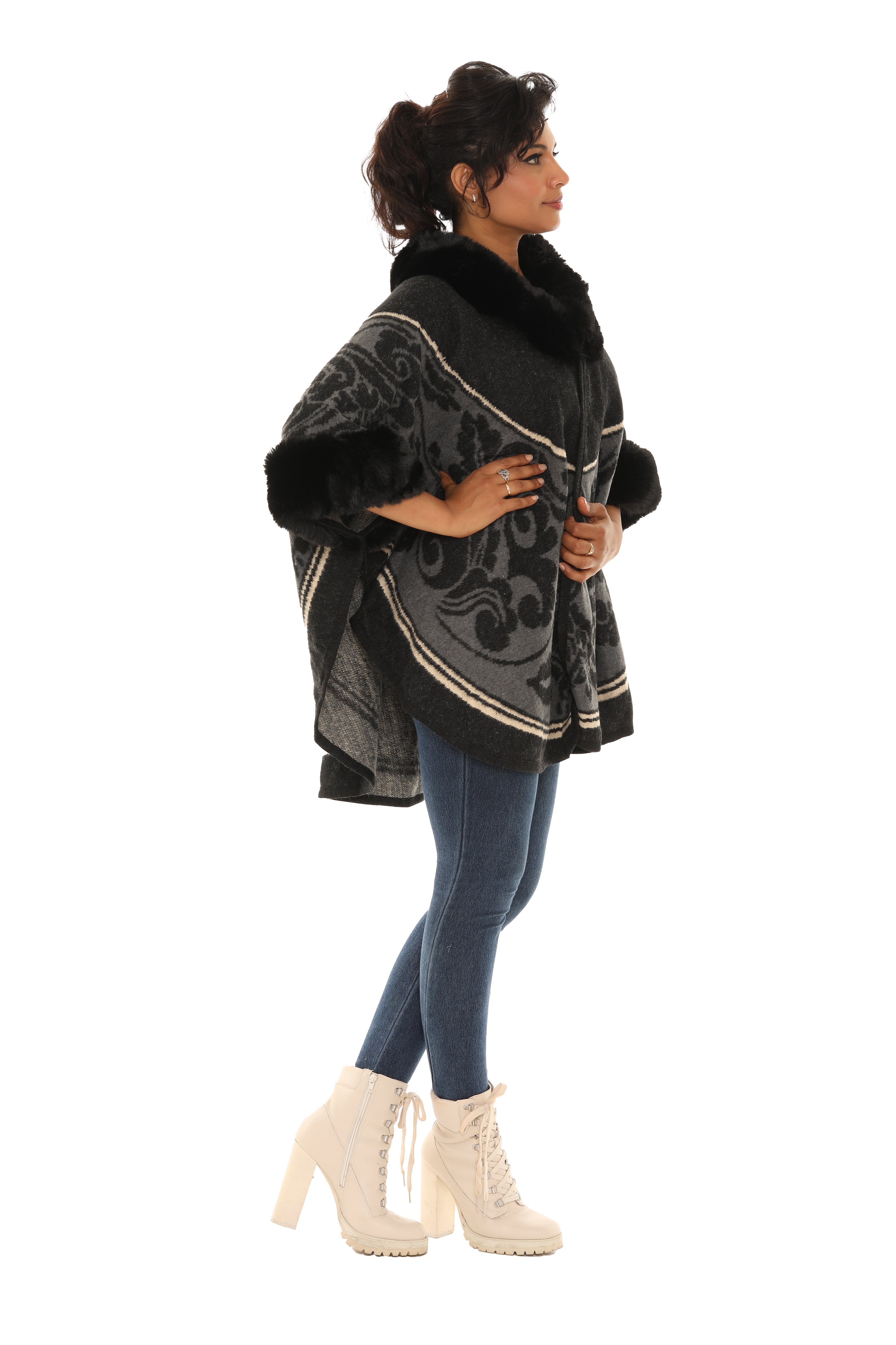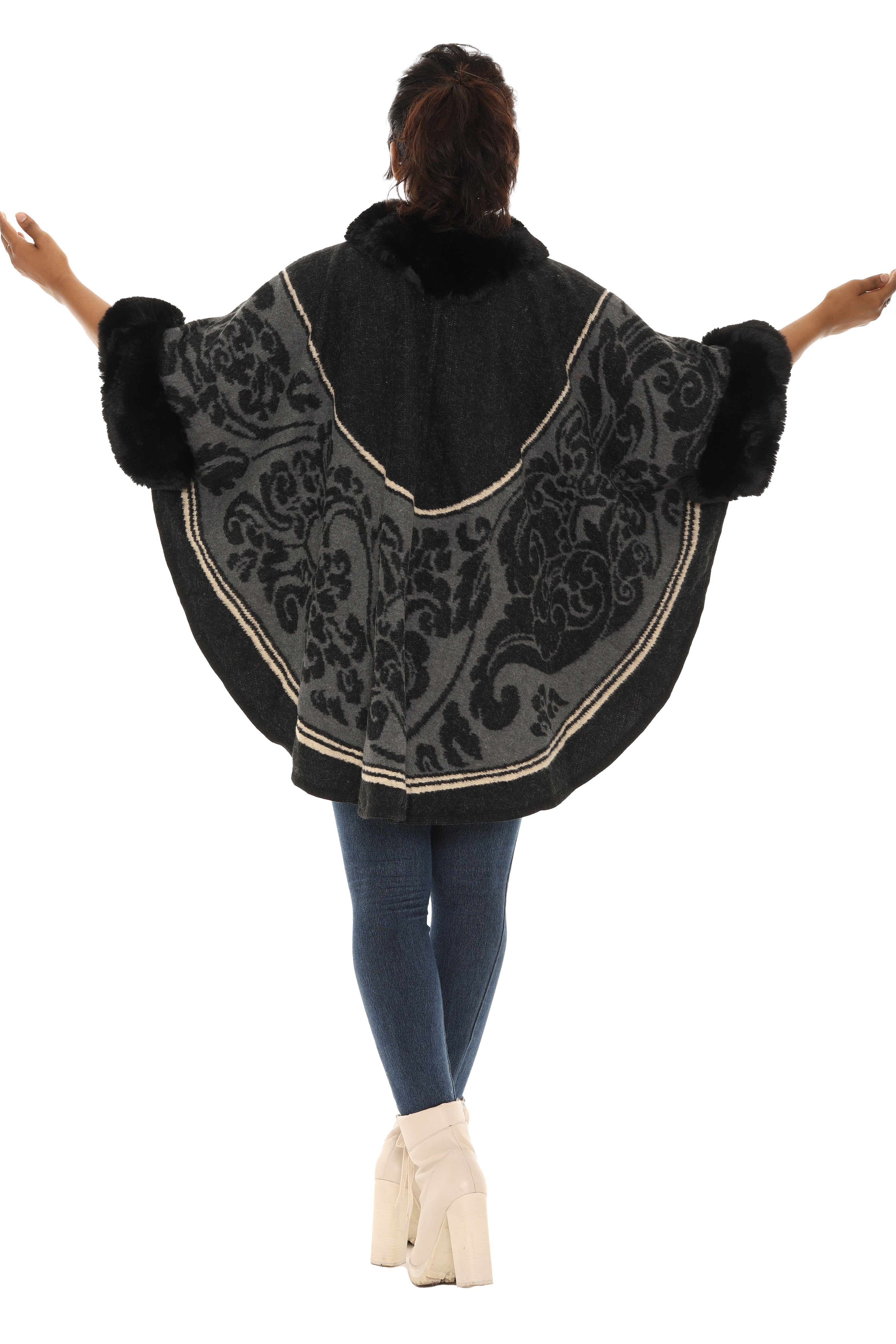 Faux Fur Trimmed Retro Floral Print Black and Gold Poncho
