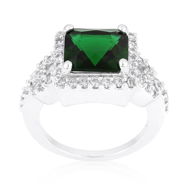 Crafted from rhodium and embellished with fine cut cubic zirconia this halo style ring features emerald and white cubic zirconia that will sparkle on your finger anywhere. Our genuine rhodium finish is achieved using an electroplating process that coats the item with heavy layers of rhodium a close cousin to platinum which gives our jewelry a platinum luster.