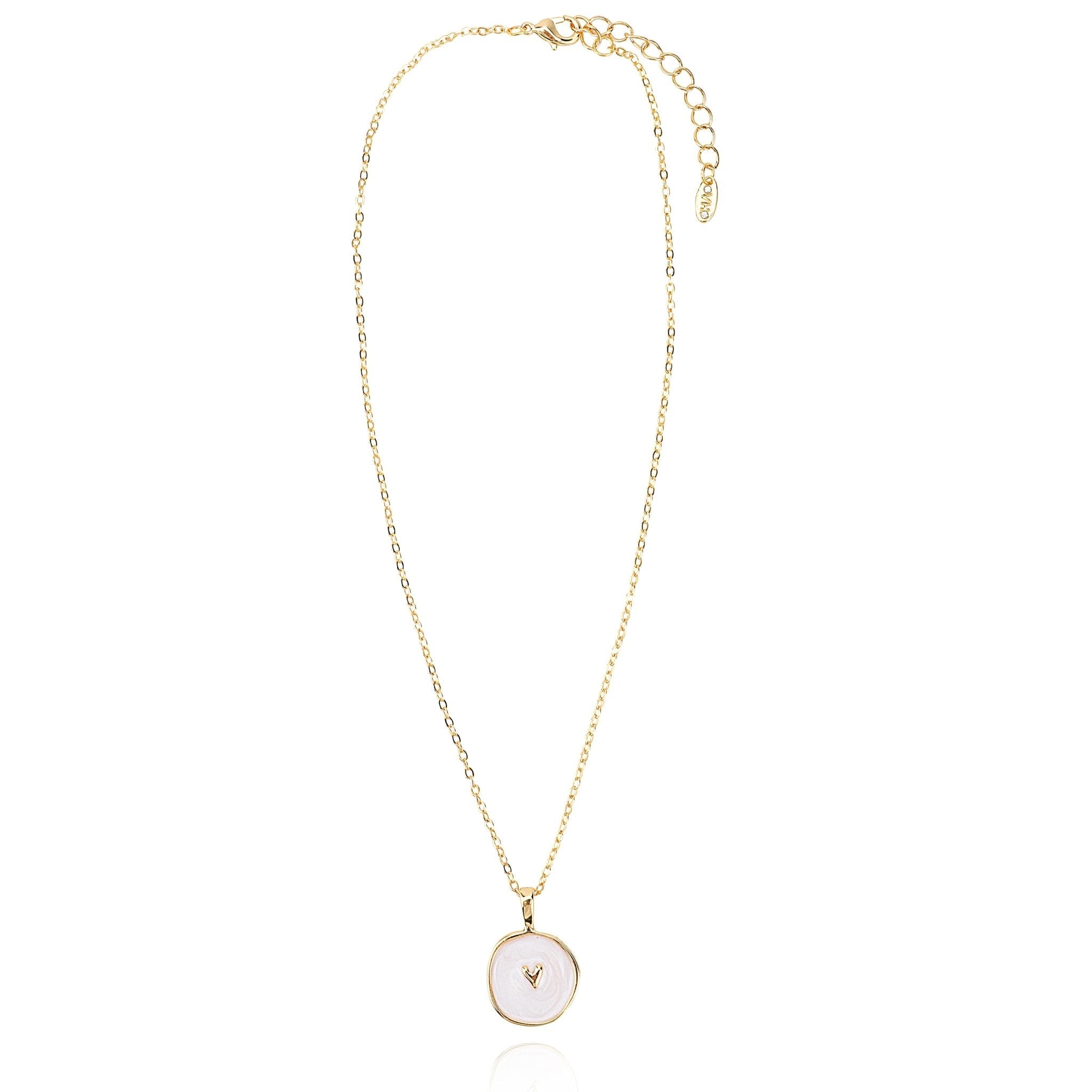 The DAPHNE Necklace features a copper base with elegant 18K gold plating, offering both durability and a luxurious finish. Measuring 15.5 inches with a 2.35-inch extension, it provides a versatile fit for various necklines. The pendant, sized at 5/8 inch, adds a subtle yet sophisticated touch to your look, making it perfect for everyday wear or special occasions.