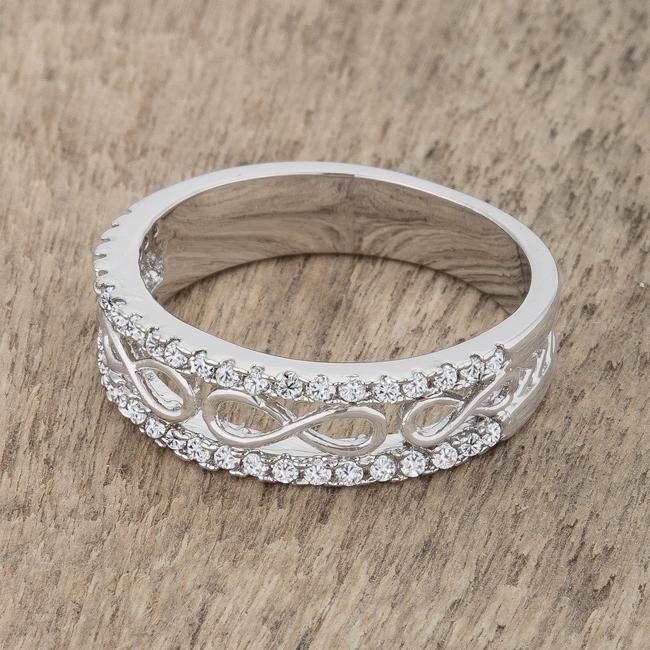 Small clear stones accent a classic band ring topped off with infinity designs.