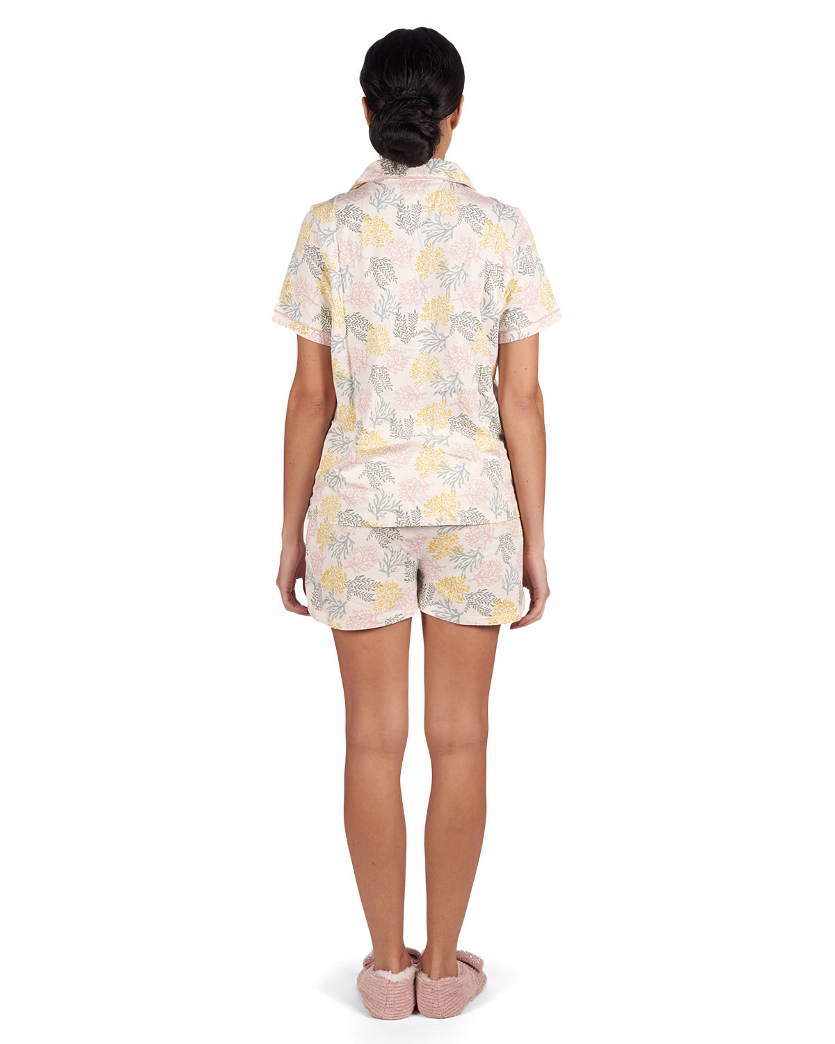 Give up sleepless nights, and get better zzz's in our Coral Reef Notch Collar PJ Set. Ultra soft cotton and rayon yarns are woven together to create a timeless silhouette. Featuring a silky smooth and breathable button front top with short sleeves and a single chest pocket, and short bottoms that are flattering, lightweight, and finished with a classic contrast piping trim detail. Designed with an adjustable and stretchy drawstring waistband that's ideal for napping, relaxing, and everything in between. Built to last, enhanced knit prevents pilling so you can enjoy these from season to season. They come in a coordinating drawstring bag for easy gifting and transportation.P.S. This set might make it difficult to get out of bed in the morning.