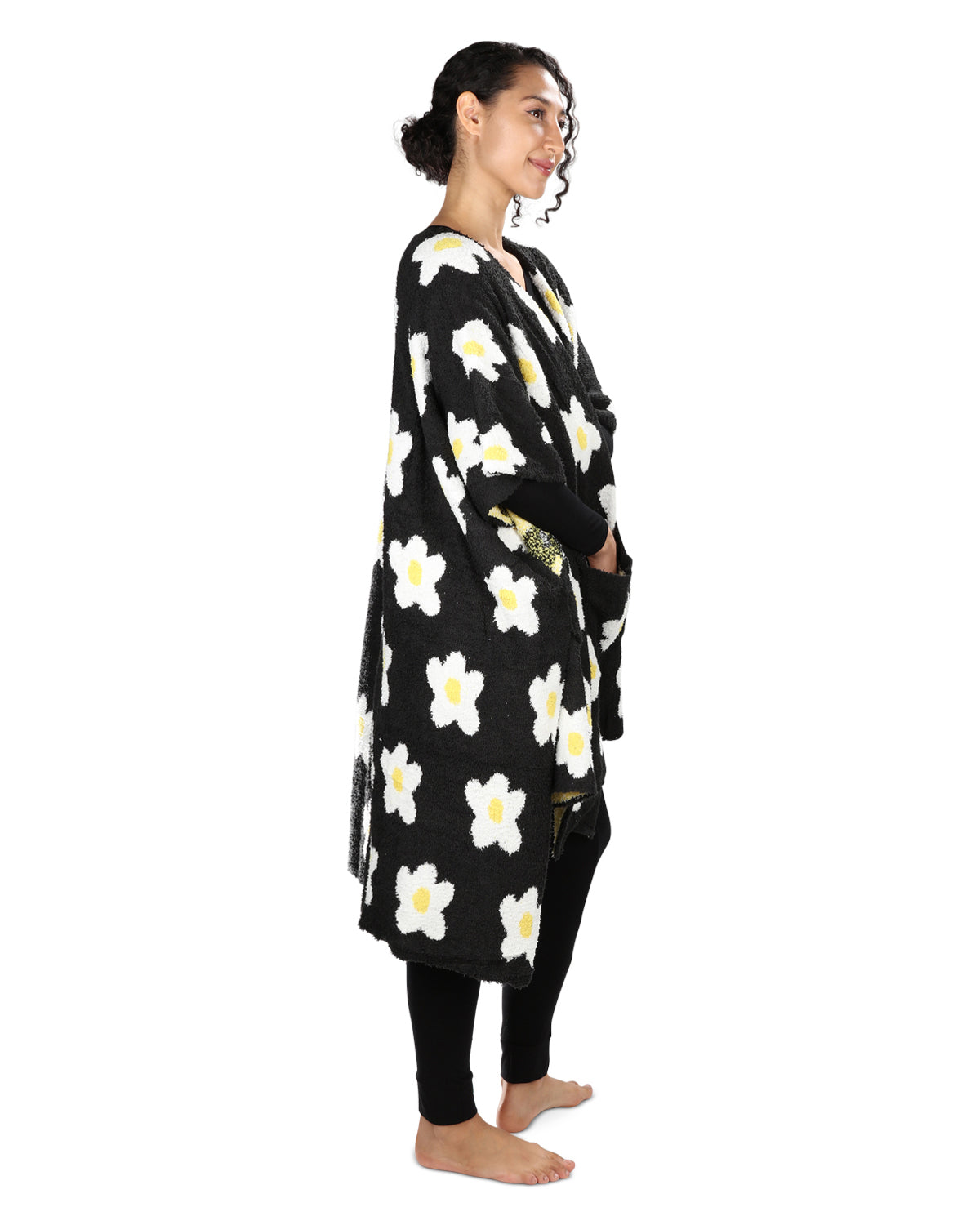 Stepping out in chilly weather? Or simply cuddling on the couch? Either way, you'll love this cozy ruana with its eye-catching daisy graphics. It's crafted for blissful softness with our ultra-plush fabric blend. And it's loaded with special features designed to enhance your ease — like wide kimono sleeves and roomy hand-warming pockets.