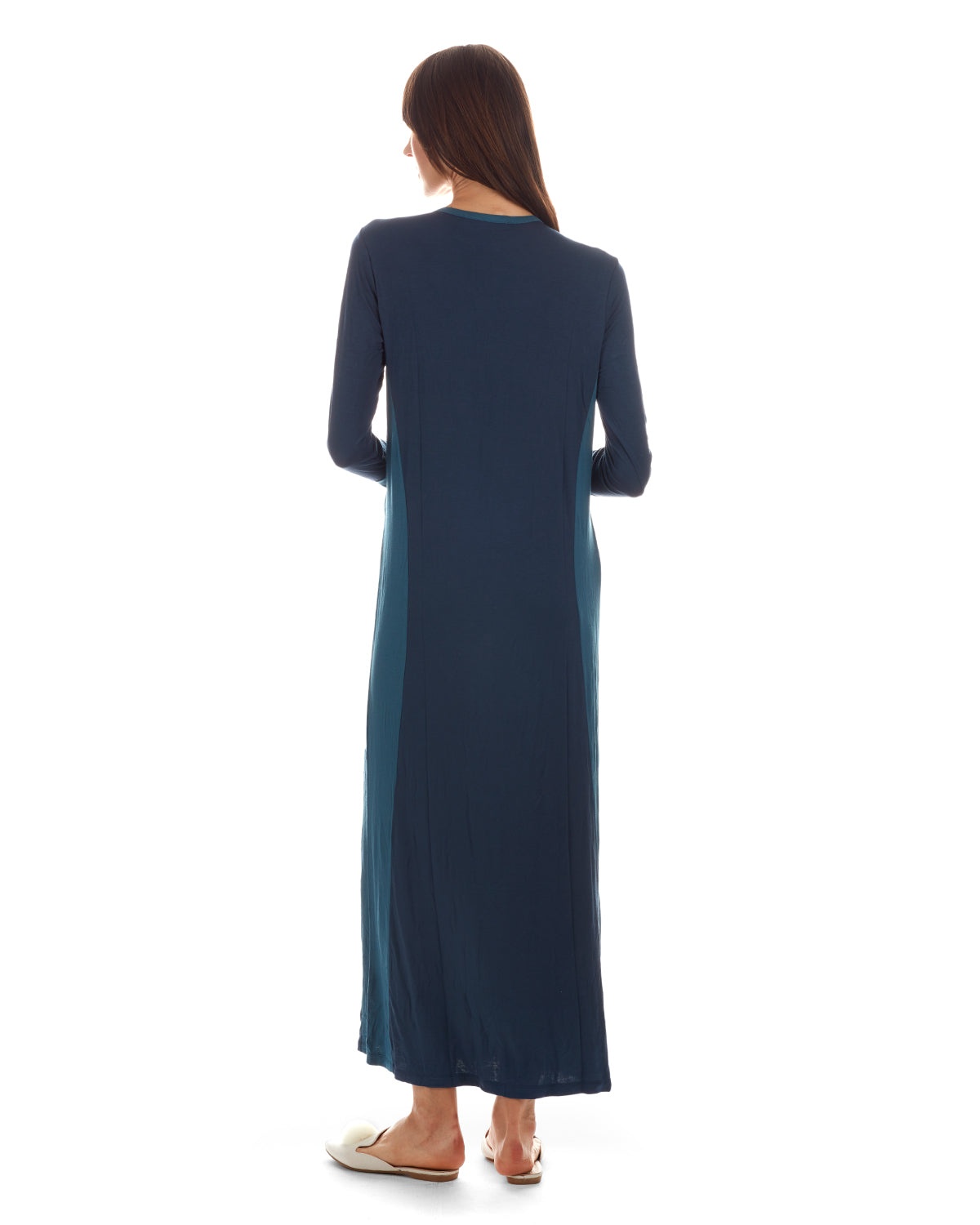 Our Two-Tone Long Gown is the perfect way to show off your many stylish sides. With a line of pretty, shimmery buttons adorning the chest, as well as button accents on the cuffs, this modal fabric gown is both comfortable for all night wear and stylish enough to lounge in during the day. Turquoise cuffs and panels on a deep blue base make this long gown a subtle yet sure statement.