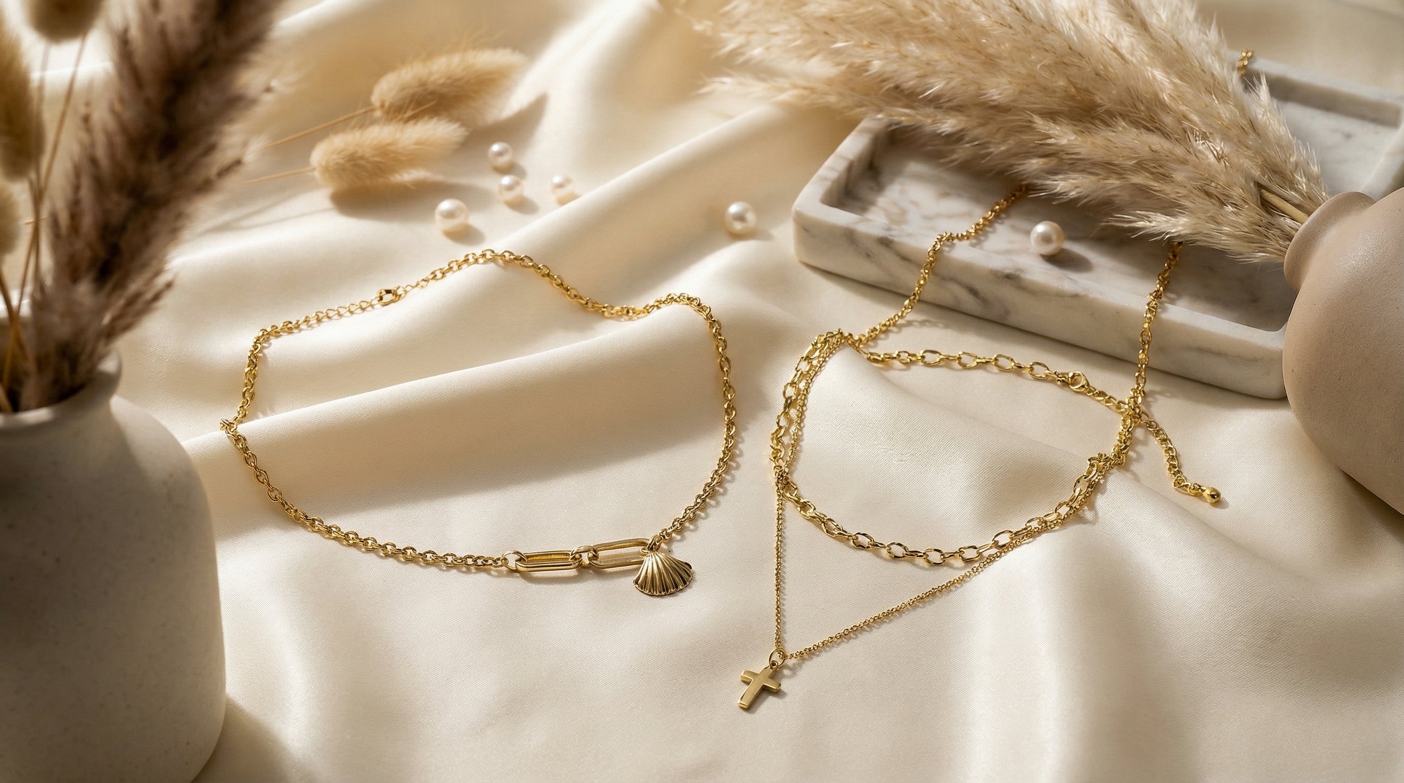 Make a splash with this three-row gold necklace, featuring a playful shell pendant. This quirky piece adds a touch of fun to any outfit, making you the life of the party. So go ahead, shell-ebrate your unique sense of style with this statement accessory.
