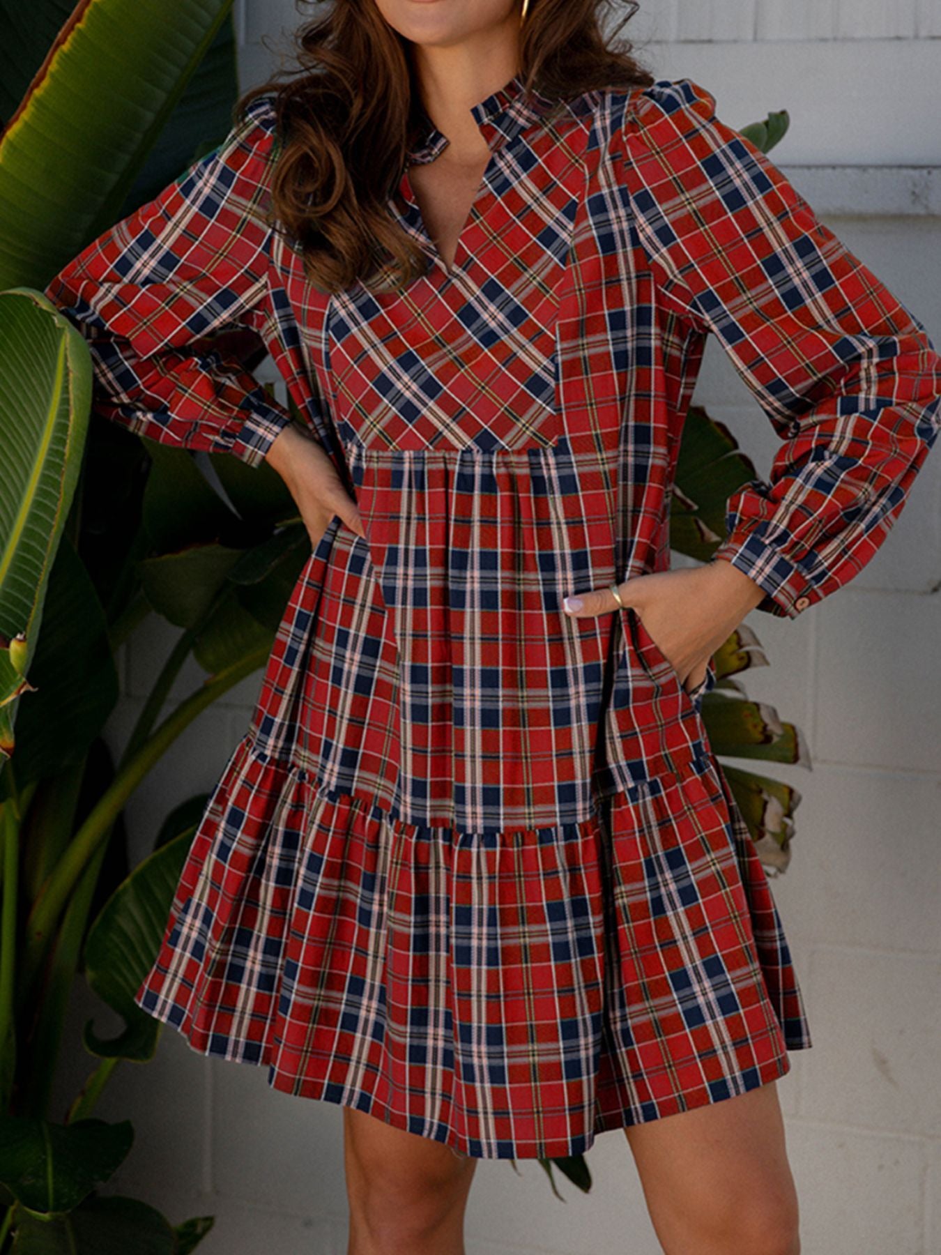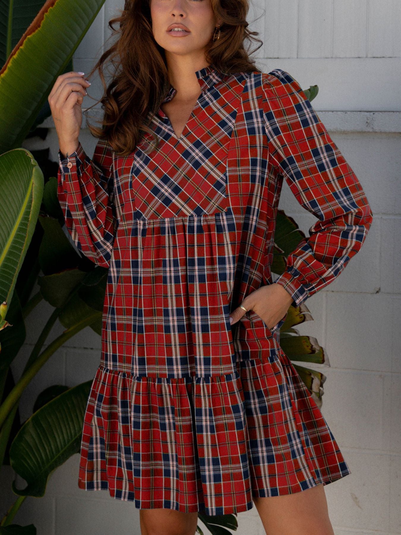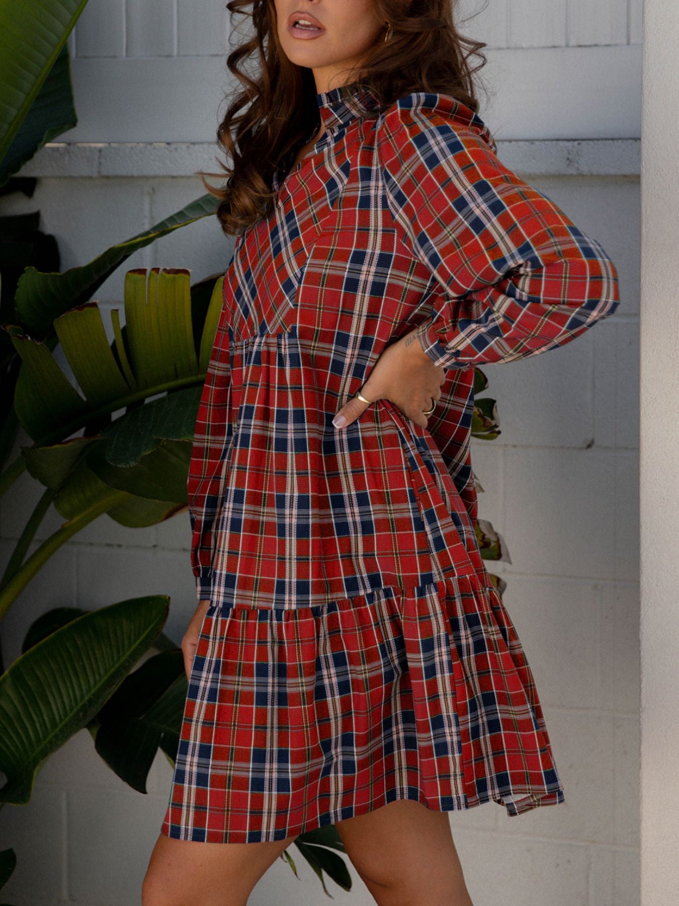 Plaid Print Frilly Collar Long Sleeve Shift Mini Dress