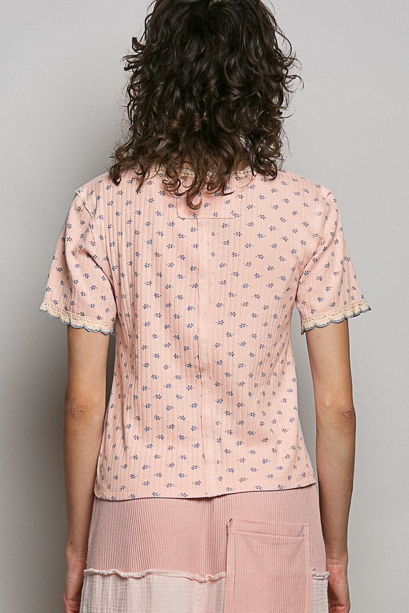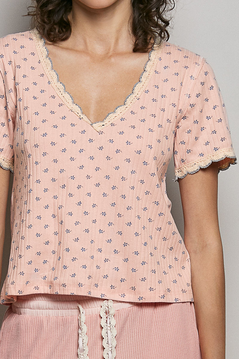 POL Floral V-Neck Short Sleeve Rib T-Shirt