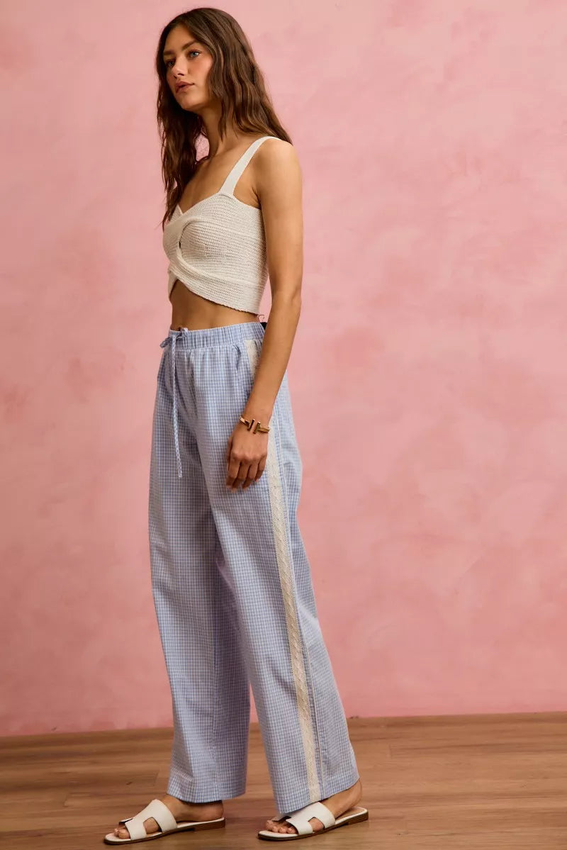 These wide check pants feature a stylish side lace trim and piping detail for a chic and fashionable look. The check pattern adds a trendy touch, while the lace trim and piping accents elevate the overall design. The wide legs offer a relaxed and comfortable fit, making these pants perfect for both casual and dressed-up occasions. Pair them with a simple top and heels for a sophisticated ensemble, or dress them down with sneakers for a more laid-back vibe. With their unique combination of details, these pants are sure to make a statement in your wardrobe.