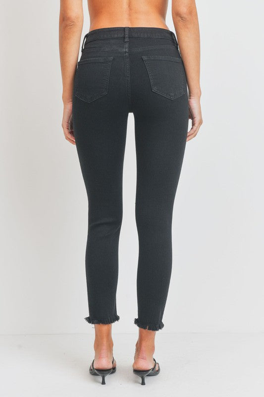 MID RISE SKINNY JEANS WITH KNEE SLIT DISTRESS AND FRAY HEM IN BLACK DENIM