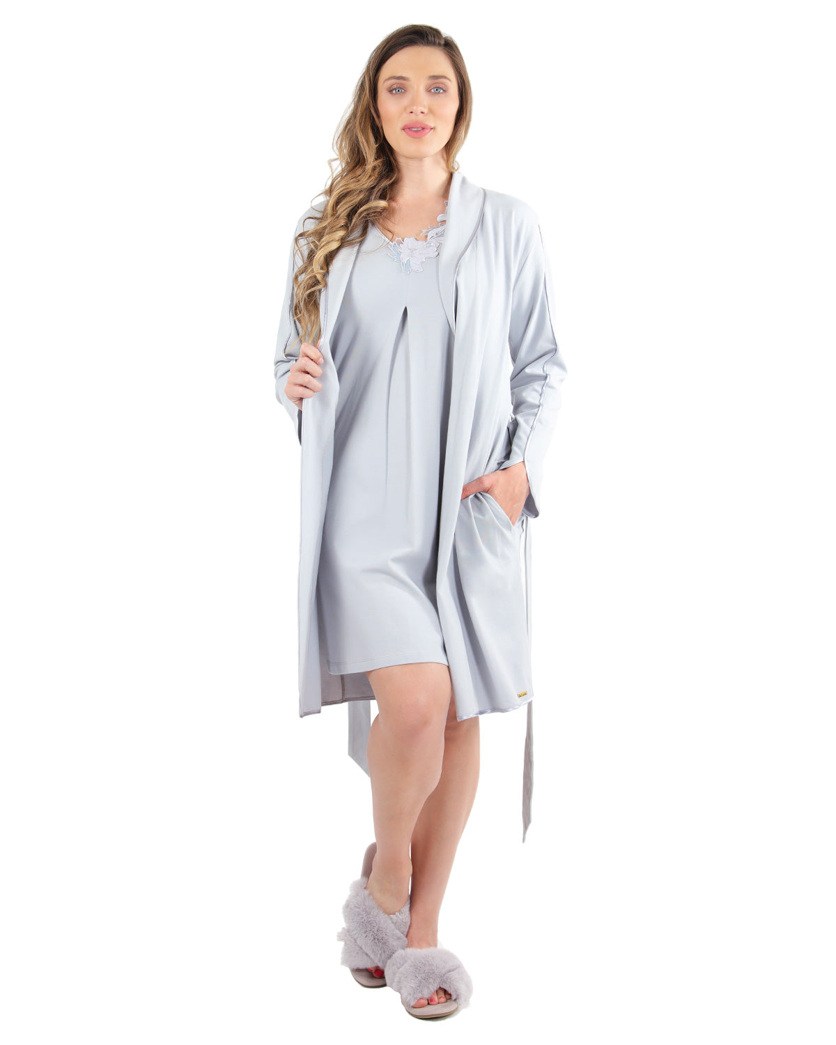 Women's Lace Applique Cotton Blend Robe with Satin Weave Trim