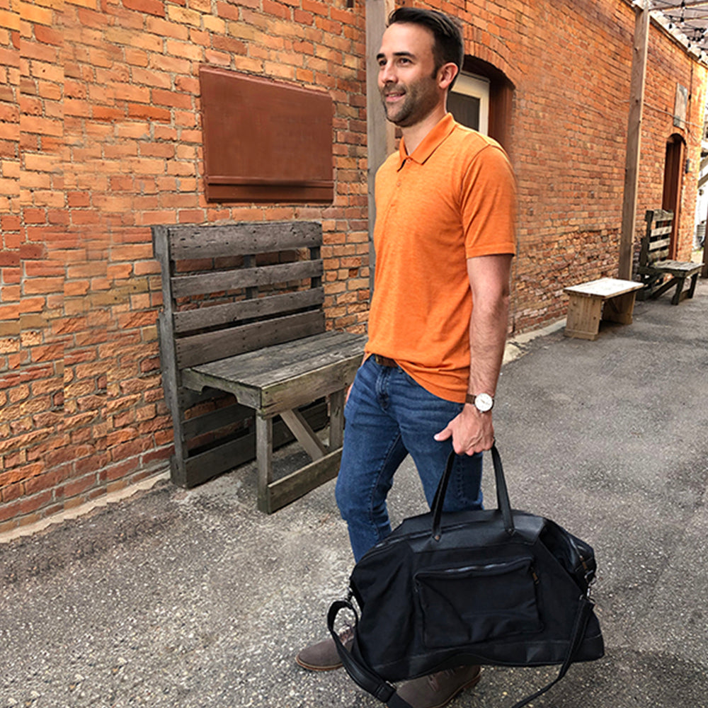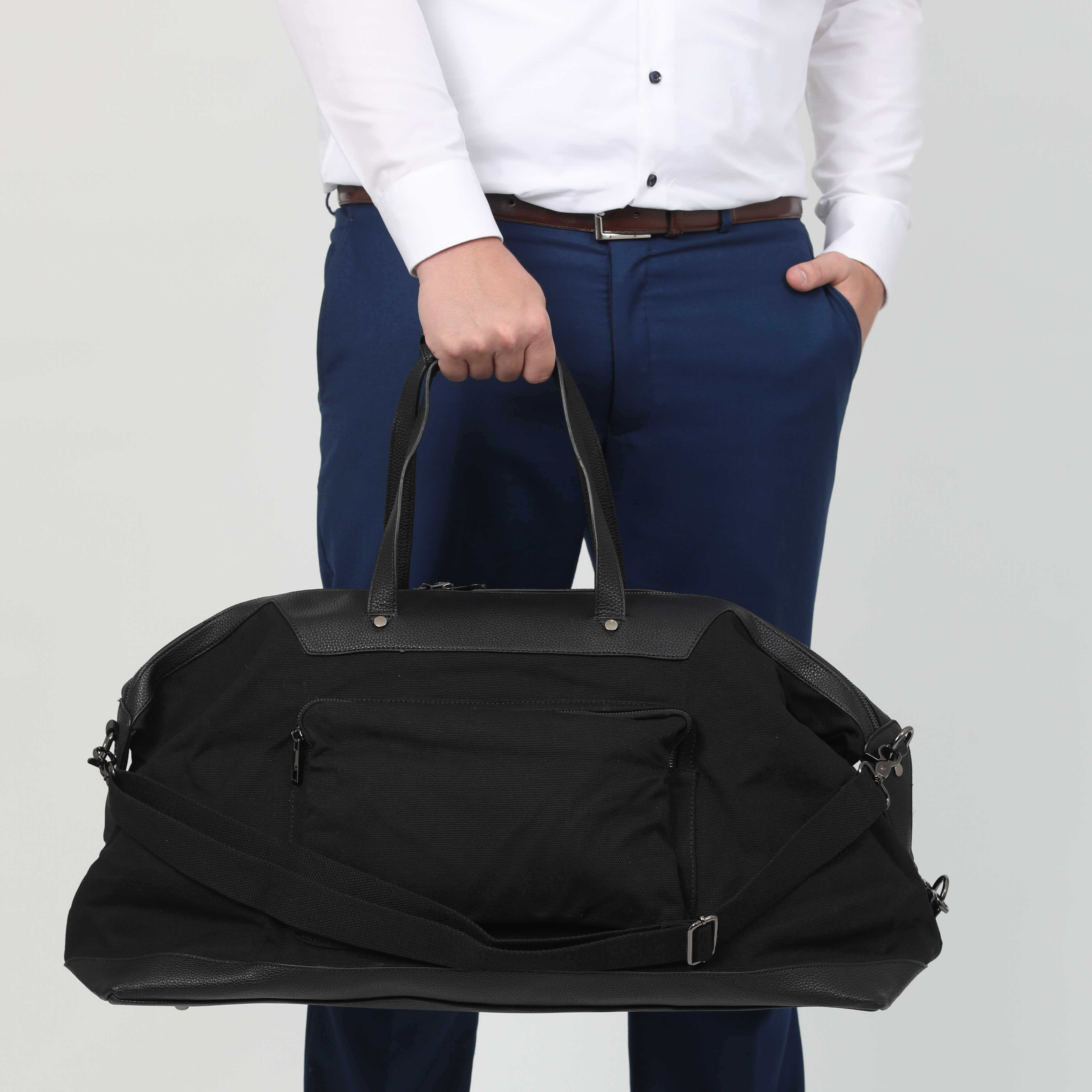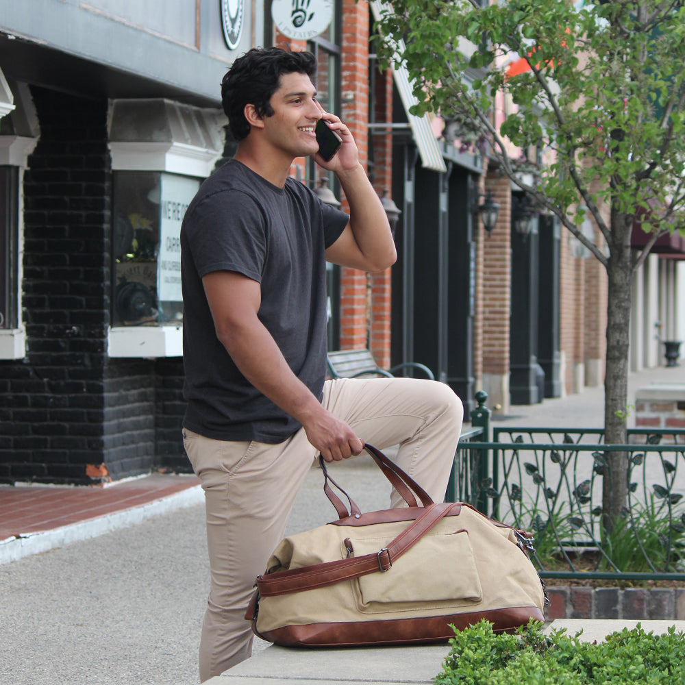Perfect for the weekend car trip, carry-on bag or even a gym bag - when you need to bring just a little bit more than the basics. Combined vegan leather and canvas - the vegan leather on the bottom makes for easy cleaning. Two outside zippered compartments gives you quick access your phone, passport, whatever you need.