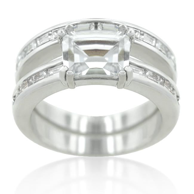 The Princess Baguette Wedding Set features a set of baguette accented bands with a wondrous clear cubic zirconia center. Our genuine rhodium finish is achieved using an electroplating process that coats the item with heavy layers of rhodium a close cousin to platinum which gives our jewelry a platinum luster.