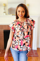 Add casual charm to your closet with this woven tropical floral top featuring a tie V neck for your fav accessories. Short raglan flutter sleeves finish this stunning top.