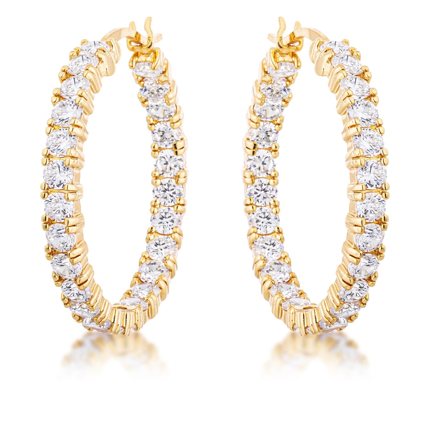 The possibilities are endless with these inside and outside channel set round cubic zirconia 18k gold plated eternity hoop earrings. They match almost anything subtle enough to wear everyday but beautiful enough to make you shine.