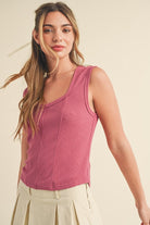 Adelle tank is a must have for your basics. She's featuring a sweetheart neckline. The ribbed fabric adds texture, enhancing its casual charm. Mitered seams provide a tailored touch, ensuring a flattering and stylish fit. A versatile piece that effortlessly combines comfort and sophistication.