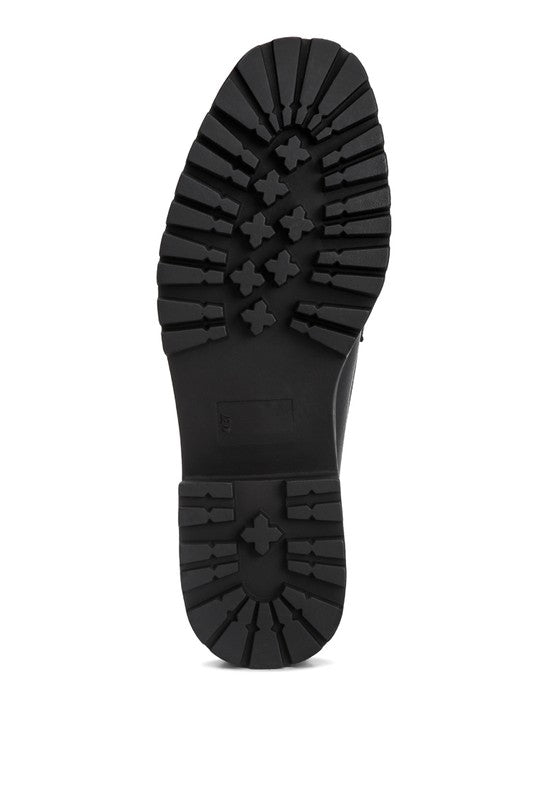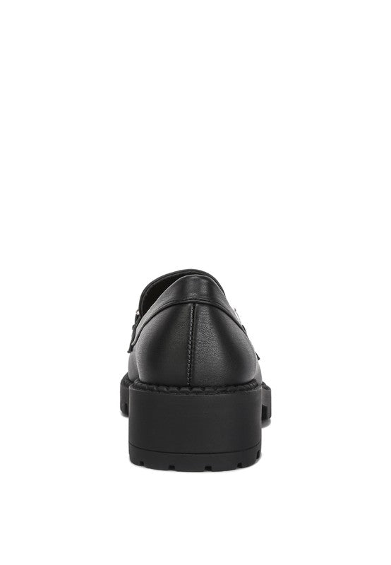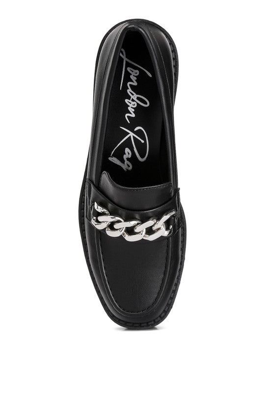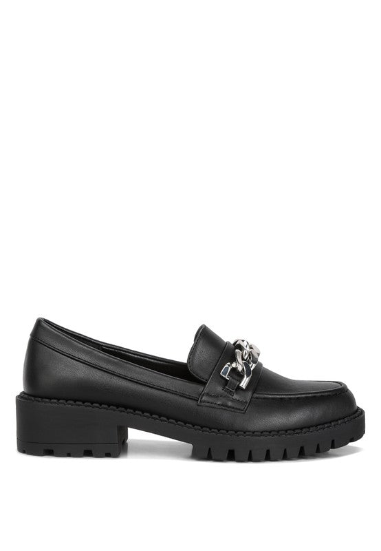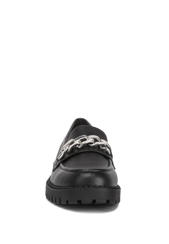Channeling a bold and edgy aesthetic, our Faux Leather Chunky Block Heel Loafers with metal chain accents on top are the epitome of contemporary chic. Crafted from luxurious faux leather, these loafers feature a chunky block heel that exudes both comfort and confidence. The standout element of these loafers lies in the metal chain accents adorning the top, adding a touch of rebellious glamour to the design. Whether you're strutting through the city streets or attending a trendy social event, these chunky block heel loafers will effortlessly elevate your look. The juxtaposition of the chunky heel and the sleek faux leather creates a captivating visual contrast that demands attention.