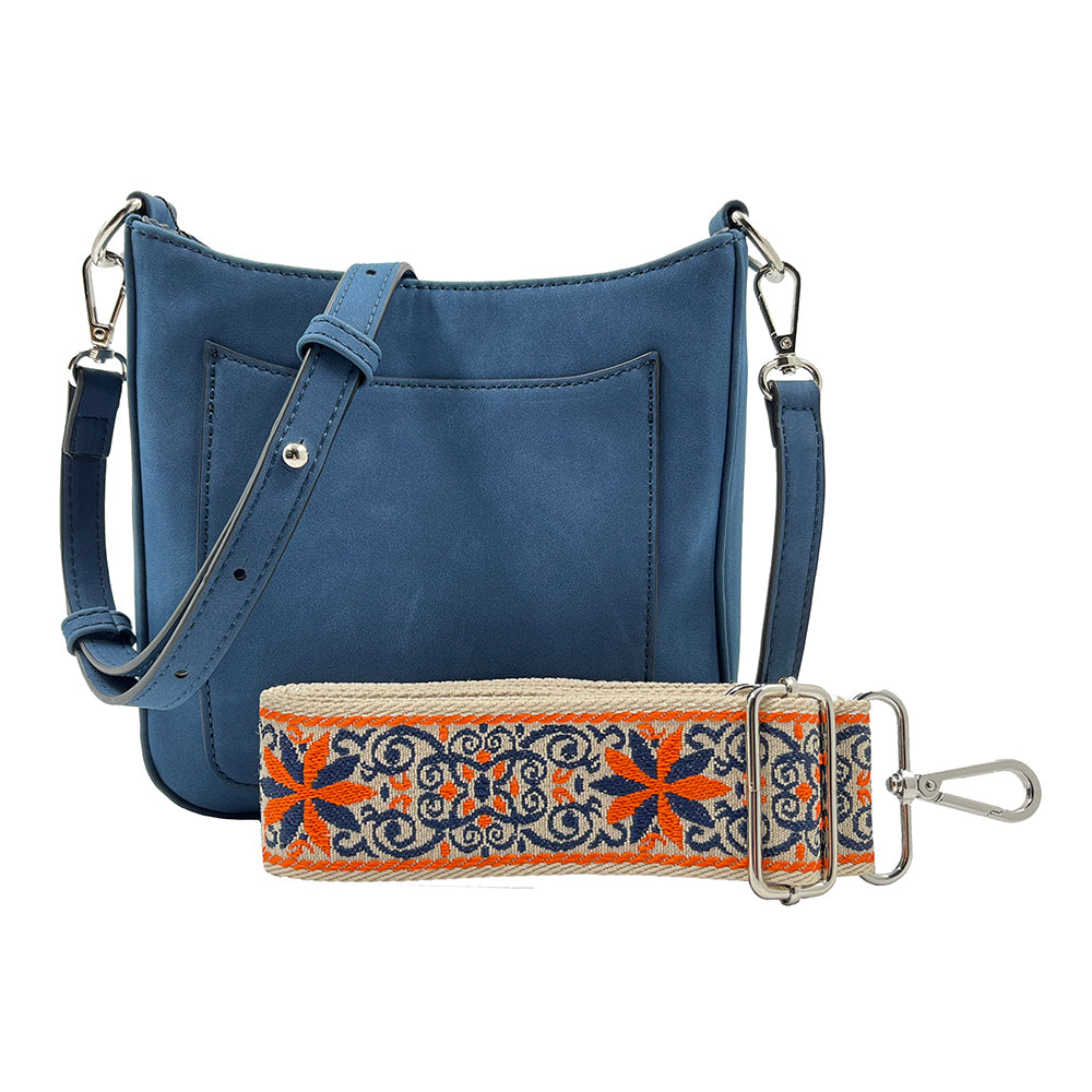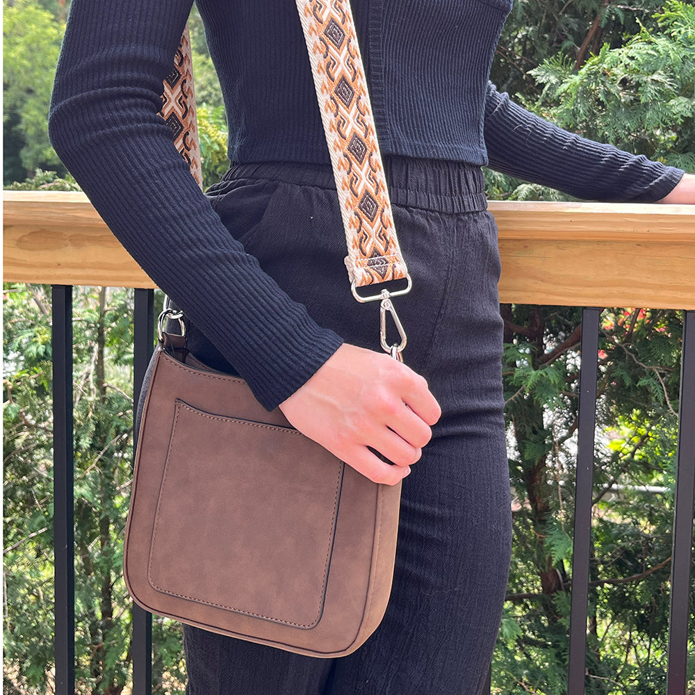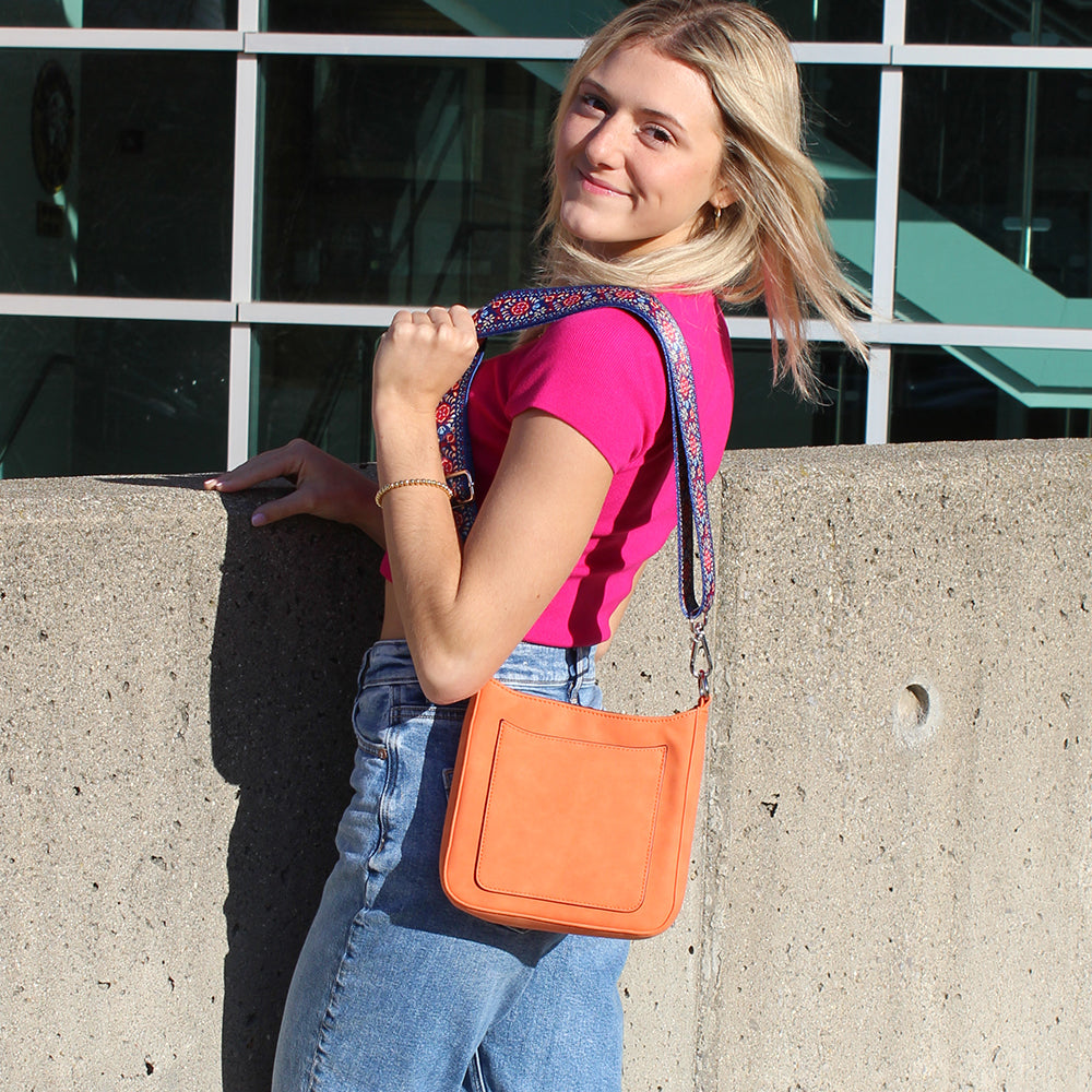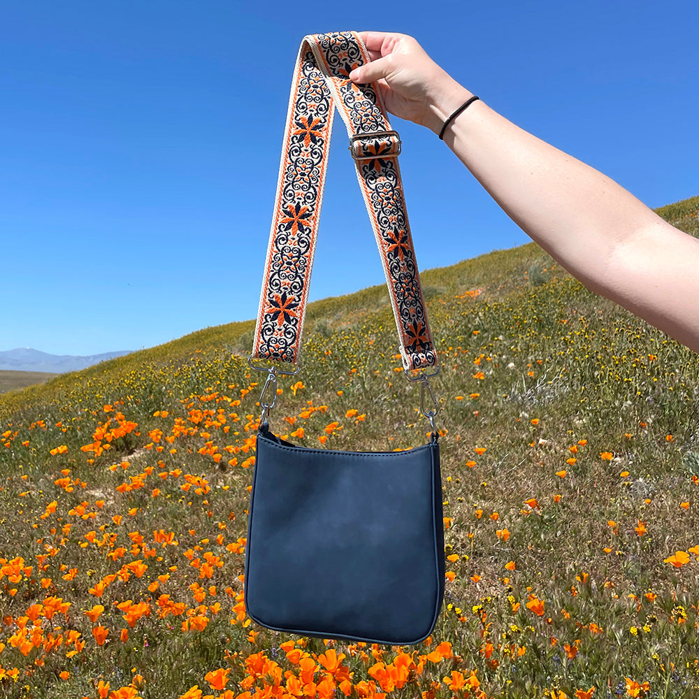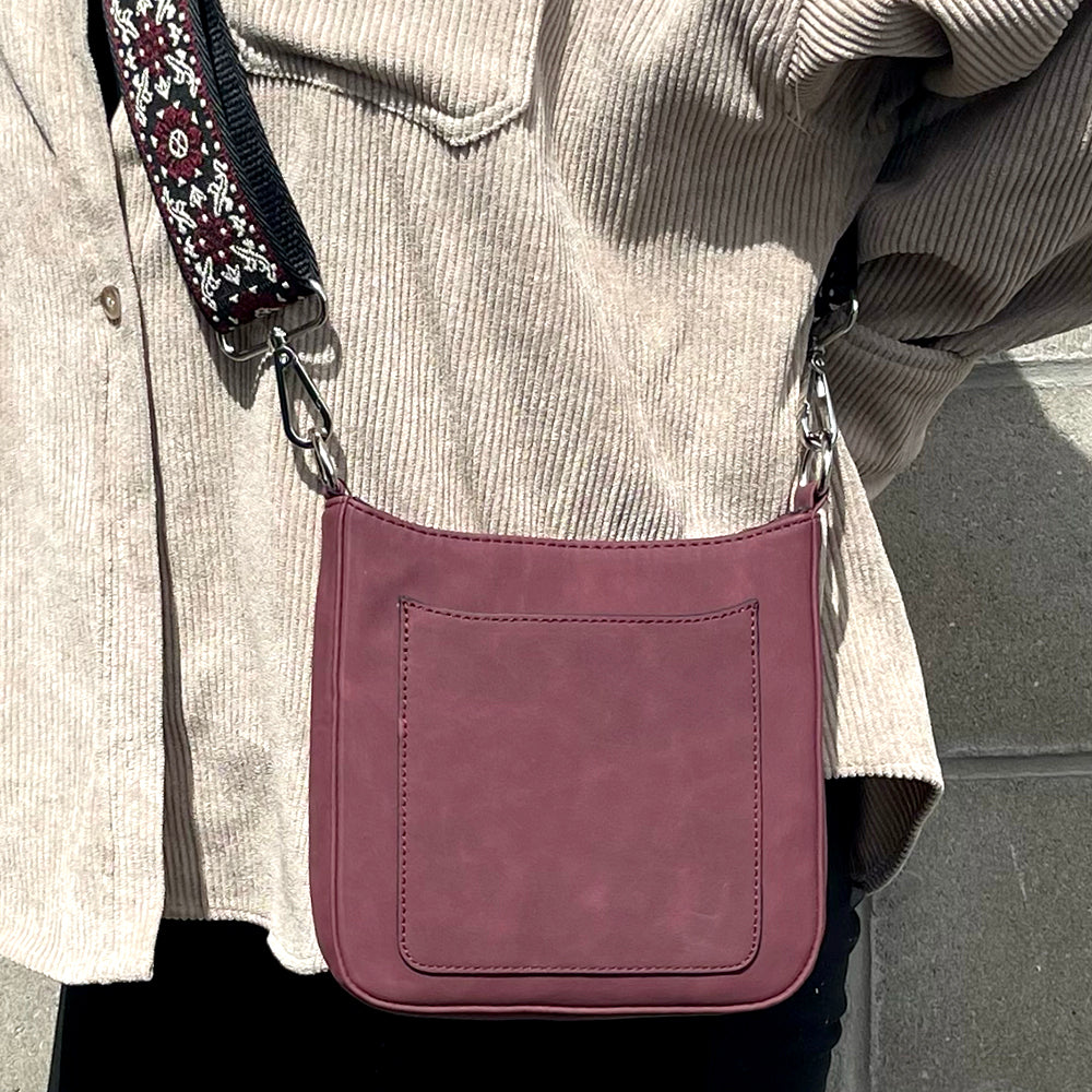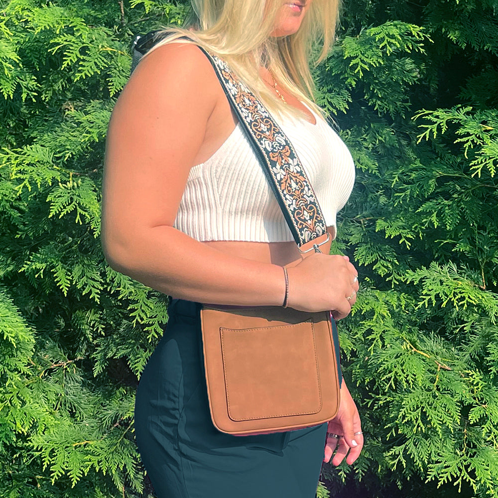 Our new Ashley crossbody features soft and rich vegan suede with vibrant colors. Unique guitar straps complimenting each design. It also comes with a long strap to match the bag.