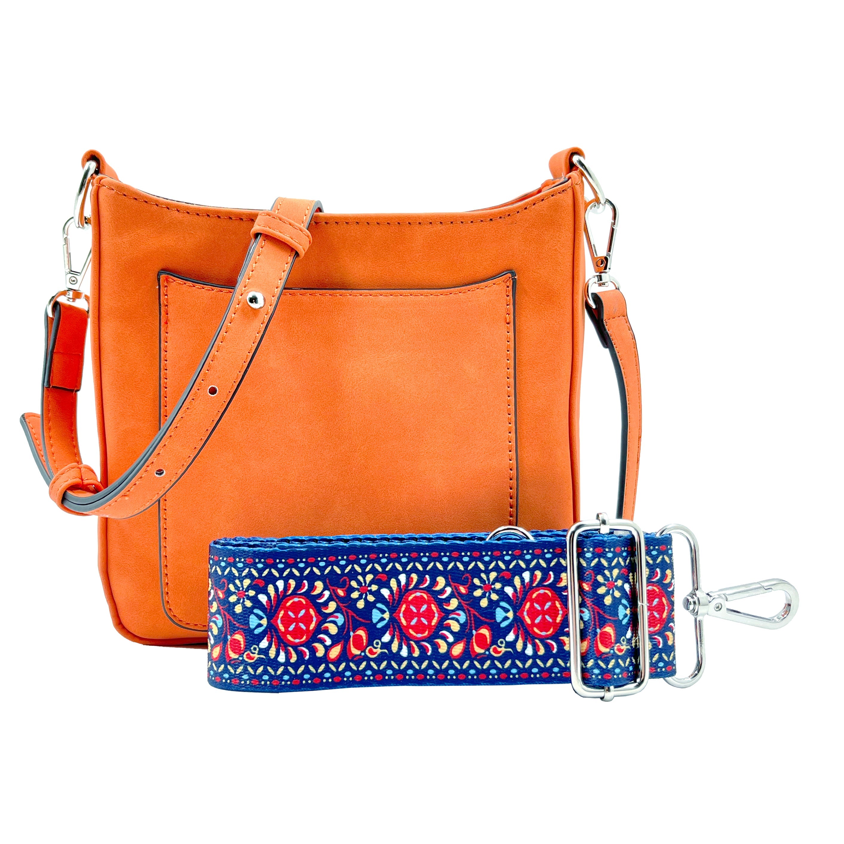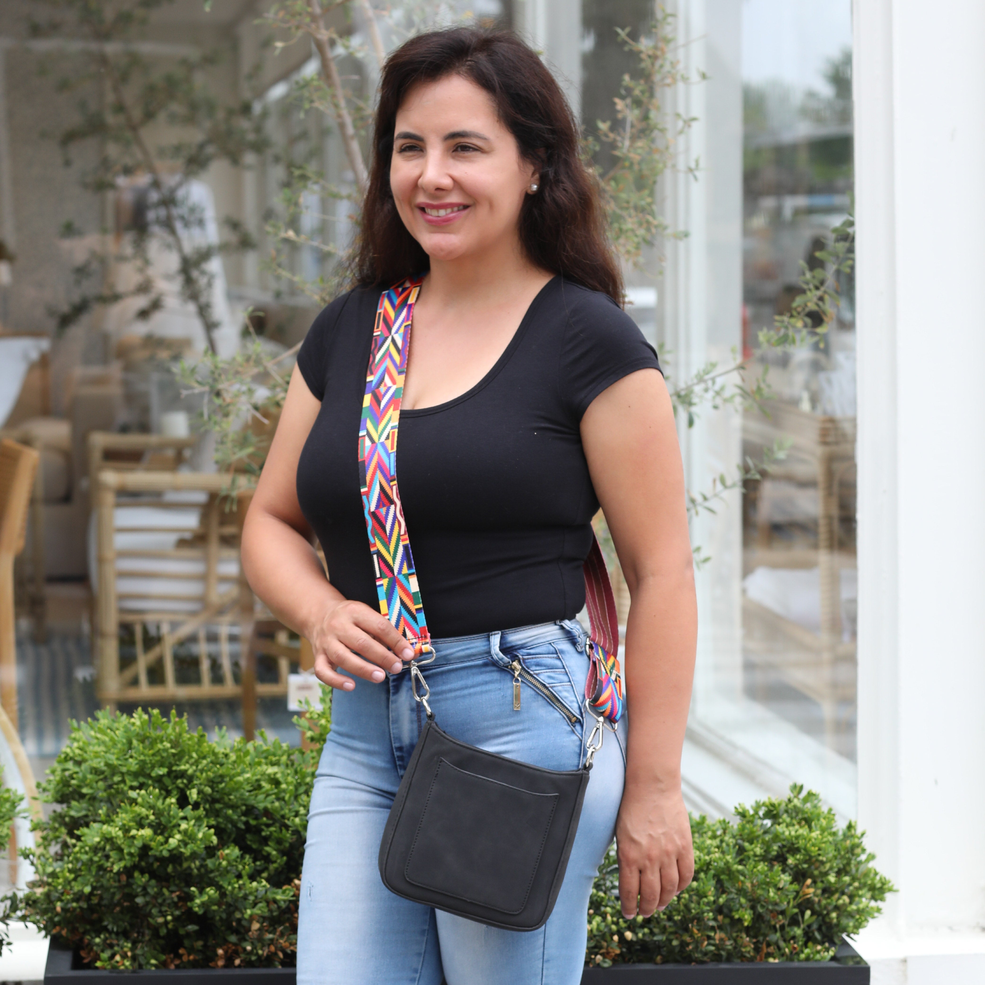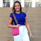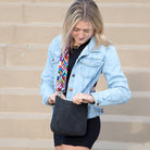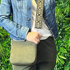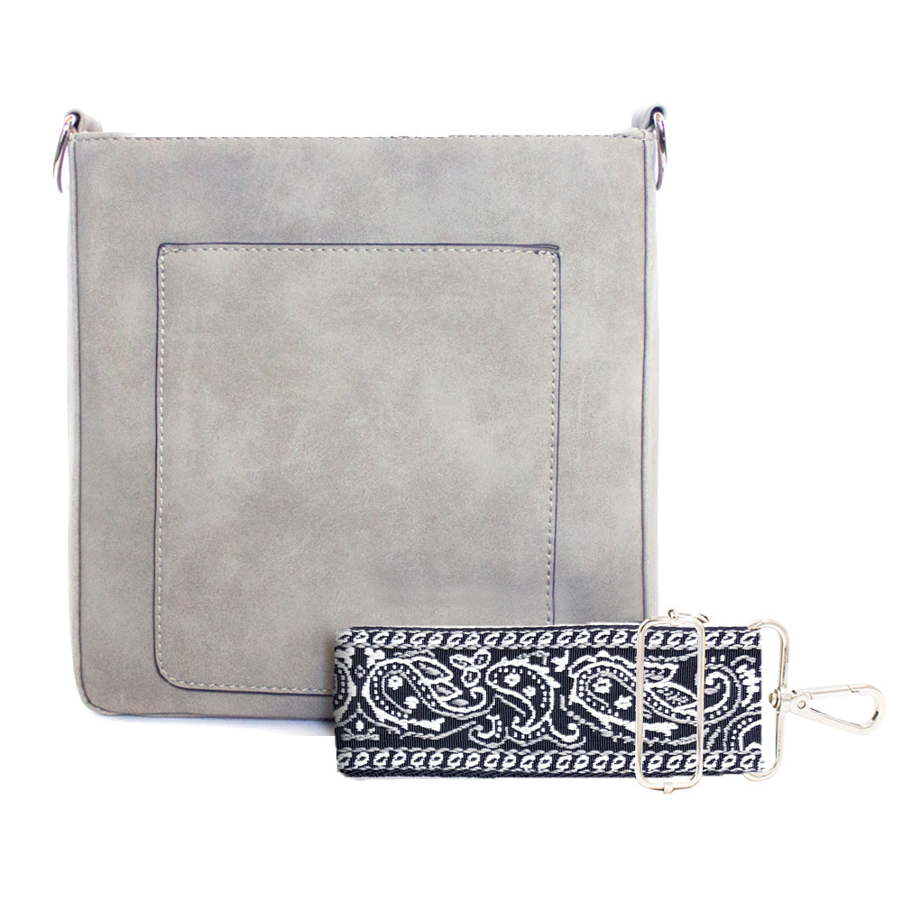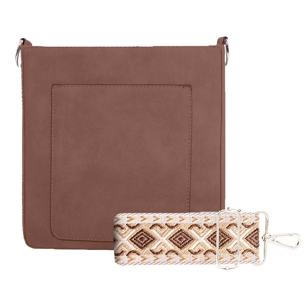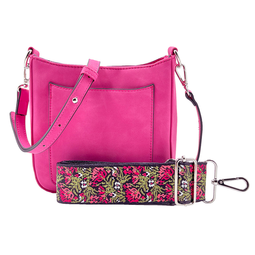 Our new Ashley crossbody features soft and rich vegan suede with vibrant colors. Unique guitar straps complimenting each design. It also comes with a long strap to match the bag.