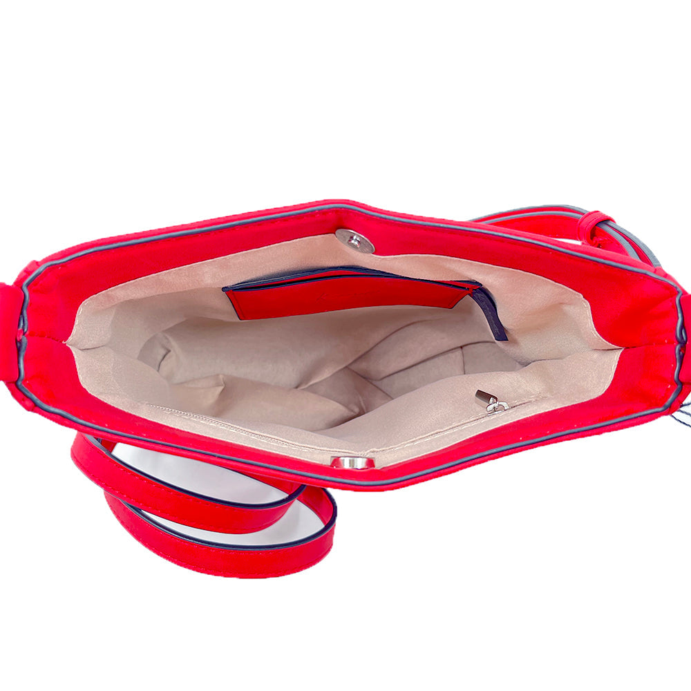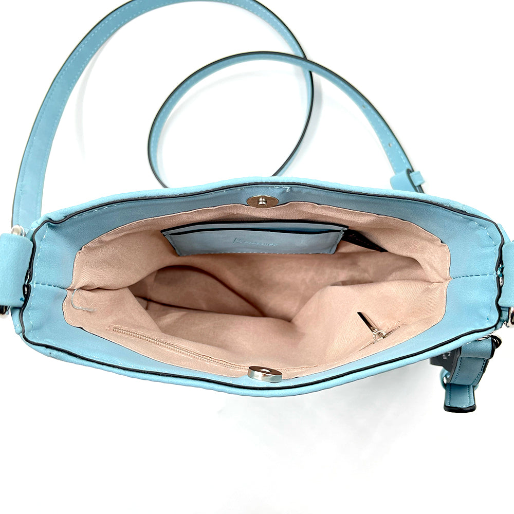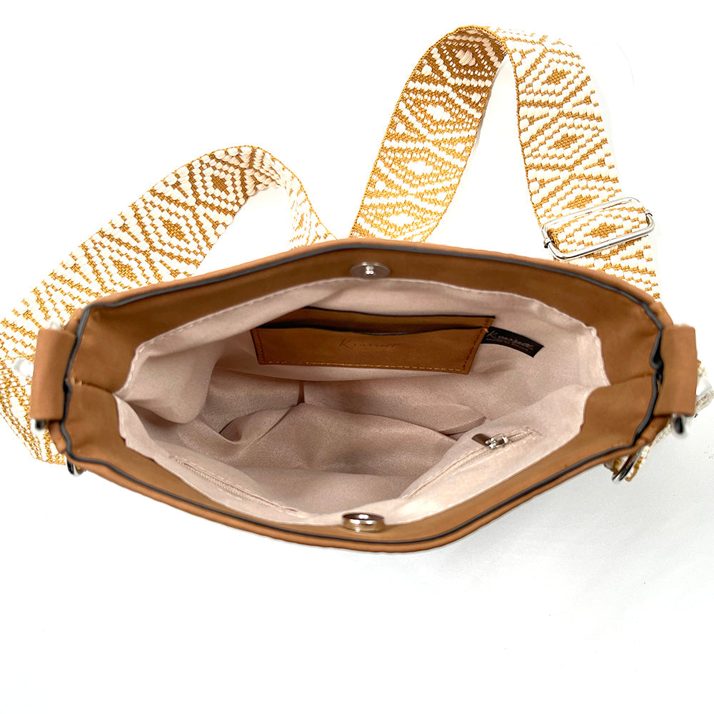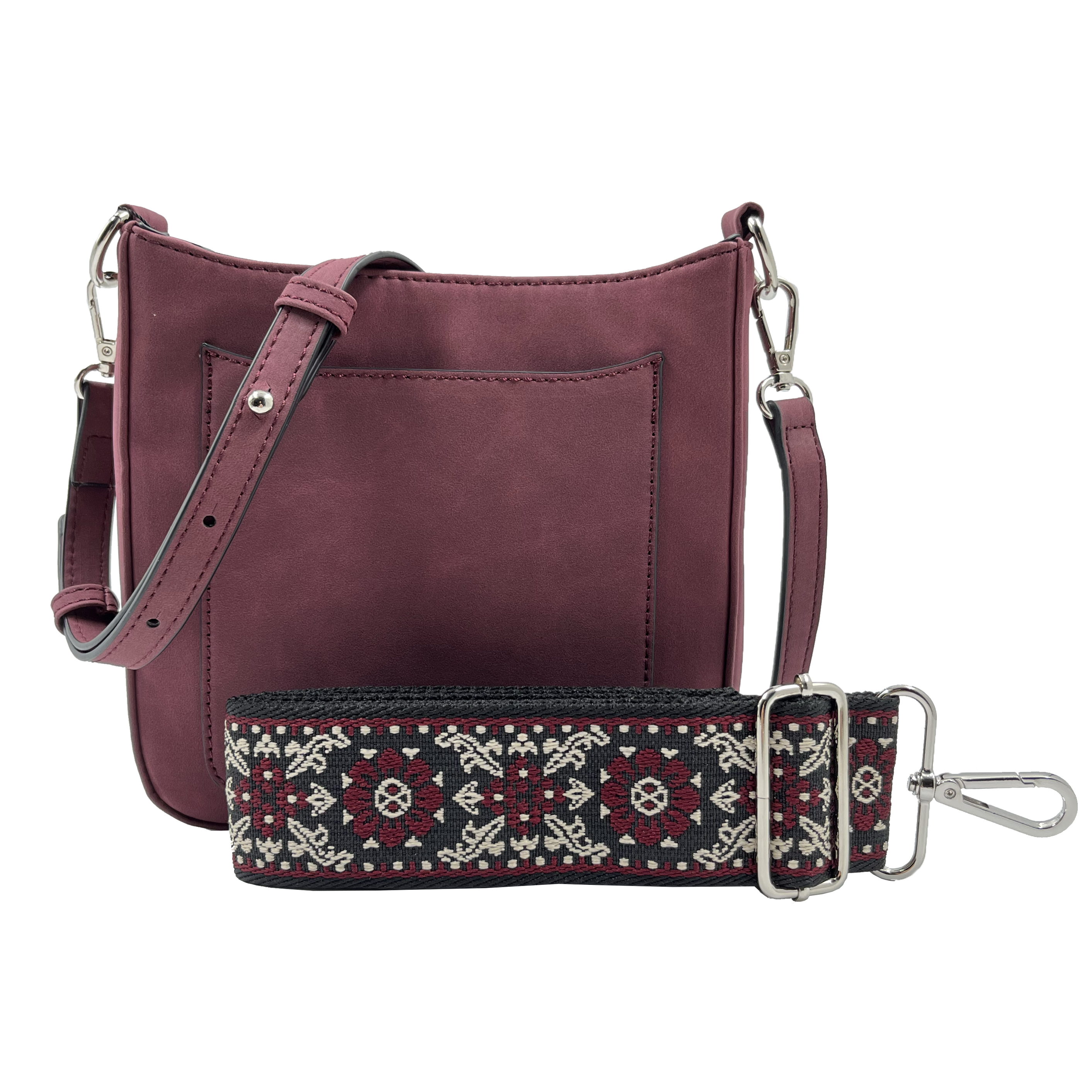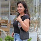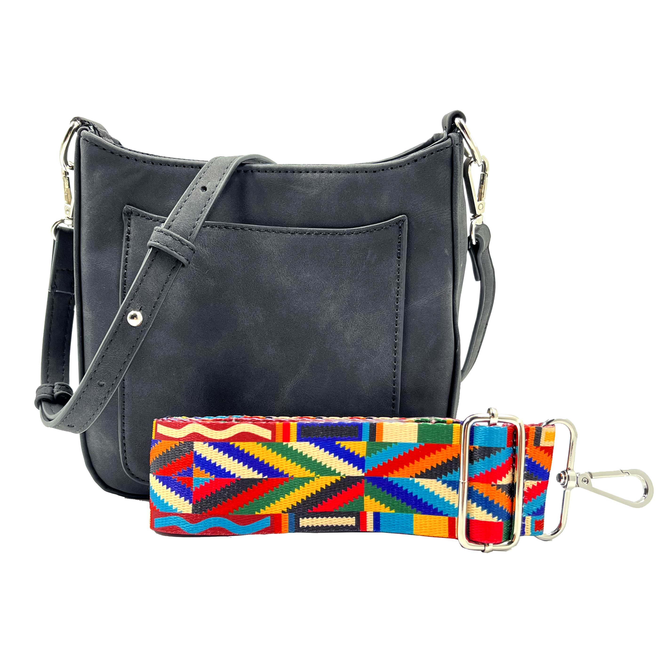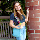 Our new Ashley crossbody features soft and rich vegan suede with vibrant colors. Unique guitar straps complimenting each design. It also comes with a long strap to match the bag.