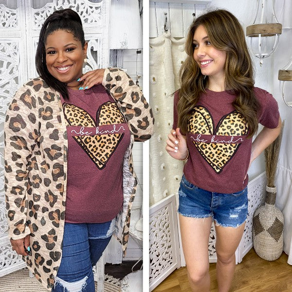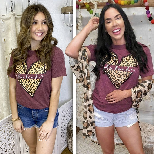Design features the top and bottom sections of a heart printed in leopard design, with be kind printed in the center with white ink.