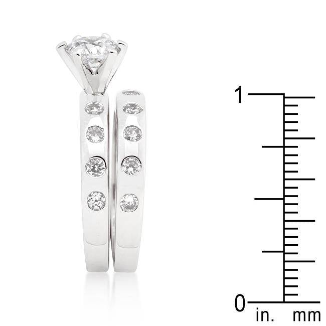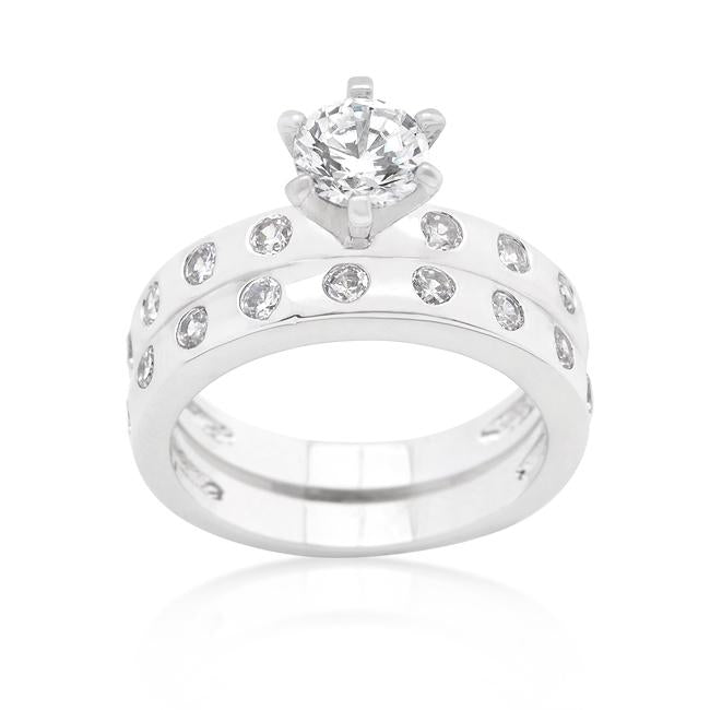 A round cut stone and bezeled accents create a unique bridal ring that will last for years to come. Our genuine rhodium finish is achieved using an electroplating process that coats the item with heavy layers of rhodium a close cousin to platinum which gives our jewelry a platinum luster.