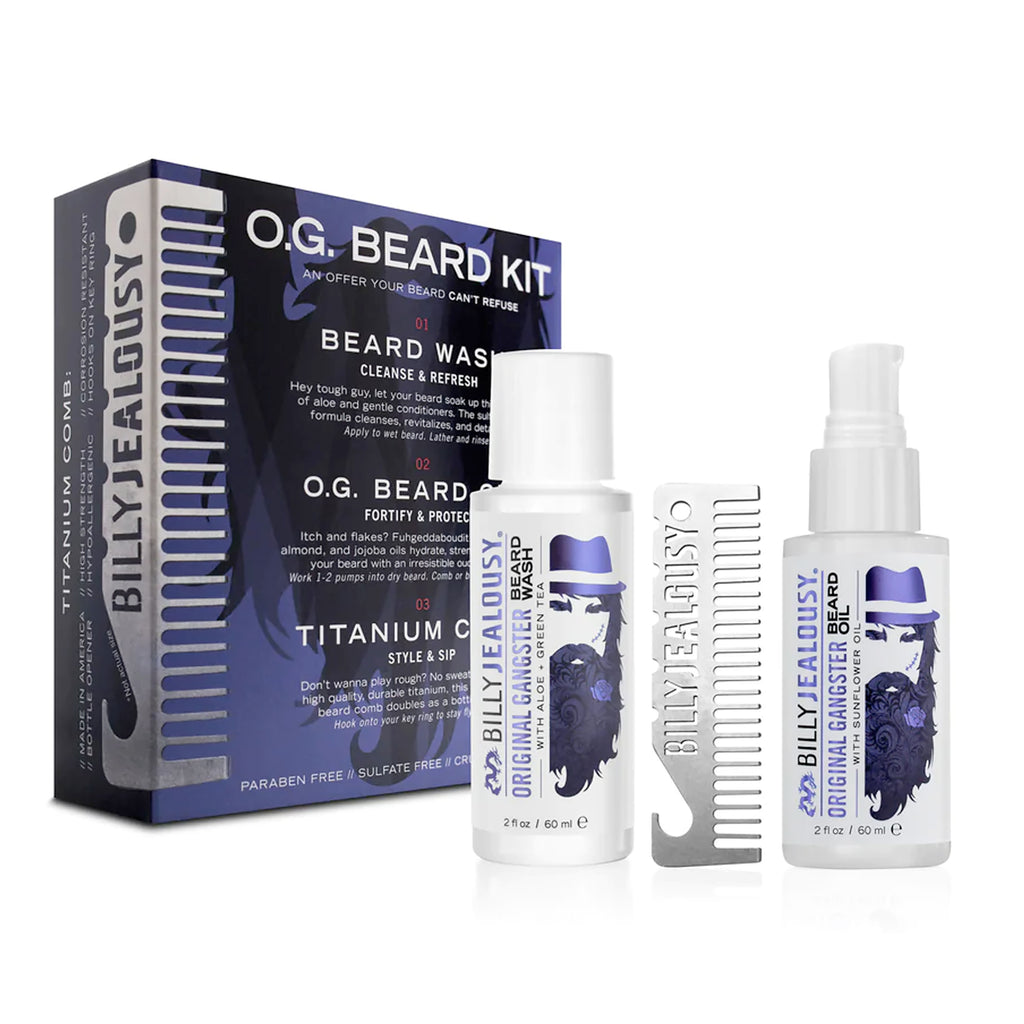 Kit includes 2 oz Original Gangster Beard Wash, 2 oz Original Gangster Beard Oil, Titanium Comb