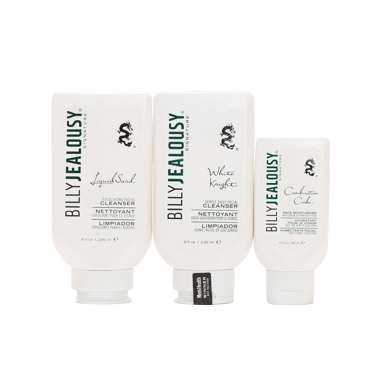 BILLY JEALOUSY FULL SIZE LIQUID SAND EXFOLIATOR, WHITE KNIGHT CLEANSER, COMBINATION CODE MOISTURIZER, TRIO