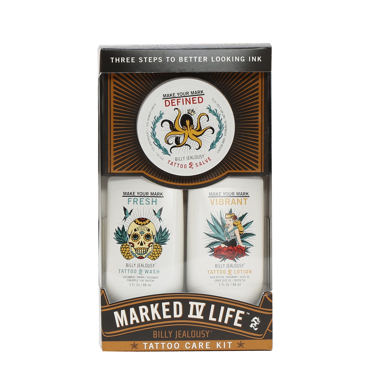 IS YOUR PIN-UP BABE LOOKING A LITTLE PLAYED OUT? TATTOOS BEGGING FOR SOME TLC? TREAT YOUR OLD AND NEW INK RIGHT WITH BILLY JEALOUSY’S MARKED IV LIFE TATTOO CARE KIT. THIS KIT COMES WITH TRAVEL-FRIENDLY SIZES OF TATTOO WASH, TATTOO LOTION, AND TATTOO SALVE, THE DAILY TATTOO CARE ITEMS YOU NEED TO REVIVE THE COLOR AND CLARITY OF OLD TATTOOS AND HELP NEW TATTOOS HEAL. FORMULATED WITH GENTLE AND NATURAL INGREDIENTS, DERMATOLOGIST-TESTED, AND CRUELTY-FREE. KEY BENEFITS: PARABEN FREE, CRUELTY FREE, MADE IN AMERICA. ENHANCES TATTOO’S COLOR AND VIBRANCY, INCREASES TATTOO CLARITY, DEEPLY NOURISHES SKIN, MOISTURIZES WITHOUT CLOGGING PORES, NATURALLY ANTI-BACTERIAL AND ANTI-INFLAMMATORY, PROMOTES HEALING