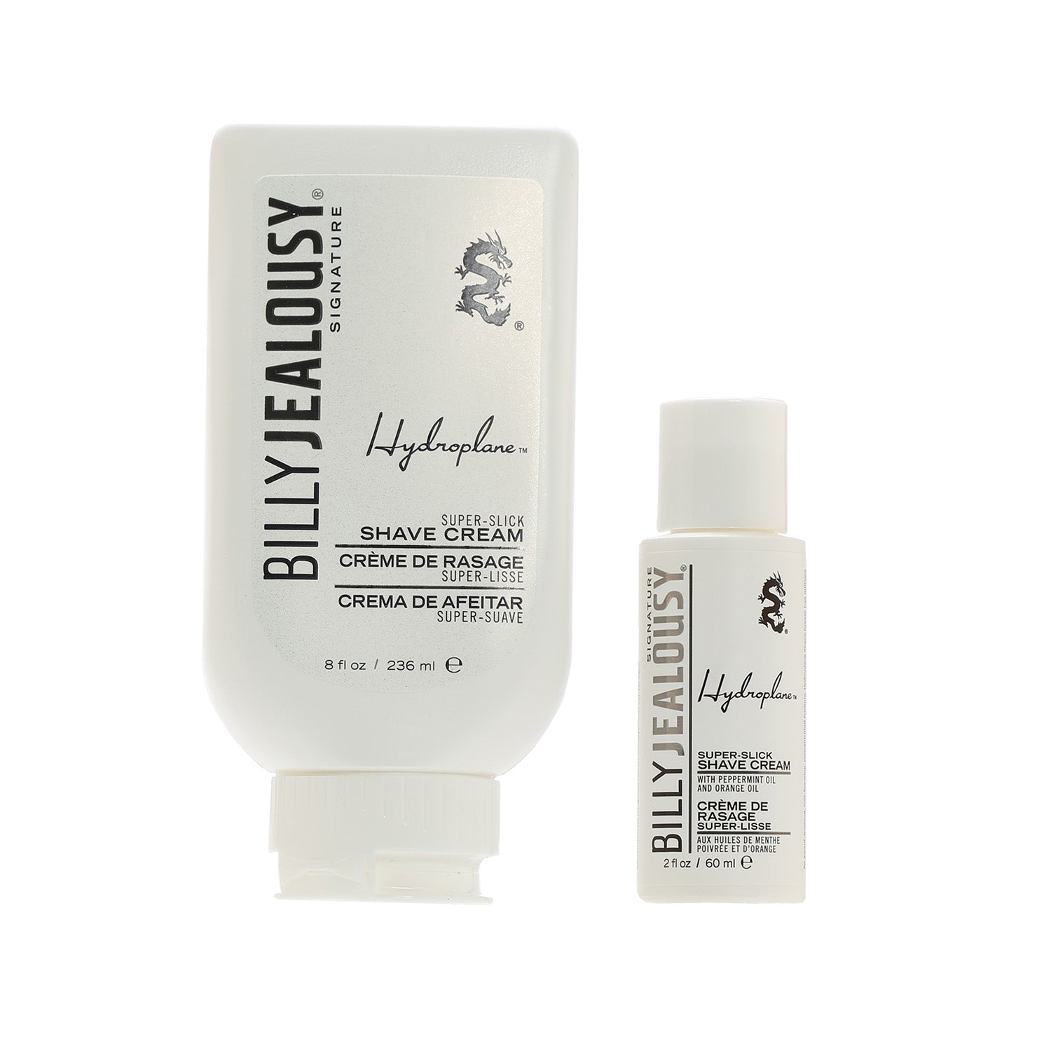 BILLY JEALOUSY SHAVE DUO: HYDROPLANE SUPERSLICK SHAVE CREAM 8 OZ & 2 OZ FOR TRAVEL!