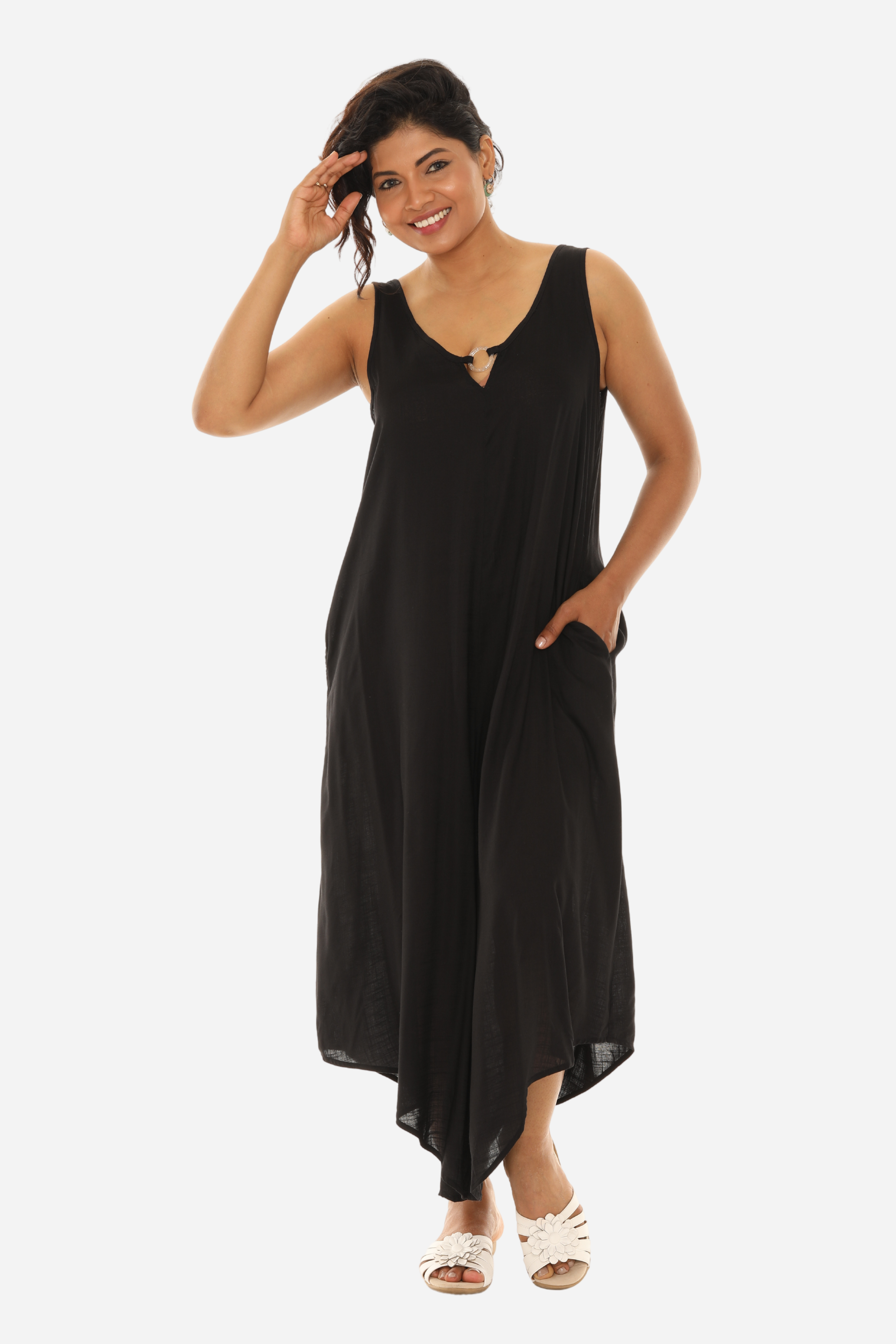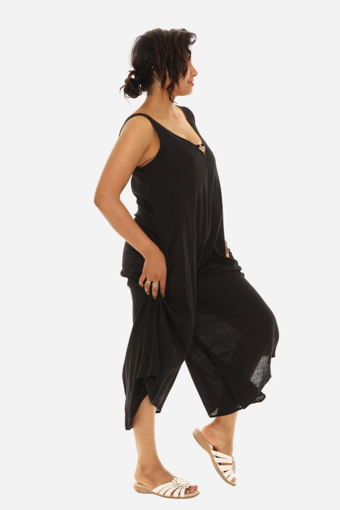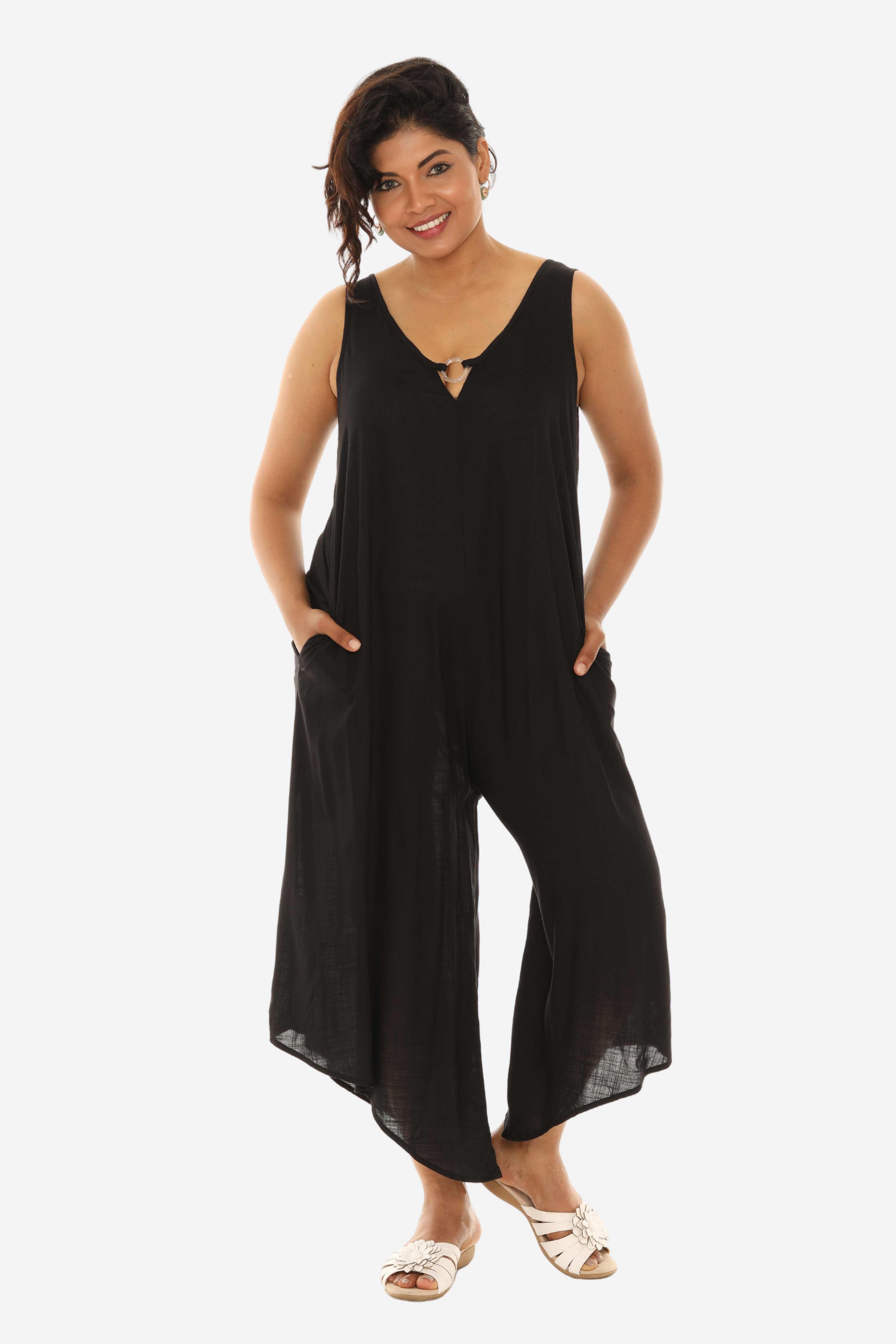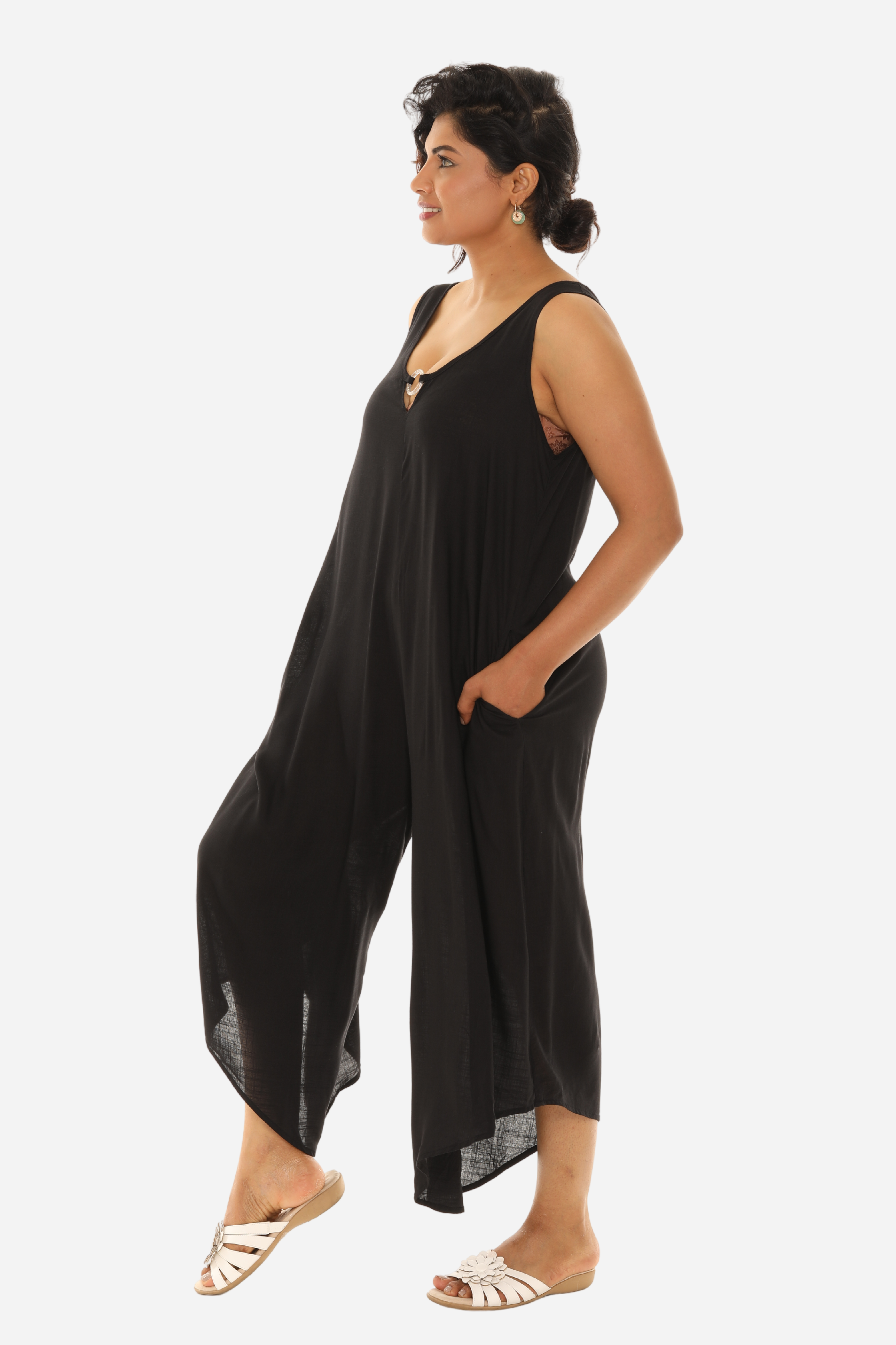 Black Sleeveless Circle-Accent Capri-Cut Jumpsuit