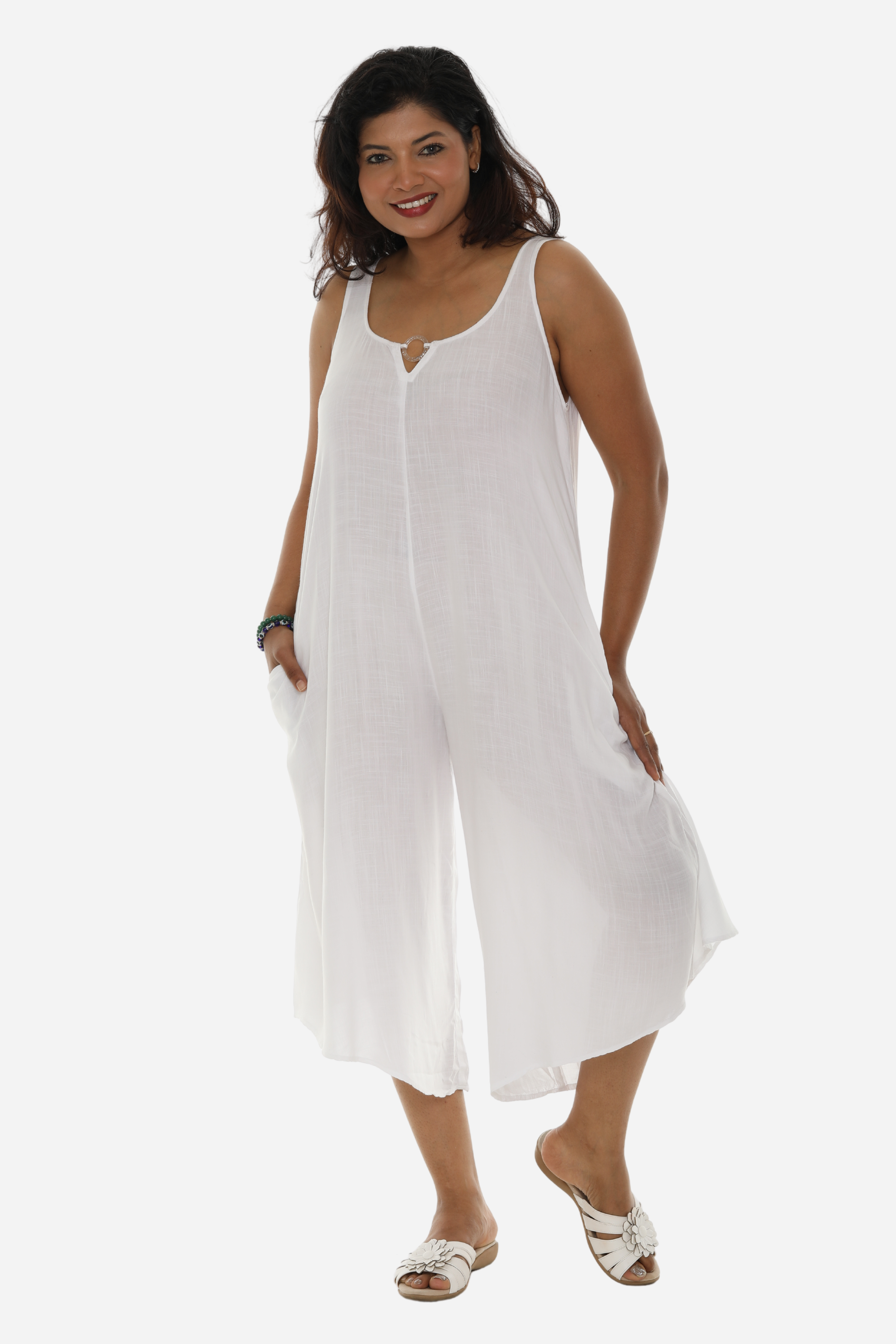 A breezy, carpi-cut jumpsuit featuring a circle accent, pockets and a lightweight construction.
